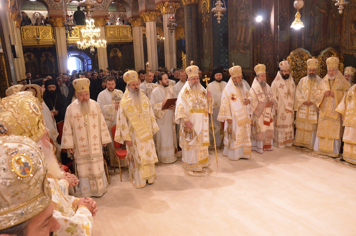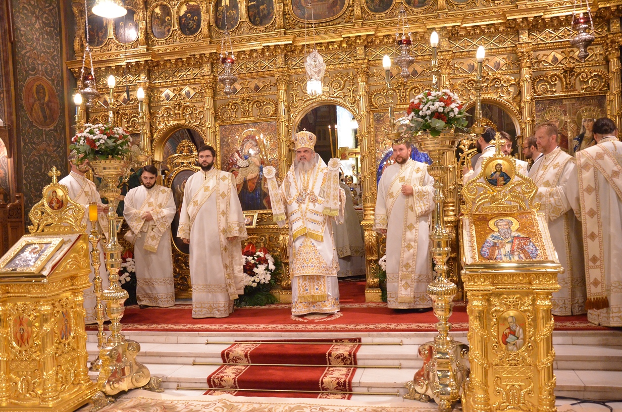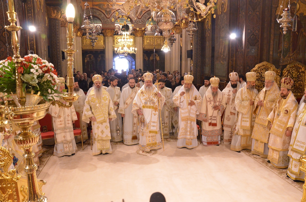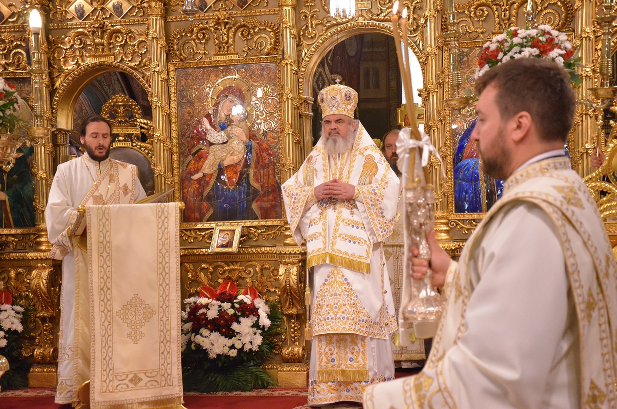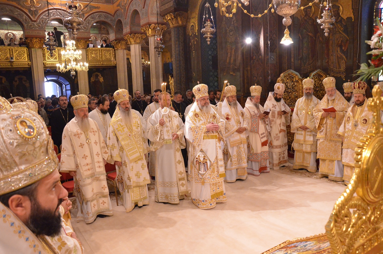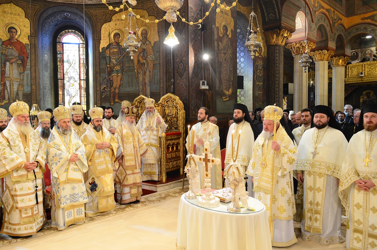 Astăzi, la ceas aniversar, în Catedrala Patriarhală, Sfânta Liturghie a fost oficiată de Preafericitul Părinte Daniel, Patriarhul României. Din soborul slujitor au făcut parte şi următorii ierarhi, membrii ai Sfântului Sinod al Bisericii Ortodoxe Române: Înaltpreasfințitul Teofan, Mitropolitul Moldovei și Bucovinei, Înaltpreasfințitul Laurenţiu, Mitropolitul Ardealului, Înaltpreasfințitul Andrei, Mitropolitul Clujului, Maramureșului și Sălajului, Înaltpreasfințitul Irineu, Mitropolitul Olteniei, Înaltpreasfințitul Petru, Mitropolitul Basarabiei și Exarhul Plaiurilor, Înaltpreasfințitul Serafim, Mitropolitul Ortodox Român al Germaniei, Europei Centrale și de Nord, Înaltpreasfințitul Iosif, Mitropolitul Ortodox Român al Europei Occidentale și Meridionale, Înaltpreasfințitul Irineu, Arhiepiscopul Alba Iuliei, Înaltpreasfințitul Ciprian, Arhiepiscopul Buzăului şi Vrancei, Înaltpreasfințitul Calinic, Arhiepiscopul Argeșului și Muscelului, Înaltpreasfințitul Casian, Arhiepiscopul Dunării de Jos, Înaltpreasfințitul Timotei, Arhiepiscopul Aradului, Înaltpreasfinţitul Ioan, Episcopul Covasnei şi Harghitei, Preasfinţitul Corneliu, Episcopul Huşilor, Preasfințitul Lucian, Episcopul Caransebeșului, Preasfințitul Sofronie, Episcopul Oradiei, Preasfințitul Nicodim, Episcopul Severinului și Strehaiei, Preasfințitul Galaction, Episcopul Alexandriei şi Teleormanului, Preasfințitul Ambrozie, Episcopul Giurgiului, Preasfințitul Sebastian, Episcopul Slatinei şi Romanaților, Preasfințitul Visarion, Episcopul Tulcii, Preasfințitul Petroniu, Episcopul Sălajului, Preasfințitul Gurie, Episcopul Devei și Hunedoarei, Preasfințitul Daniil, Episcopul locțiitor al Daciei Felix, Preasfințitul Siluan, Episcopul Ortodox Român din Ungaria, Preasfințitul Siluan, Episcopul Ortodox Român al Italiei, Preasfințitul Timotei, Episcopul Ortodox Român al Spaniei și Portugaliei, Preasfințitul Macarie, Episcopul Ortodox Român al Europei de Nord, Preasfințitul Mihail, Episcopul Ortodox Român al Australiei și Noii Zeelande, Preasfințitul Varlaam Ploieşteanul, Episcop-vicar patriarhal, Preasfințitul Ieronim Sinaitul, Episcop-vicar patriarhal, Preasfințitul Andrei Făgărăşanul, Episcop-vicar al Arhiepiscopiei Sibiului, Preasfințitul Antonie de Orhei, Episcop-vicar al Arhiepiscopiei Chișinăului, Preasfințitul Sofian Brașoveanul, Episcop-vicar al Arhiepiscopiei Ortodoxe Române a Germaniei, Austriei și Luxemburgului, Preasfinţitul Emilian Lovişteanul, Episcop vicar al Arhiepiscopiei Râmnicului, Preasfințitul Iustin Sigheteanul, Arhiereu-vicar al Episcopiei Maramureşului şi Sătmarului, înconjurați de un sobor de preoți și diaconi.