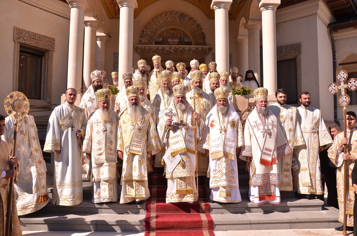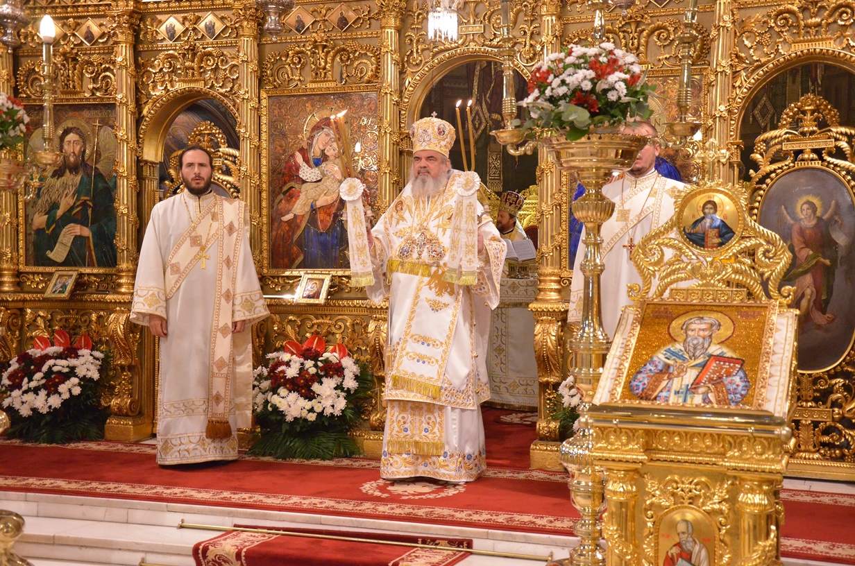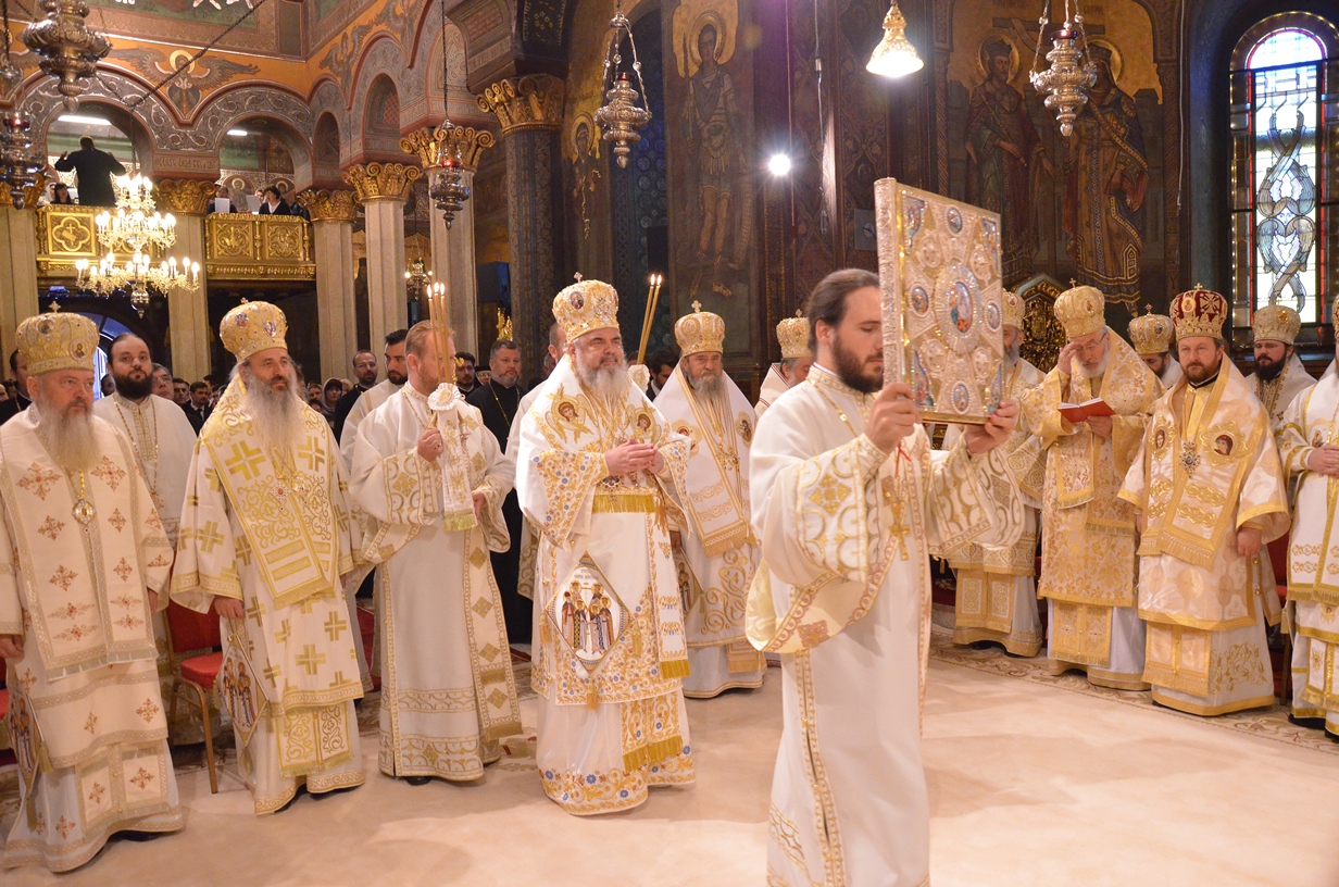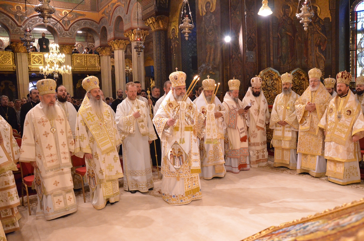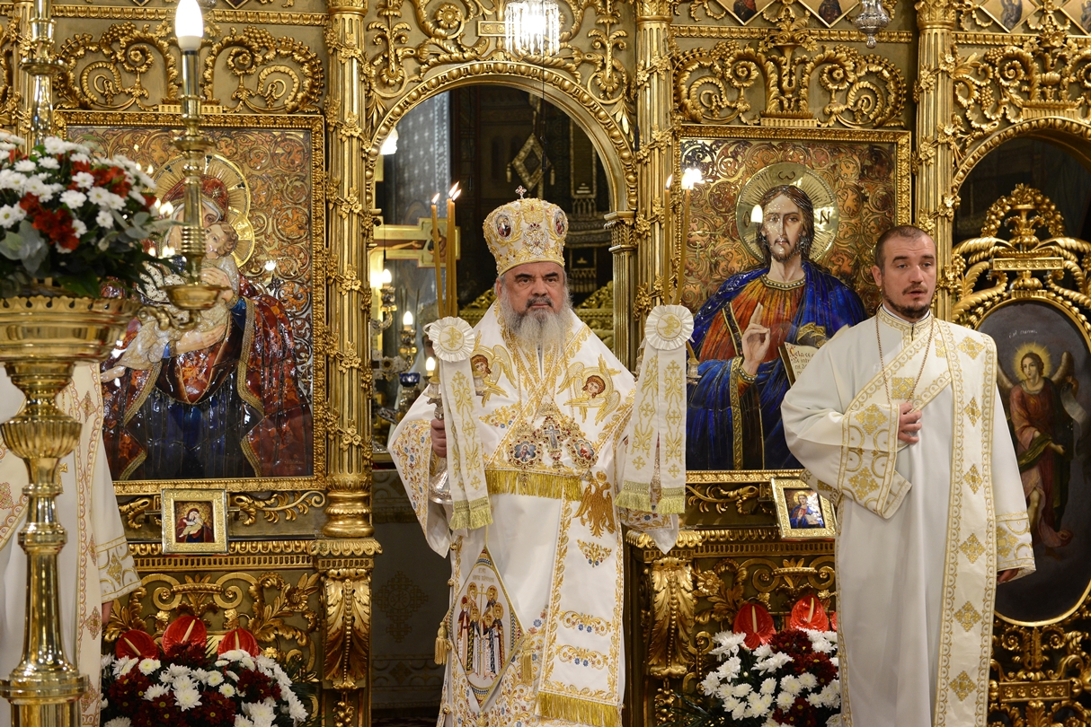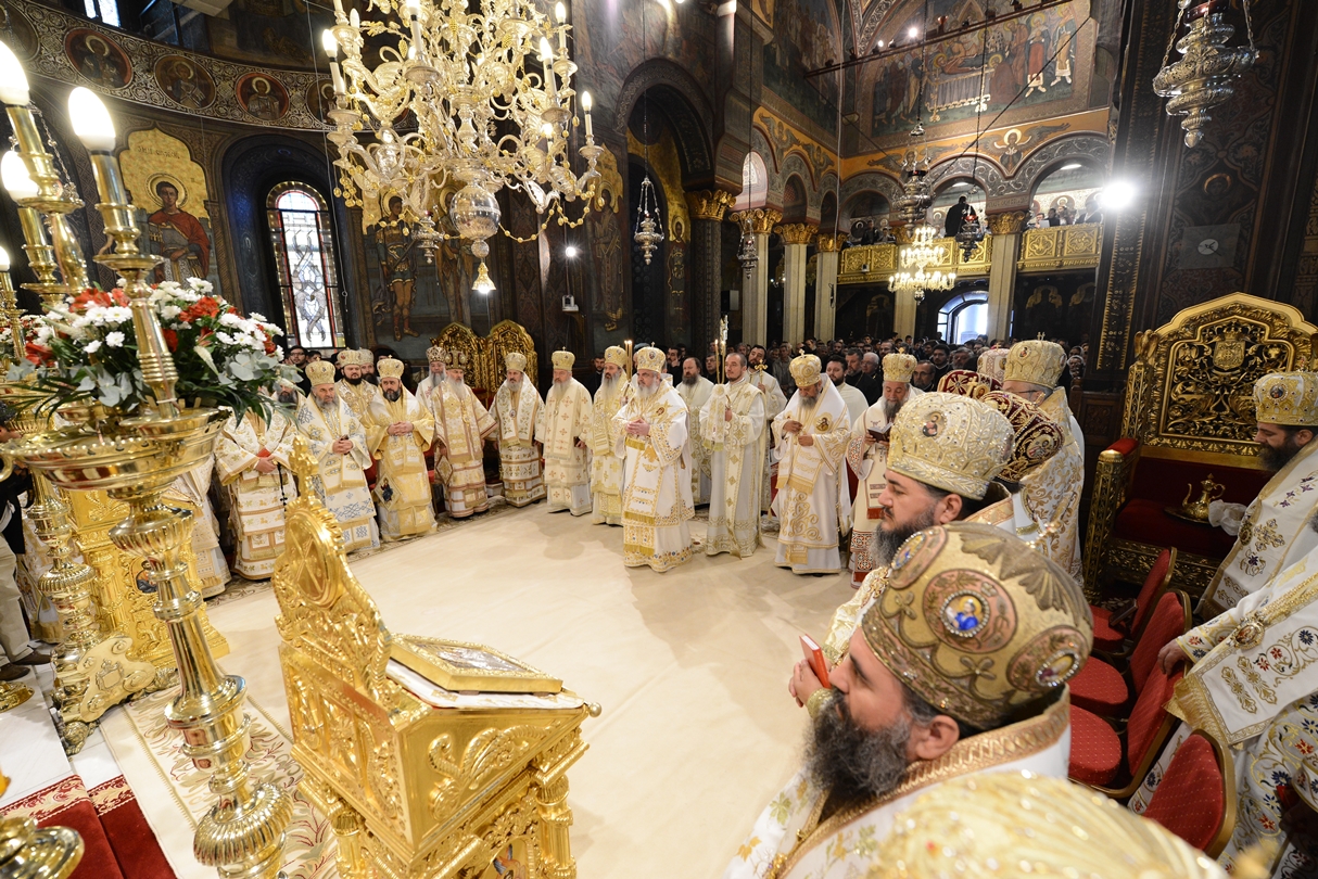 Astăzi, la ceas aniversar, în Catedrala Patriarhală, Sfânta Liturghie a fost oficiată de Preafericitul Părinte Daniel, Patriarhul României. Din soborul slujitor au făcut parte şi următorii ierarhi, membrii ai Sfântului Sinod al Bisericii Ortodoxe Române: Înaltpreasfințitul Teofan, Mitropolitul Moldovei și Bucovinei, Înaltpreasfințitul Laurenţiu, Mitropolitul Ardealului, Înaltpreasfințitul Andrei, Mitropolitul Clujului, Maramureșului și Sălajului, Înaltpreasfințitul Irineu, Mitropolitul Olteniei, Înaltpreasfințitul Petru, Mitropolitul Basarabiei și Exarhul Plaiurilor, Înaltpreasfințitul Serafim, Mitropolitul Ortodox Român al Germaniei, Europei Centrale și de Nord, Înaltpreasfințitul Iosif, Mitropolitul Ortodox Român al Europei Occidentale și Meridionale, Înaltpreasfințitul Irineu, Arhiepiscopul Alba Iuliei, Înaltpreasfințitul Ciprian, Arhiepiscopul Buzăului şi Vrancei, Înaltpreasfințitul Calinic, Arhiepiscopul Argeșului și Muscelului, Înaltpreasfințitul Casian, Arhiepiscopul Dunării de Jos, Înaltpreasfințitul Timotei, Arhiepiscopul Aradului, Înaltpreasfinţitul Ioan, Episcopul Covasnei şi Harghitei, Preasfinţitul Corneliu, Episcopul Huşilor, Preasfințitul Lucian, Episcopul Caransebeșului, Preasfințitul Sofronie, Episcopul Oradiei, Preasfințitul Nicodim, Episcopul Severinului și Strehaiei, Preasfințitul Galaction, Episcopul Alexandriei şi Teleormanului, Preasfințitul Ambrozie, Episcopul Giurgiului, Preasfințitul Sebastian, Episcopul Slatinei şi Romanaților, Preasfințitul Visarion, Episcopul Tulcii, Preasfințitul Petroniu, Episcopul Sălajului, Preasfințitul Gurie, Episcopul Devei și Hunedoarei, Preasfințitul Daniil, Episcopul locțiitor al Daciei Felix, Preasfințitul Siluan, Episcopul Ortodox Român din Ungaria, Preasfințitul Siluan, Episcopul Ortodox Român al Italiei, Preasfințitul Timotei, Episcopul Ortodox Român al Spaniei și Portugaliei, Preasfințitul Macarie, Episcopul Ortodox Român al Europei de Nord, Preasfințitul Mihail, Episcopul Ortodox Român al Australiei și Noii Zeelande, Preasfințitul Varlaam Ploieşteanul, Episcop-vicar patriarhal, Preasfințitul Ieronim Sinaitul, Episcop-vicar patriarhal, Preasfințitul Andrei Făgărăşanul, Episcop-vicar al Arhiepiscopiei Sibiului, Preasfințitul Antonie de Orhei, Episcop-vicar al Arhiepiscopiei Chișinăului, Preasfințitul Sofian Brașoveanul, Episcop-vicar al Arhiepiscopiei Ortodoxe Române a Germaniei, Austriei și Luxemburgului, Preasfinţitul Emilian Lovişteanul, Episcop vicar al Arhiepiscopiei Râmnicului, Preasfințitul Iustin Sigheteanul, Arhiereu-vicar al Episcopiei Maramureşului şi Sătmarului, înconjurați de un sobor de preoți și diaconi.
