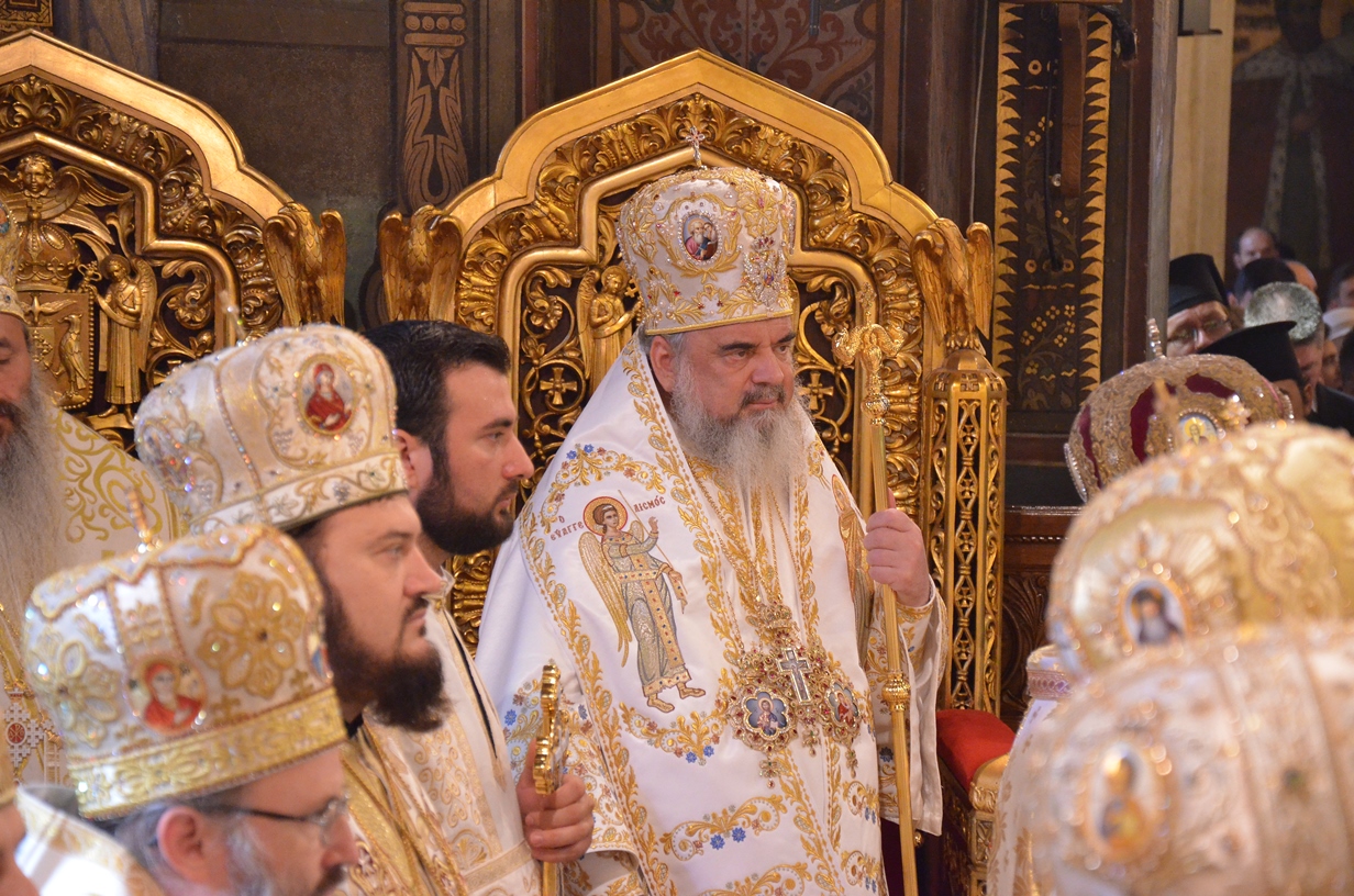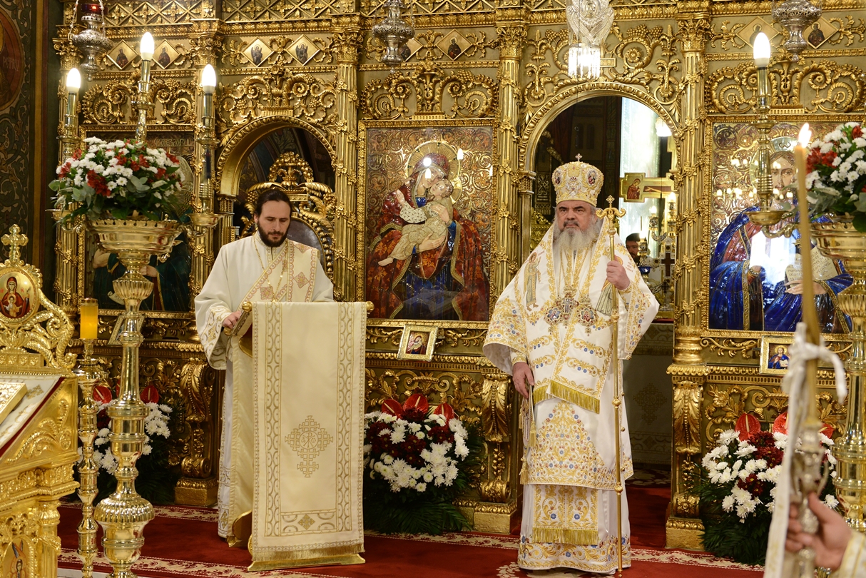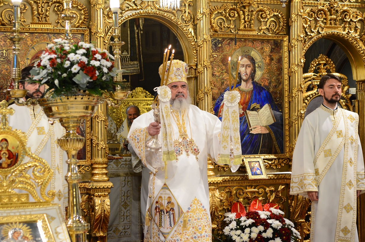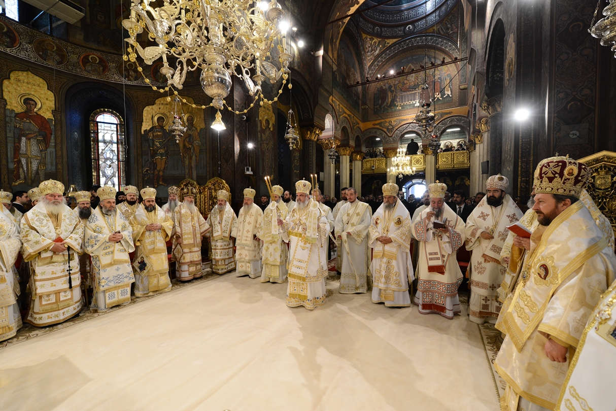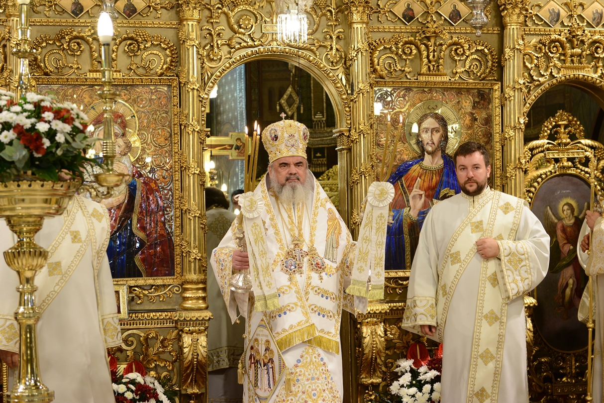 Astăzi, la ceas aniversar, în Catedrala Patriarhală, Sfânta Liturghie a fost oficiată de Preafericitul Părinte Daniel, Patriarhul României. Din soborul slujitor au făcut parte şi următorii ierarhi, membrii ai Sfântului Sinod al Bisericii Ortodoxe Române: Înaltpreasfințitul Teofan, Mitropolitul Moldovei și Bucovinei, Înaltpreasfințitul Laurenţiu, Mitropolitul Ardealului, Înaltpreasfințitul Andrei, Mitropolitul Clujului, Maramureșului și Sălajului, Înaltpreasfințitul Irineu, Mitropolitul Olteniei, Înaltpreasfințitul Petru, Mitropolitul Basarabiei și Exarhul Plaiurilor, Înaltpreasfințitul Serafim, Mitropolitul Ortodox Român al Germaniei, Europei Centrale și de Nord, Înaltpreasfințitul Iosif, Mitropolitul Ortodox Român al Europei Occidentale și Meridionale, Înaltpreasfințitul Irineu, Arhiepiscopul Alba Iuliei, Înaltpreasfințitul Ciprian, Arhiepiscopul Buzăului şi Vrancei, Înaltpreasfințitul Calinic, Arhiepiscopul Argeșului și Muscelului, Înaltpreasfințitul Casian, Arhiepiscopul Dunării de Jos, Înaltpreasfințitul Timotei, Arhiepiscopul Aradului, Înaltpreasfinţitul Ioan, Episcopul Covasnei şi Harghitei, Preasfinţitul Corneliu, Episcopul Huşilor, Preasfințitul Lucian, Episcopul Caransebeșului, Preasfințitul Sofronie, Episcopul Oradiei, Preasfințitul Nicodim, Episcopul Severinului și Strehaiei, Preasfințitul Galaction, Episcopul Alexandriei şi Teleormanului, Preasfințitul Ambrozie, Episcopul Giurgiului, Preasfințitul Sebastian, Episcopul Slatinei şi Romanaților, Preasfințitul Visarion, Episcopul Tulcii, Preasfințitul Petroniu, Episcopul Sălajului, Preasfințitul Gurie, Episcopul Devei și Hunedoarei, Preasfințitul Daniil, Episcopul locțiitor al Daciei Felix, Preasfințitul Siluan, Episcopul Ortodox Român din Ungaria, Preasfințitul Siluan, Episcopul Ortodox Român al Italiei, Preasfințitul Timotei, Episcopul Ortodox Român al Spaniei și Portugaliei, Preasfințitul Macarie, Episcopul Ortodox Român al Europei de Nord, Preasfințitul Mihail, Episcopul Ortodox Român al Australiei și Noii Zeelande, Preasfințitul Varlaam Ploieşteanul, Episcop-vicar patriarhal, Preasfințitul Ieronim Sinaitul, Episcop-vicar patriarhal, Preasfințitul Andrei Făgărăşanul, Episcop-vicar al Arhiepiscopiei Sibiului, Preasfințitul Antonie de Orhei, Episcop-vicar al Arhiepiscopiei Chișinăului, Preasfințitul Sofian Brașoveanul, Episcop-vicar al Arhiepiscopiei Ortodoxe Române a Germaniei, Austriei și Luxemburgului, Preasfinţitul Emilian Lovişteanul, Episcop vicar al Arhiepiscopiei Râmnicului, Preasfințitul Iustin Sigheteanul, Arhiereu-vicar al Episcopiei Maramureşului şi Sătmarului, înconjurați de un sobor de preoți și diaconi.