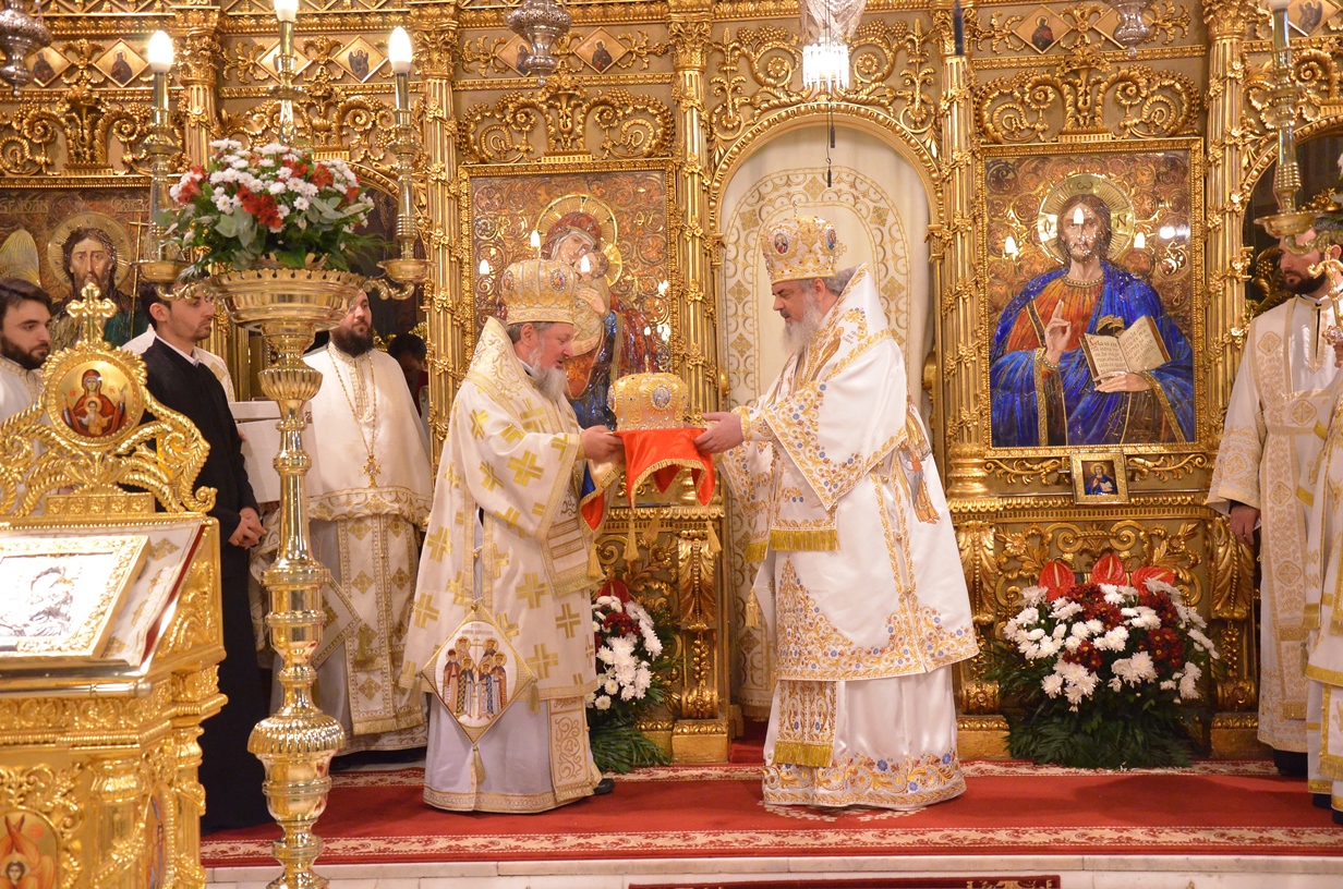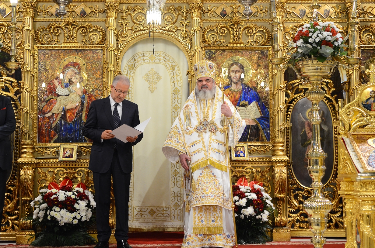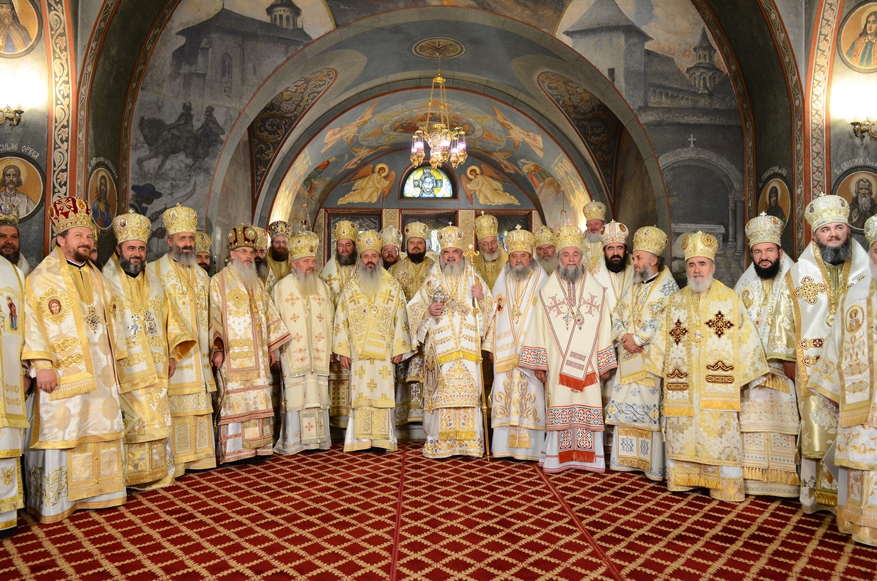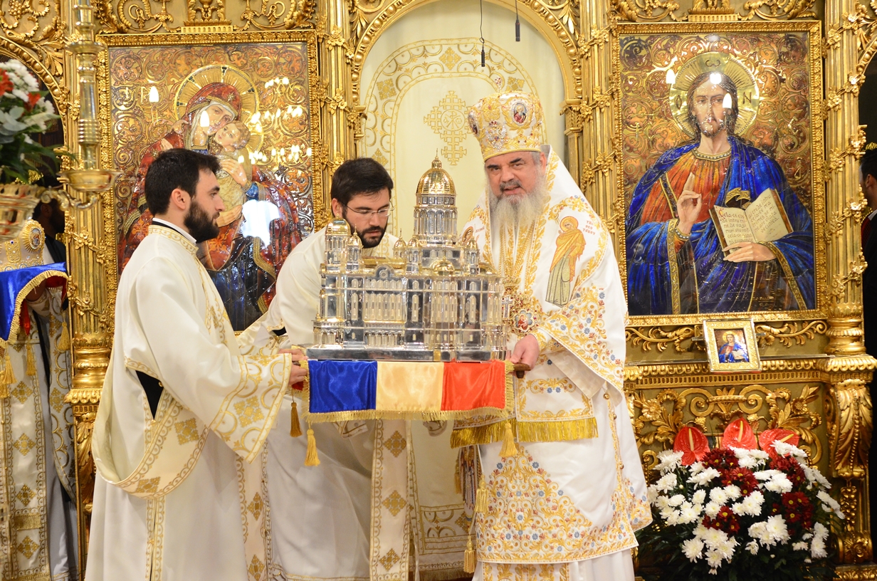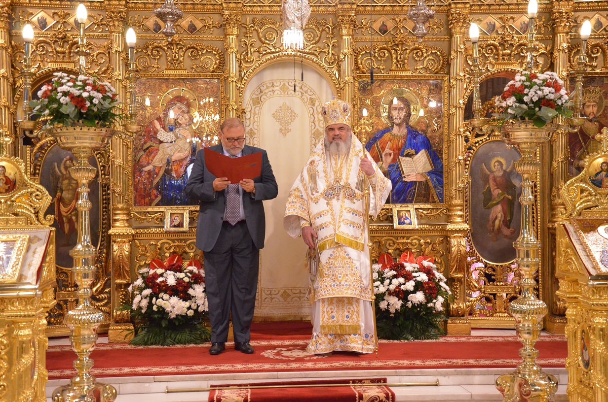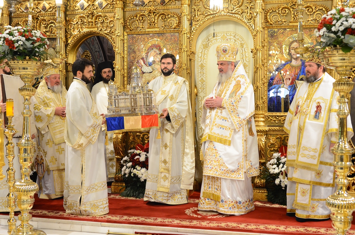 Astăzi, la ceas aniversar, în Catedrala Patriarhală, Sfânta Liturghie a fost oficiată de Preafericitul Părinte Daniel, Patriarhul României. Din soborul slujitor au făcut parte şi următorii ierarhi, membrii ai Sfântului Sinod al Bisericii Ortodoxe Române: Înaltpreasfințitul Teofan, Mitropolitul Moldovei și Bucovinei, Înaltpreasfințitul Laurenţiu, Mitropolitul Ardealului, Înaltpreasfințitul Andrei, Mitropolitul Clujului, Maramureșului și Sălajului, Înaltpreasfințitul Irineu, Mitropolitul Olteniei, Înaltpreasfințitul Petru, Mitropolitul Basarabiei și Exarhul Plaiurilor, Înaltpreasfințitul Serafim, Mitropolitul Ortodox Român al Germaniei, Europei Centrale și de Nord, Înaltpreasfințitul Iosif, Mitropolitul Ortodox Român al Europei Occidentale și Meridionale, Înaltpreasfințitul Irineu, Arhiepiscopul Alba Iuliei, Înaltpreasfințitul Ciprian, Arhiepiscopul Buzăului şi Vrancei, Înaltpreasfințitul Calinic, Arhiepiscopul Argeșului și Muscelului, Înaltpreasfințitul Casian, Arhiepiscopul Dunării de Jos, Înaltpreasfințitul Timotei, Arhiepiscopul Aradului, Înaltpreasfinţitul Ioan, Episcopul Covasnei şi Harghitei, Preasfinţitul Corneliu, Episcopul Huşilor, Preasfințitul Lucian, Episcopul Caransebeșului, Preasfințitul Sofronie, Episcopul Oradiei, Preasfințitul Nicodim, Episcopul Severinului și Strehaiei, Preasfințitul Galaction, Episcopul Alexandriei şi Teleormanului, Preasfințitul Ambrozie, Episcopul Giurgiului, Preasfințitul Sebastian, Episcopul Slatinei şi Romanaților, Preasfințitul Visarion, Episcopul Tulcii, Preasfințitul Petroniu, Episcopul Sălajului, Preasfințitul Gurie, Episcopul Devei și Hunedoarei, Preasfințitul Daniil, Episcopul locțiitor al Daciei Felix, Preasfințitul Siluan, Episcopul Ortodox Român din Ungaria, Preasfințitul Siluan, Episcopul Ortodox Român al Italiei, Preasfințitul Timotei, Episcopul Ortodox Român al Spaniei și Portugaliei, Preasfințitul Macarie, Episcopul Ortodox Român al Europei de Nord, Preasfințitul Mihail, Episcopul Ortodox Român al Australiei și Noii Zeelande, Preasfințitul Varlaam Ploieşteanul, Episcop-vicar patriarhal, Preasfințitul Ieronim Sinaitul, Episcop-vicar patriarhal, Preasfințitul Andrei Făgărăşanul, Episcop-vicar al Arhiepiscopiei Sibiului, Preasfințitul Antonie de Orhei, Episcop-vicar al Arhiepiscopiei Chișinăului, Preasfințitul Sofian Brașoveanul, Episcop-vicar al Arhiepiscopiei Ortodoxe Române a Germaniei, Austriei și Luxemburgului, Preasfinţitul Emilian Lovişteanul, Episcop vicar al Arhiepiscopiei Râmnicului, Preasfințitul Iustin Sigheteanul, Arhiereu-vicar al Episcopiei Maramureşului şi Sătmarului, înconjurați de un sobor de preoți și diaconi.