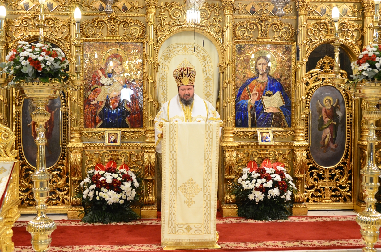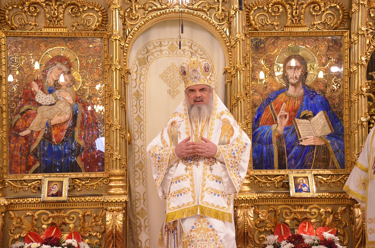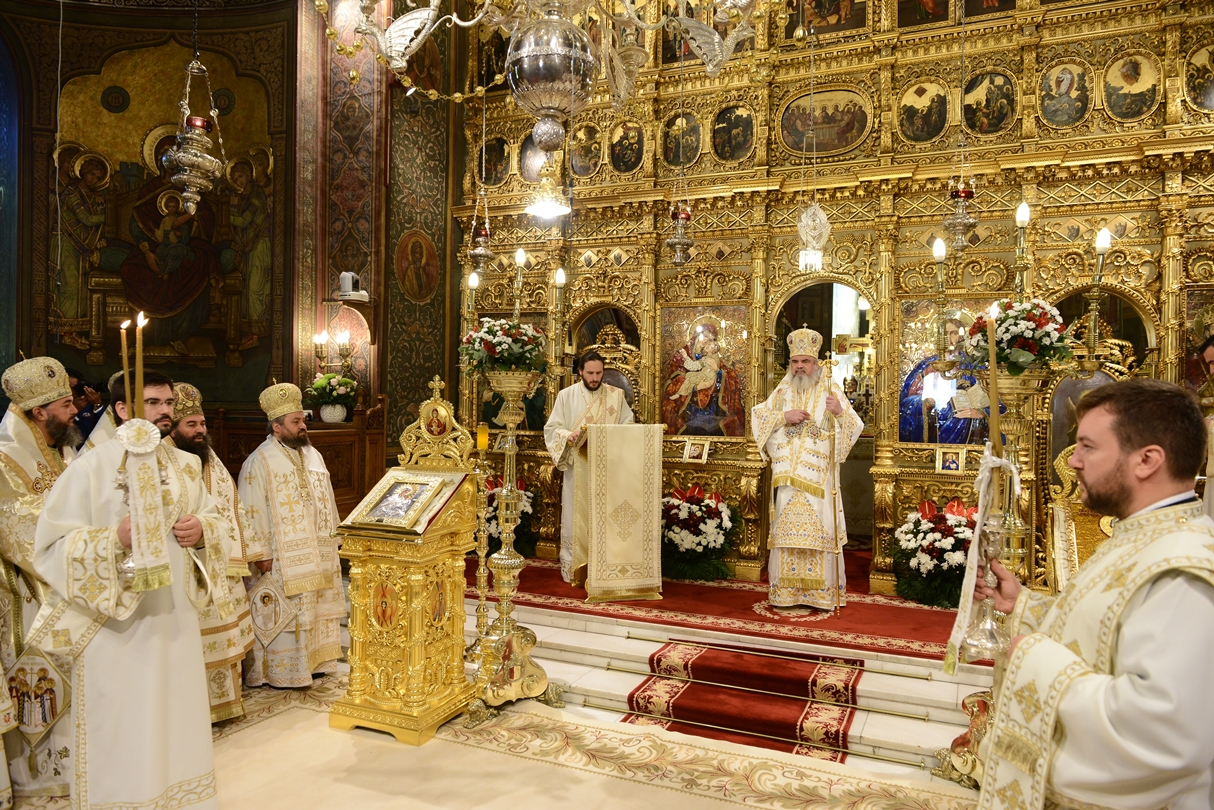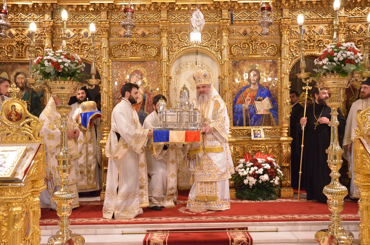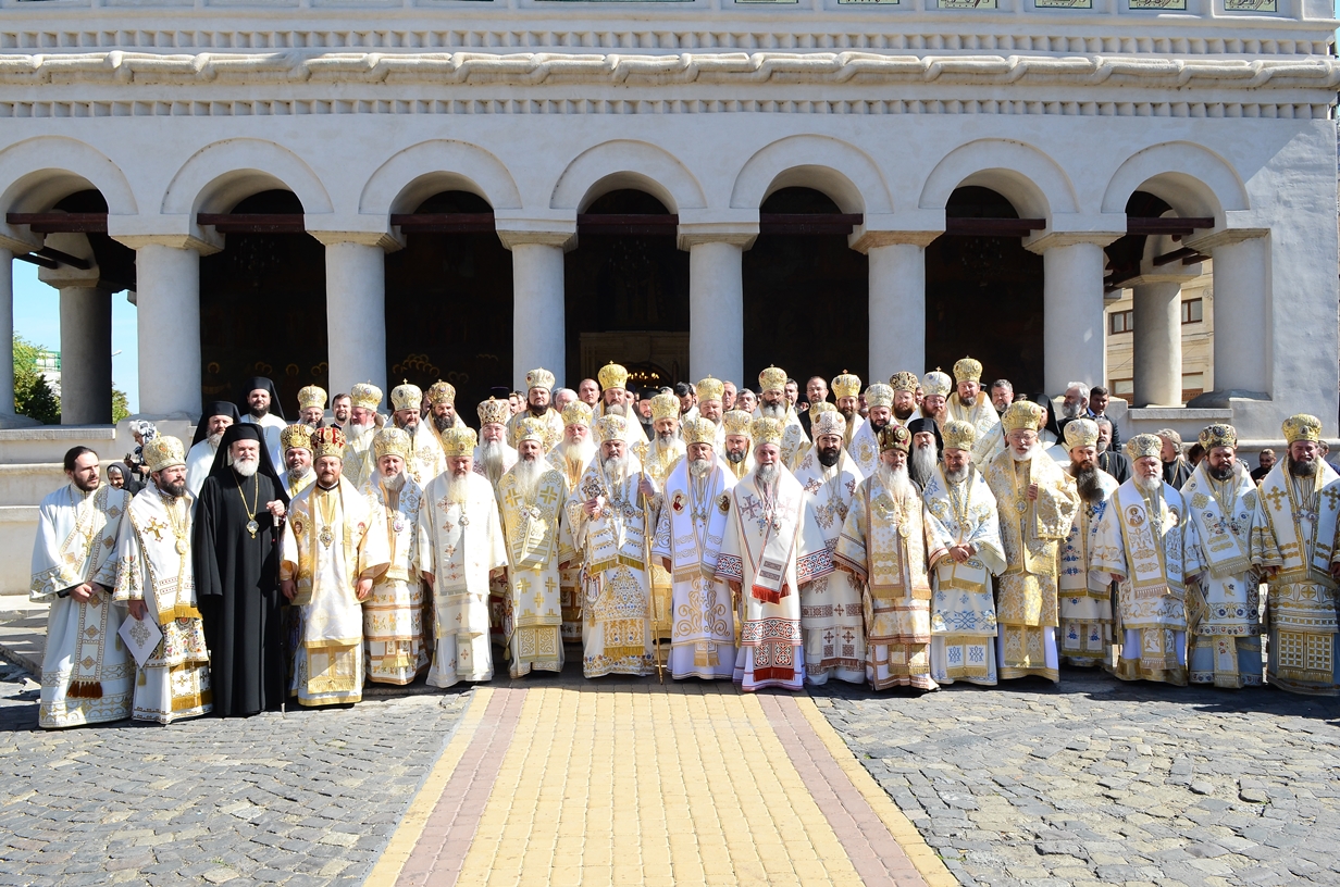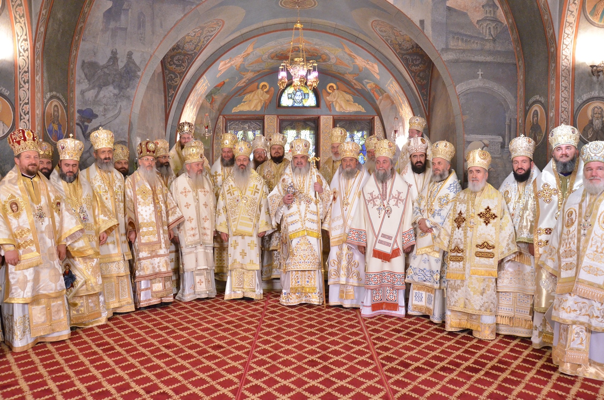 Astăzi, la ceas aniversar, în Catedrala Patriarhală, Sfânta Liturghie a fost oficiată de Preafericitul Părinte Daniel, Patriarhul României. Din soborul slujitor au făcut parte şi următorii ierarhi, membrii ai Sfântului Sinod al Bisericii Ortodoxe Române: Înaltpreasfințitul Teofan, Mitropolitul Moldovei și Bucovinei, Înaltpreasfințitul Laurenţiu, Mitropolitul Ardealului, Înaltpreasfințitul Andrei, Mitropolitul Clujului, Maramureșului și Sălajului, Înaltpreasfințitul Irineu, Mitropolitul Olteniei, Înaltpreasfințitul Petru, Mitropolitul Basarabiei și Exarhul Plaiurilor, Înaltpreasfințitul Serafim, Mitropolitul Ortodox Român al Germaniei, Europei Centrale și de Nord, Înaltpreasfințitul Iosif, Mitropolitul Ortodox Român al Europei Occidentale și Meridionale, Înaltpreasfințitul Irineu, Arhiepiscopul Alba Iuliei, Înaltpreasfințitul Ciprian, Arhiepiscopul Buzăului şi Vrancei, Înaltpreasfințitul Calinic, Arhiepiscopul Argeșului și Muscelului, Înaltpreasfințitul Casian, Arhiepiscopul Dunării de Jos, Înaltpreasfințitul Timotei, Arhiepiscopul Aradului, Înaltpreasfinţitul Ioan, Episcopul Covasnei şi Harghitei, Preasfinţitul Corneliu, Episcopul Huşilor, Preasfințitul Lucian, Episcopul Caransebeșului, Preasfințitul Sofronie, Episcopul Oradiei, Preasfințitul Nicodim, Episcopul Severinului și Strehaiei, Preasfințitul Galaction, Episcopul Alexandriei şi Teleormanului, Preasfințitul Ambrozie, Episcopul Giurgiului, Preasfințitul Sebastian, Episcopul Slatinei şi Romanaților, Preasfințitul Visarion, Episcopul Tulcii, Preasfințitul Petroniu, Episcopul Sălajului, Preasfințitul Gurie, Episcopul Devei și Hunedoarei, Preasfințitul Daniil, Episcopul locțiitor al Daciei Felix, Preasfințitul Siluan, Episcopul Ortodox Român din Ungaria, Preasfințitul Siluan, Episcopul Ortodox Român al Italiei, Preasfințitul Timotei, Episcopul Ortodox Român al Spaniei și Portugaliei, Preasfințitul Macarie, Episcopul Ortodox Român al Europei de Nord, Preasfințitul Mihail, Episcopul Ortodox Român al Australiei și Noii Zeelande, Preasfințitul Varlaam Ploieşteanul, Episcop-vicar patriarhal, Preasfințitul Ieronim Sinaitul, Episcop-vicar patriarhal, Preasfințitul Andrei Făgărăşanul, Episcop-vicar al Arhiepiscopiei Sibiului, Preasfințitul Antonie de Orhei, Episcop-vicar al Arhiepiscopiei Chișinăului, Preasfințitul Sofian Brașoveanul, Episcop-vicar al Arhiepiscopiei Ortodoxe Române a Germaniei, Austriei și Luxemburgului, Preasfinţitul Emilian Lovişteanul, Episcop vicar al Arhiepiscopiei Râmnicului, Preasfințitul Iustin Sigheteanul, Arhiereu-vicar al Episcopiei Maramureşului şi Sătmarului, înconjurați de un sobor de preoți și diaconi.