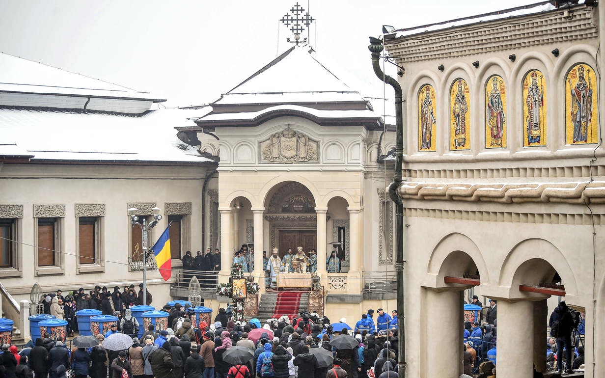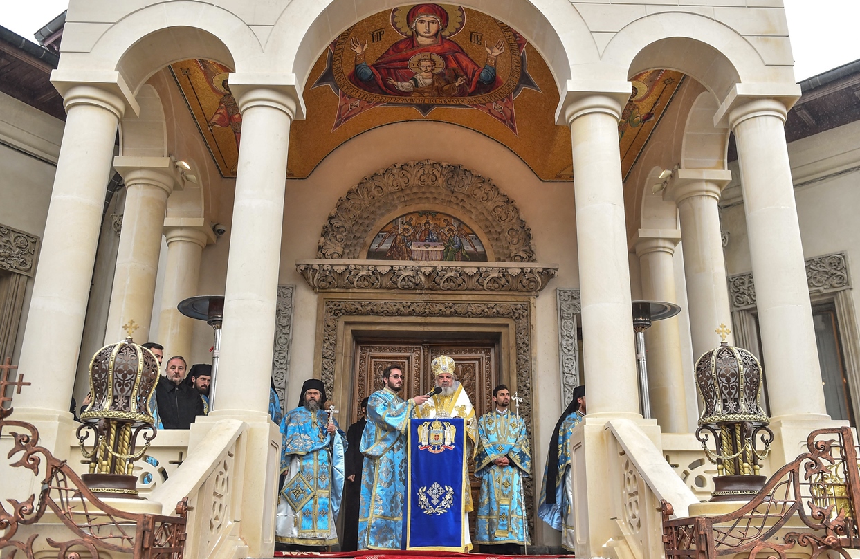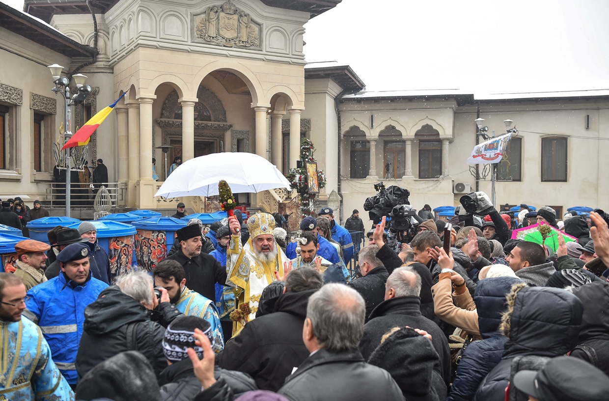 După rugăciunea Amvonului soborul slujitor a ieşit din Catedrala Patriarhală, iar Întâistătătorul Bisericii Ortodoxe Române, Preafericitul Părinte Daniel, a oficiat Sfinţirea cea Mare a Apei (Agheasma mare), în faţa Reşedinţei Patriarhale.