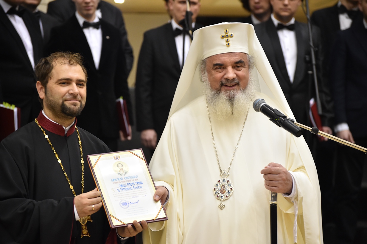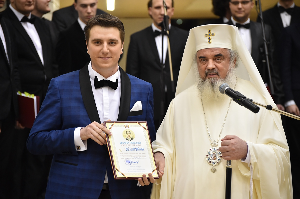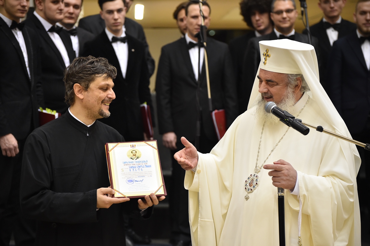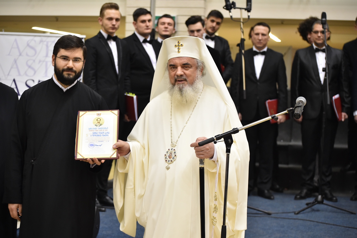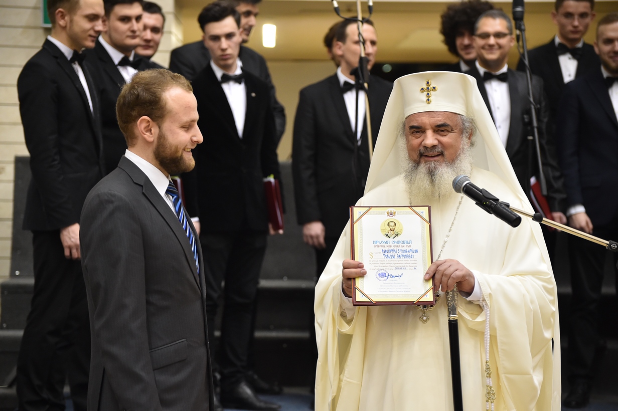 În continuare, Patriarhul României a oferit ca semn de prețuire și binecuvântare Diploma omagială Sfântul Ioan Gură de Aur celor trei coruri, moderatorului Iulian Bobârnea și Asociației Studenţilor Teologi Ortodocşi.