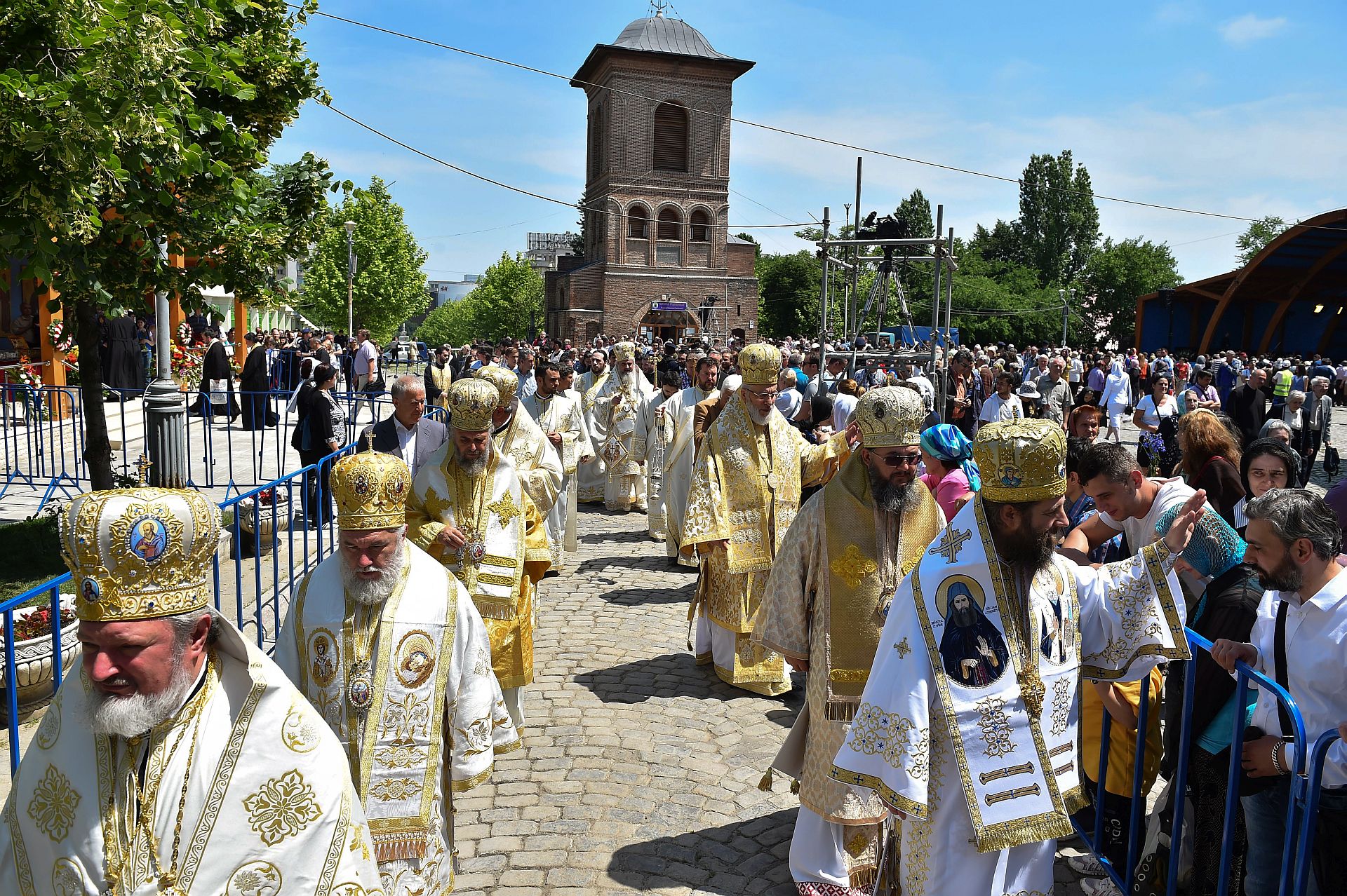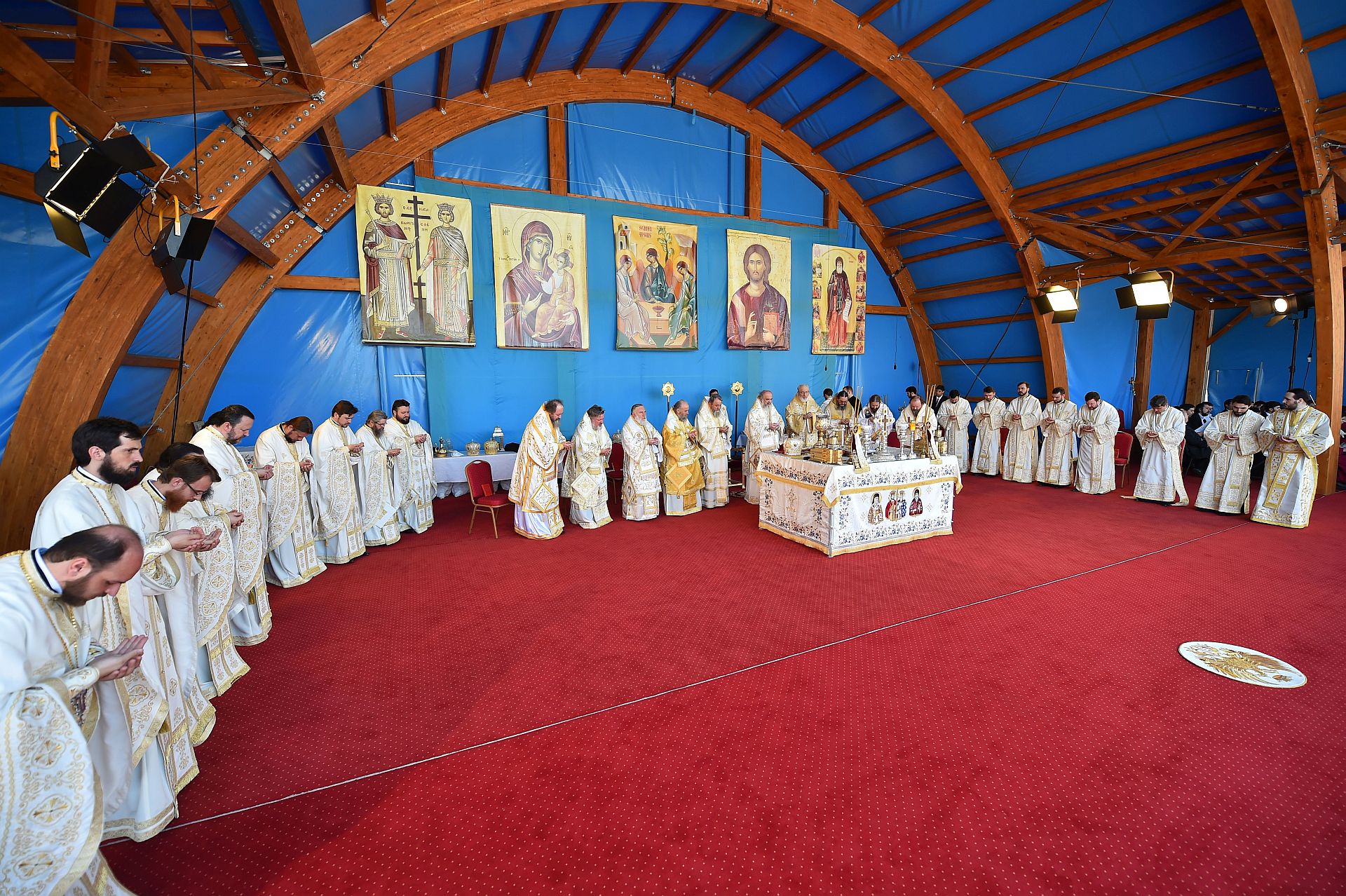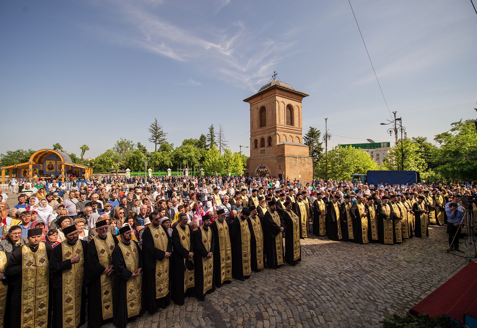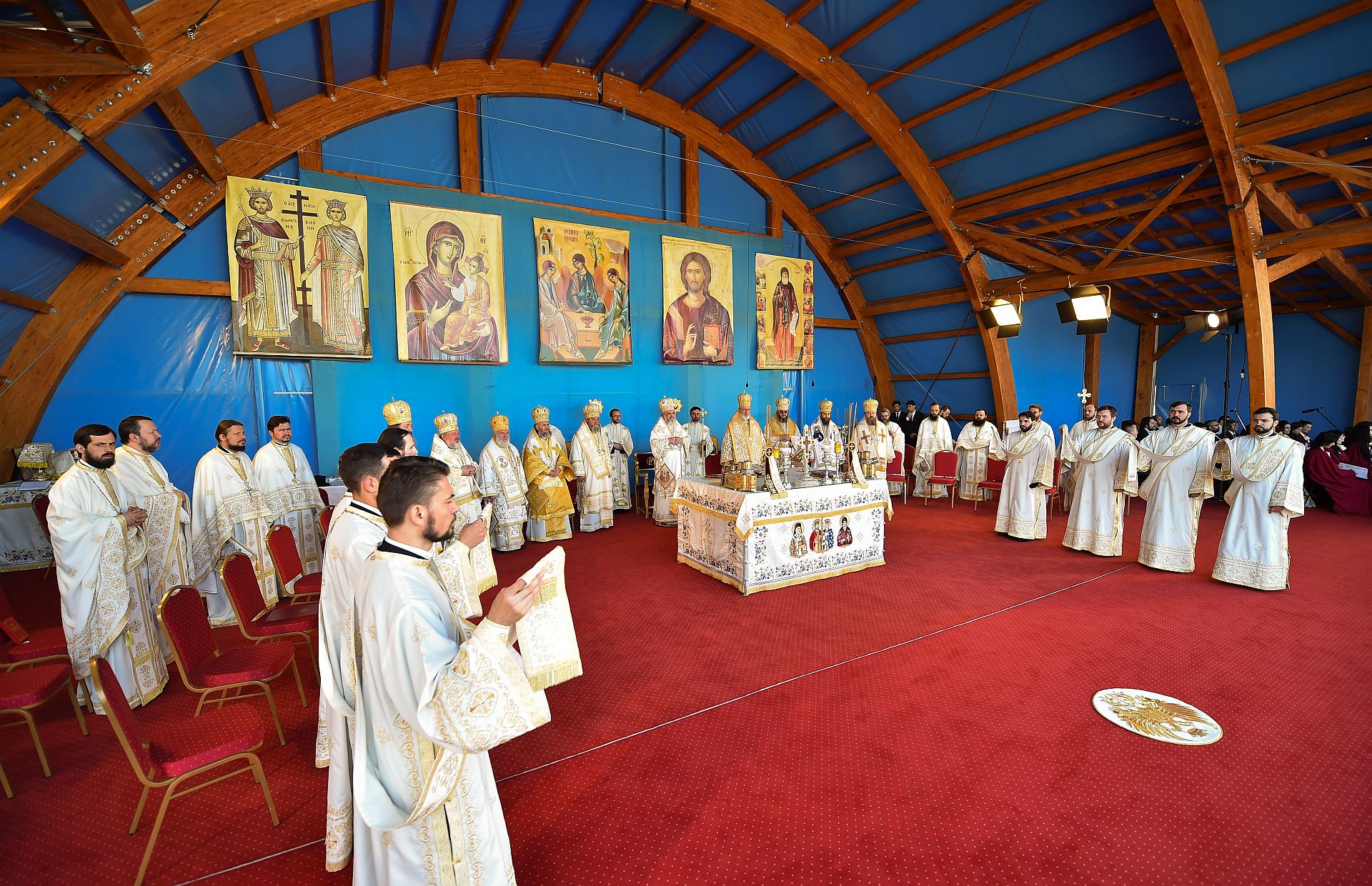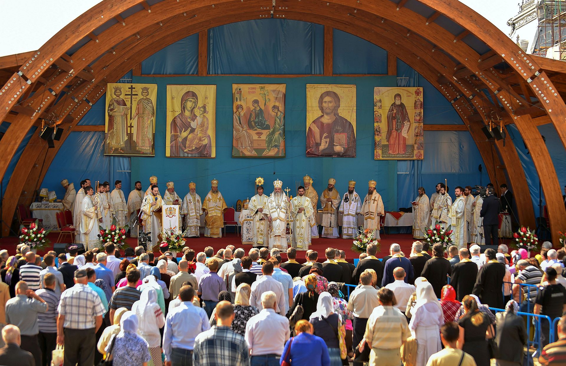 Sfânta Liturghie a fost săvârşită de Preafericitul Părinte Daniel, Patriarhul Bisericii Ortodoxe Române şi mai mulţi ierarhi, membri ai Sfântului Sinod al Bisericii Ortodoxe Române, înconjuraţi de un sobor preoţi şi diaconi, pe un podium special amenajat lângă Catedrala Patriarhală.