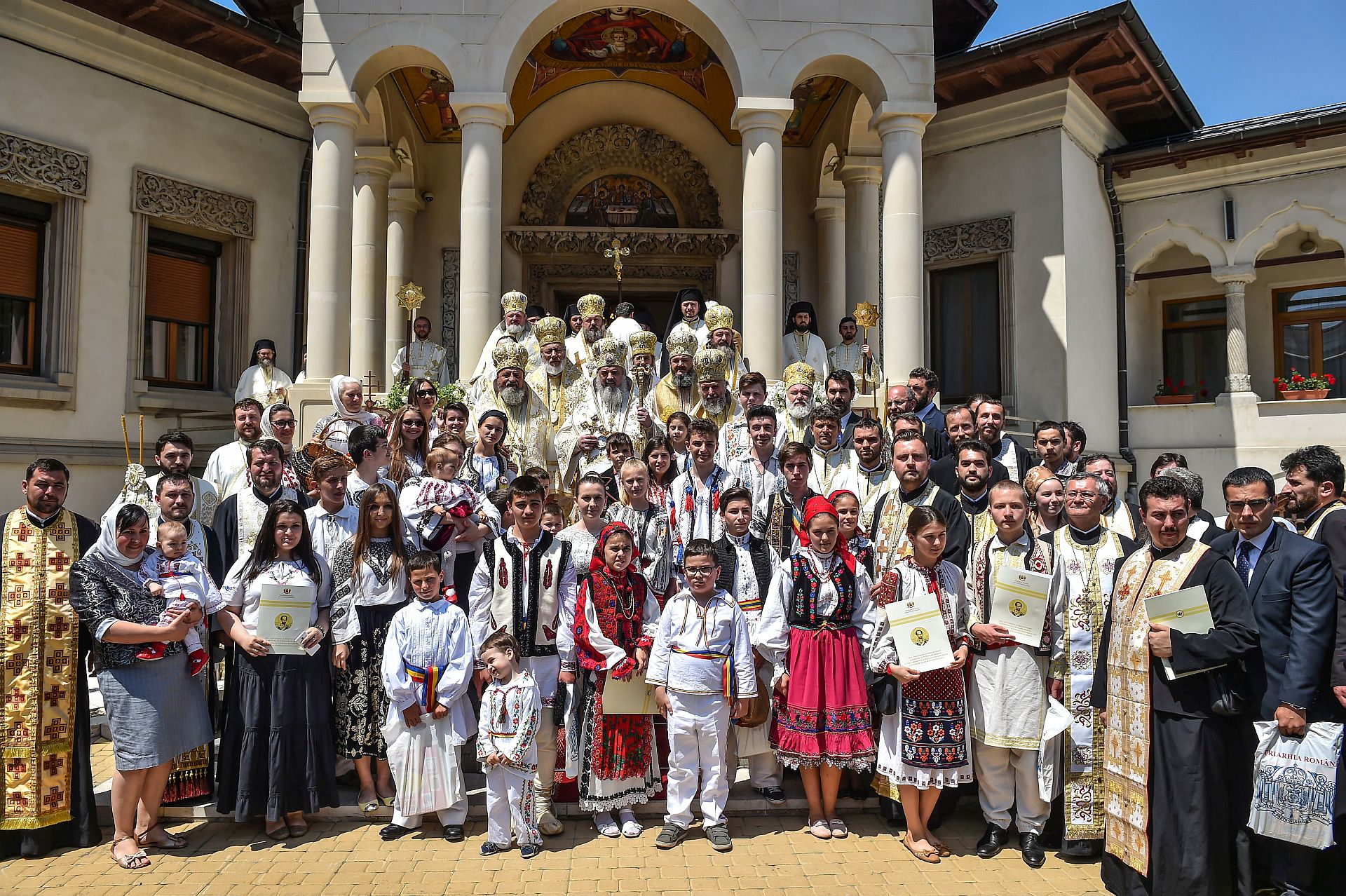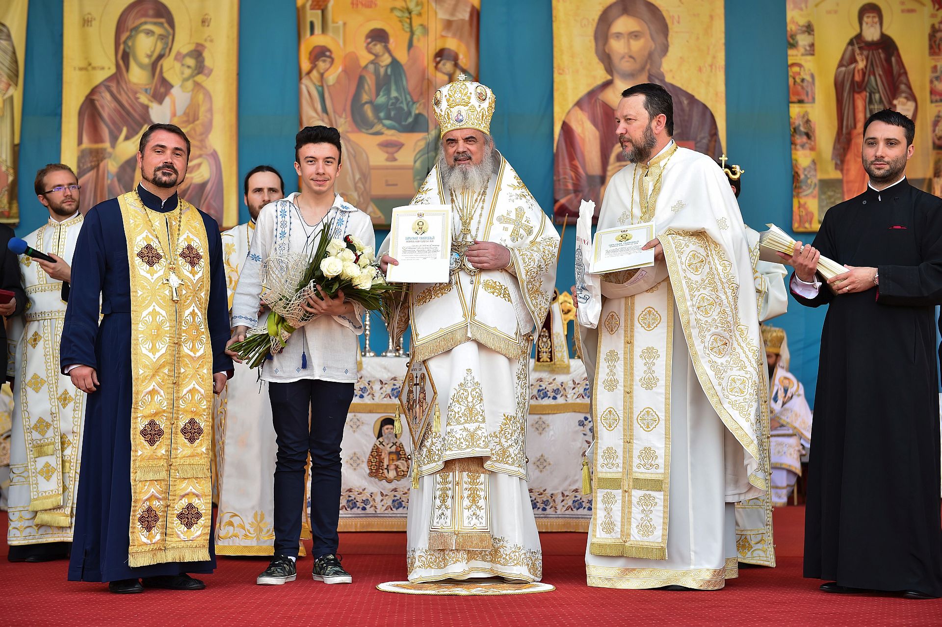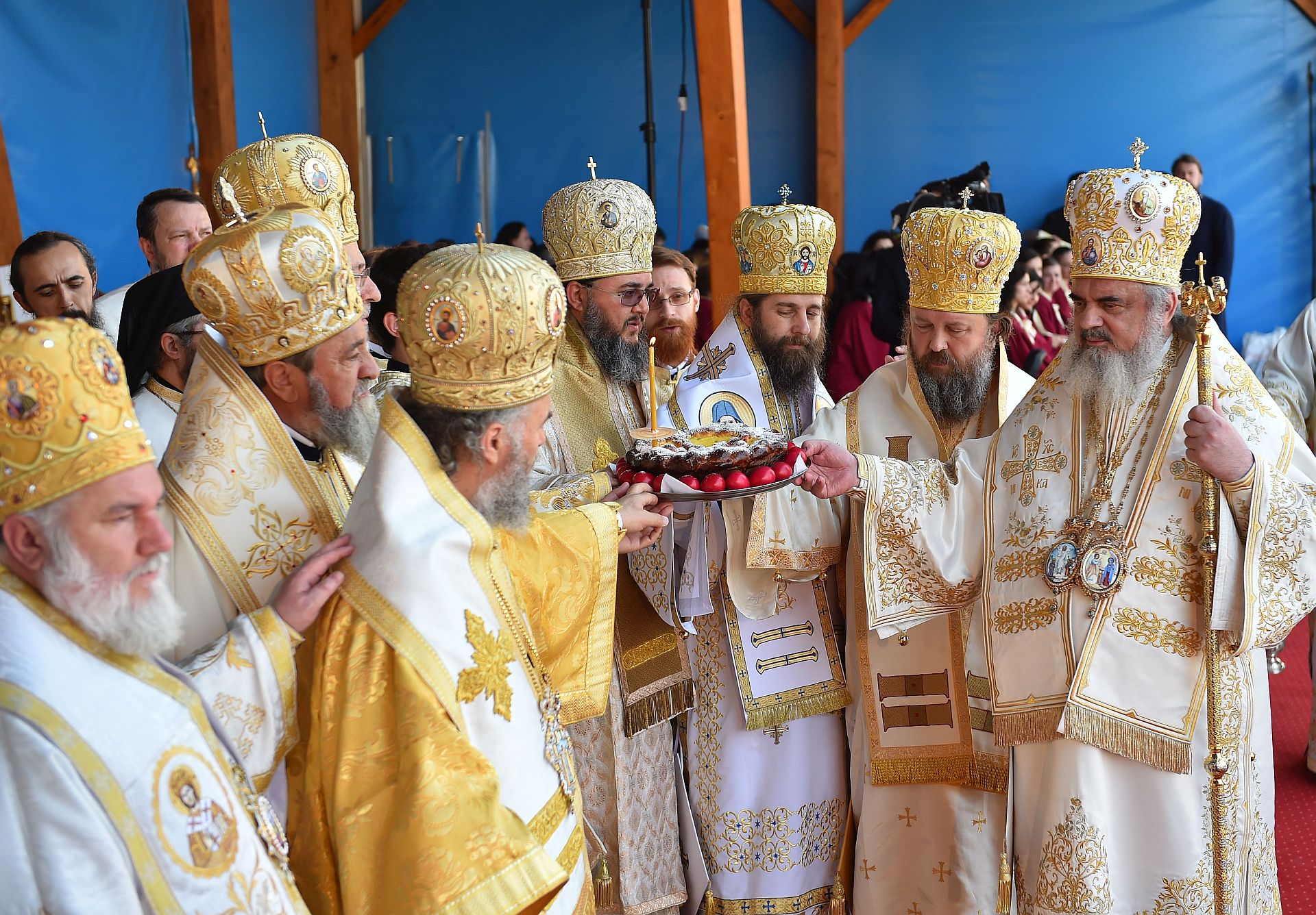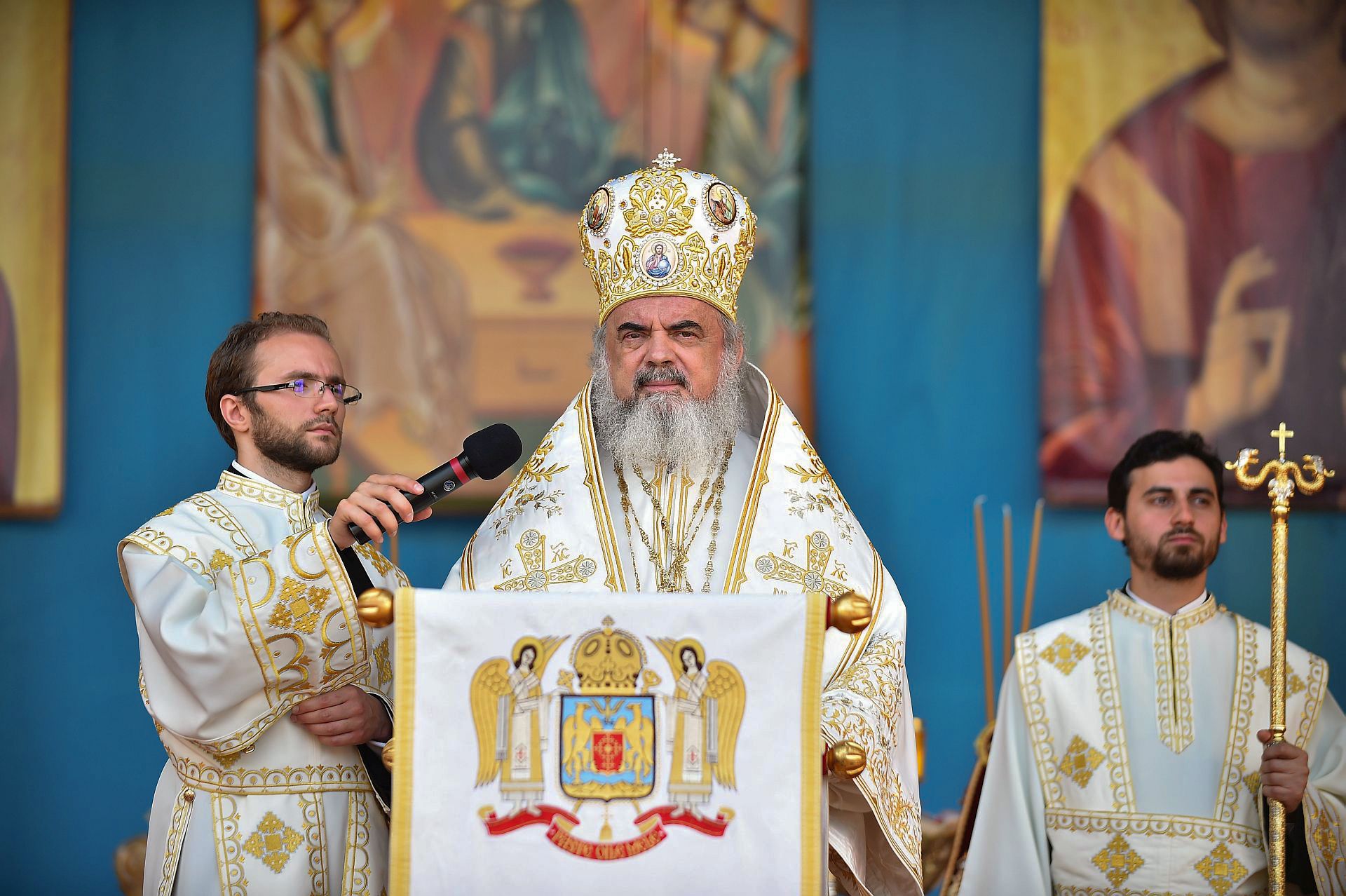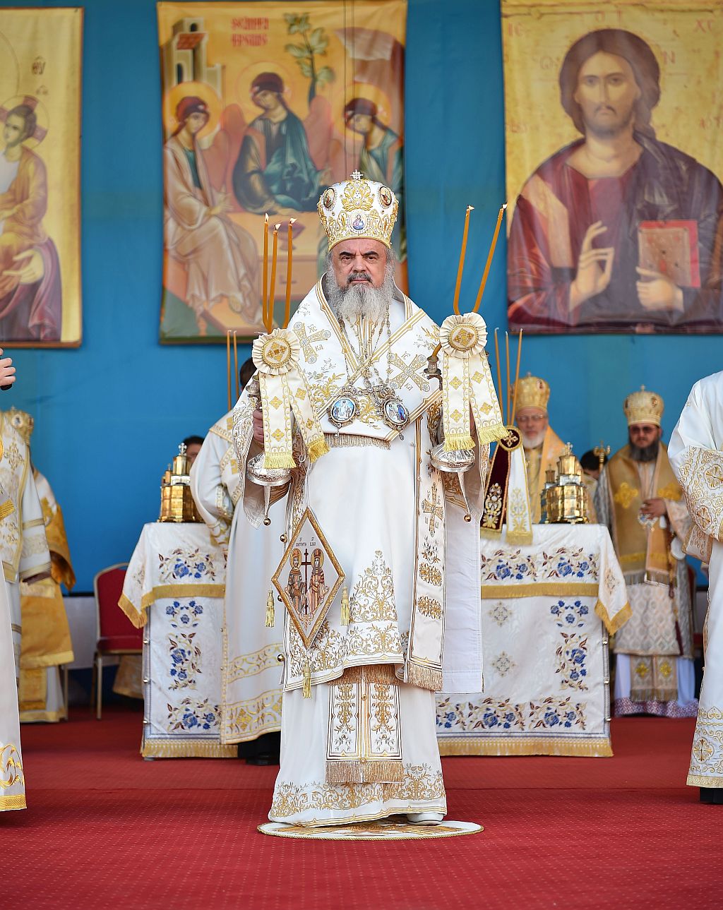 Sfânta Liturghie a fost săvârşită de Preafericitul Părinte Daniel, Patriarhul Bisericii Ortodoxe Române şi mai mulţi ierarhi, membri ai Sfântului Sinod al Bisericii Ortodoxe Române, înconjuraţi de un sobor preoţi şi diaconi, pe un podium special amenajat lângă Catedrala Patriarhală.