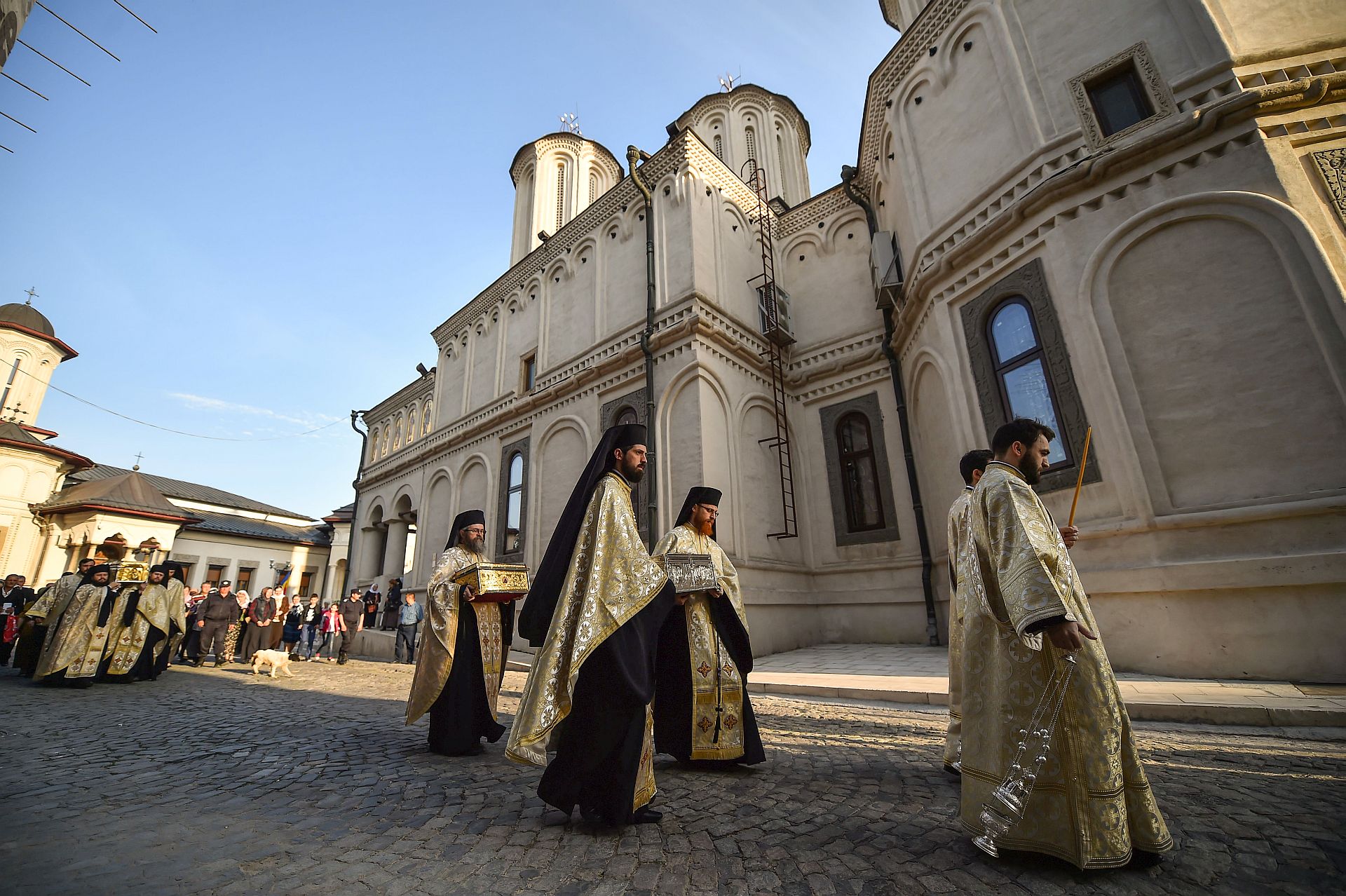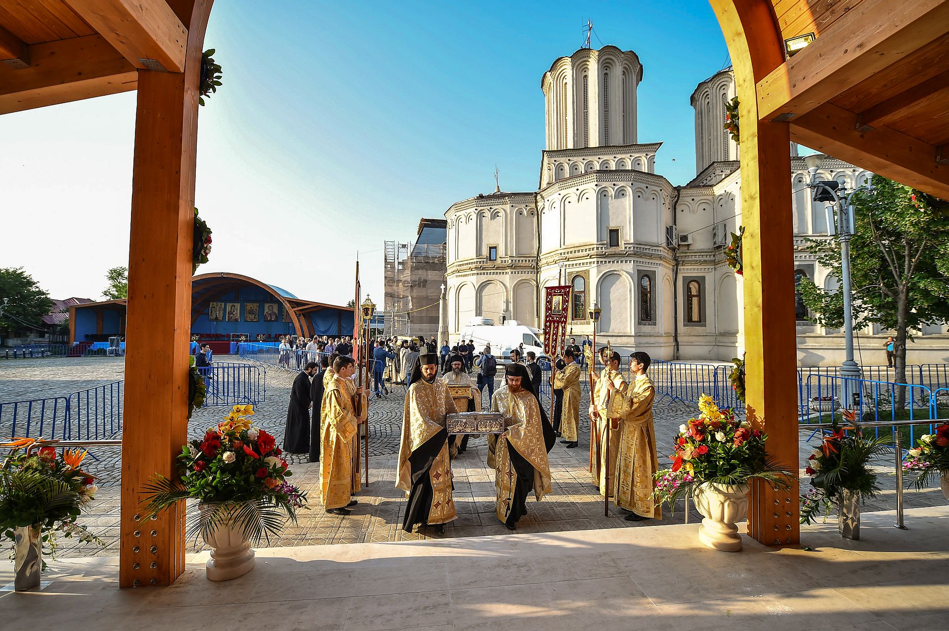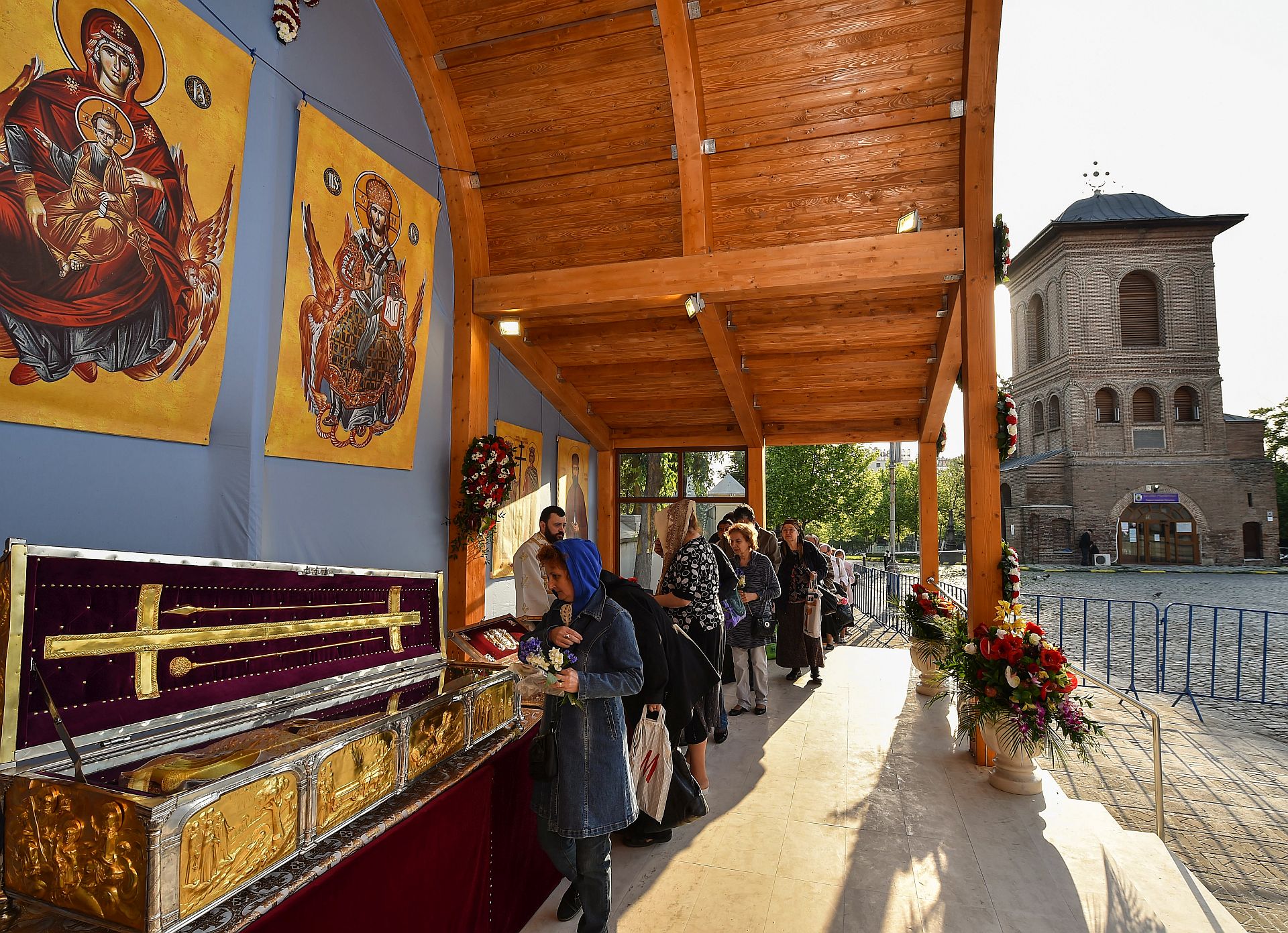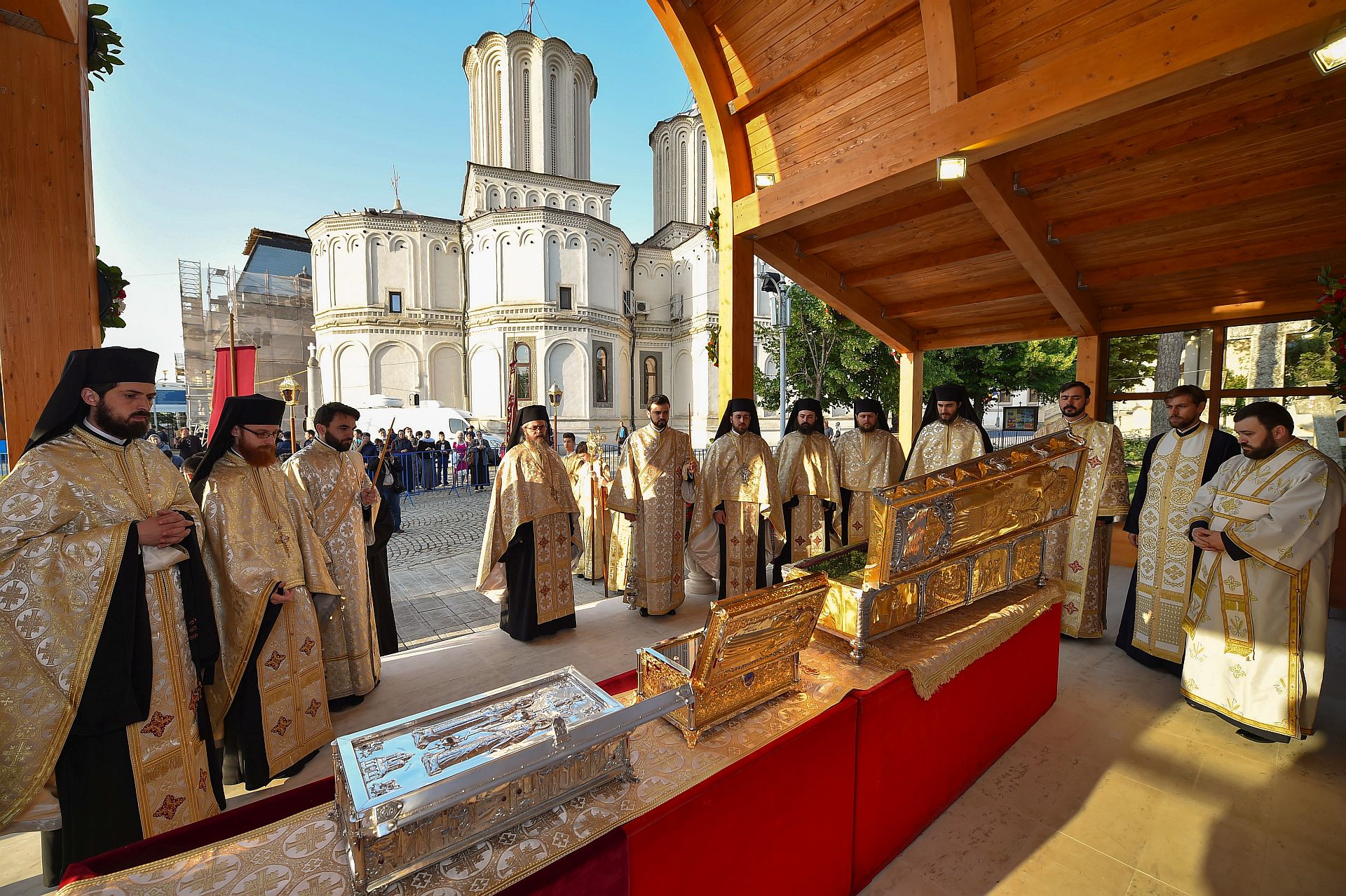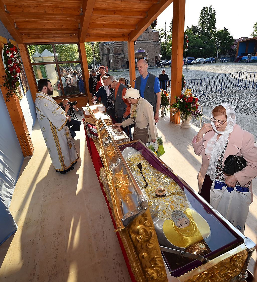 Credincioşii prezenţi astăzi au putut aduce cinstire sfintelor moaşte ale Sfinţilor Împăraţi Constantin şi Elena, ale Sfântului Cuvios Dimitrie cel Nou, Ocrotitorul Bucureştilor şi ale Sfântului Mare Mucenic Efrem cel Nou aşezate spre închinare în baldachinul special amenajat de pe esplanada din faţa Catedralei Patriarhale.