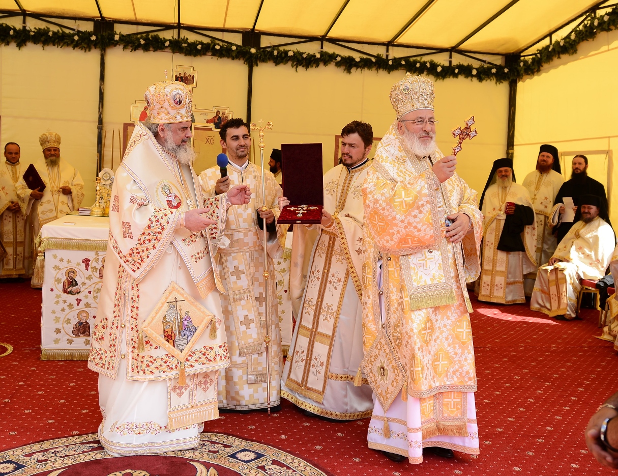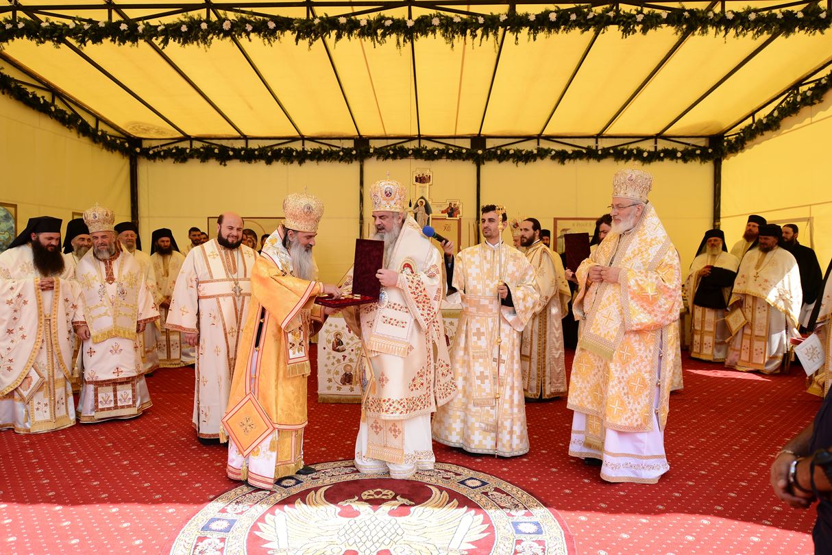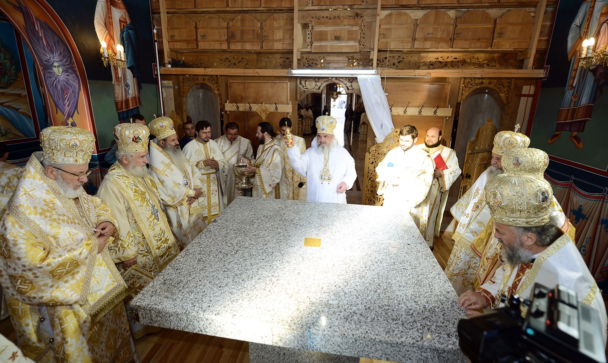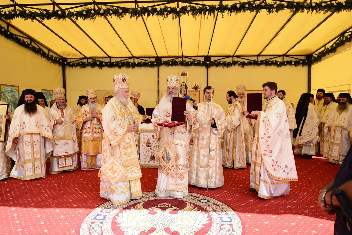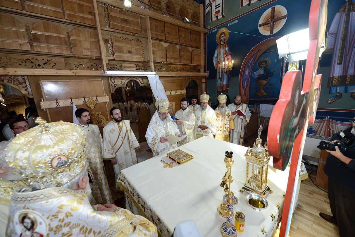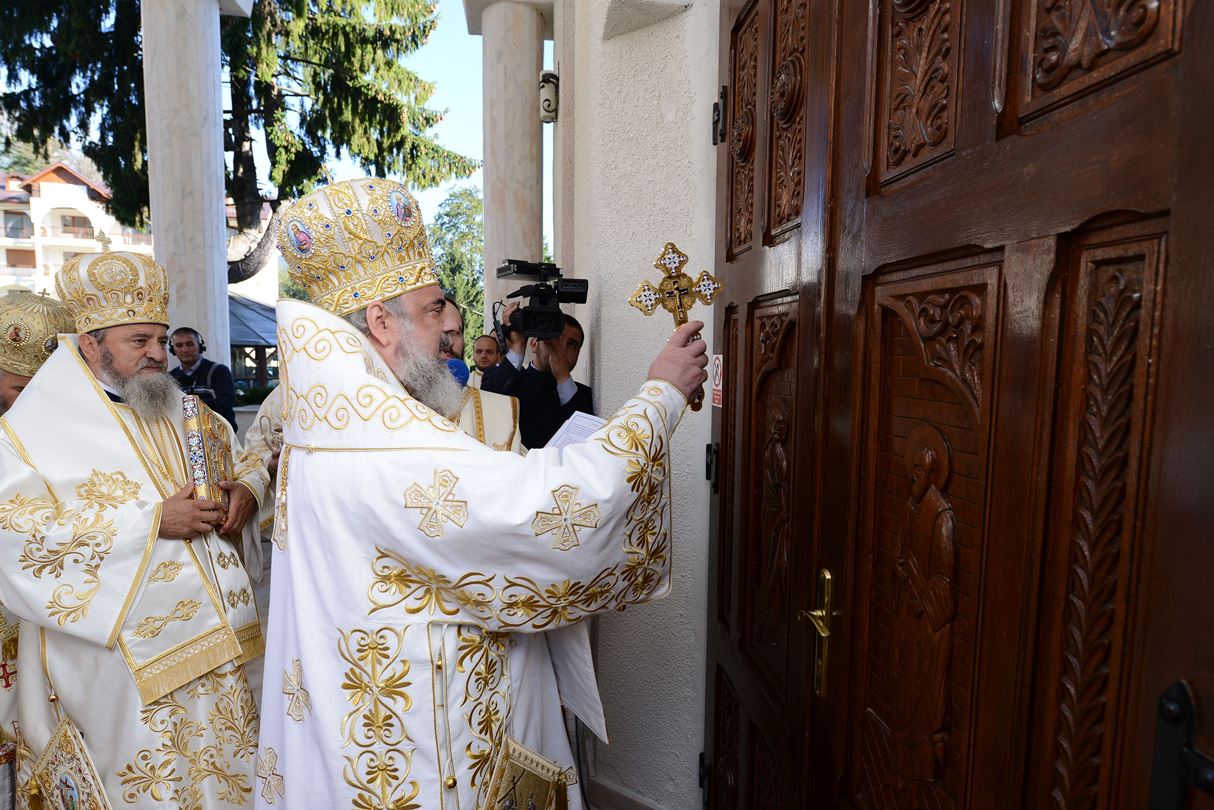 „Zidirea acestei biserici a durat din anul 2002 până în anul 2007 când s-au finalizat lucrările de construire a acestui sfânt lăcaş. Începând cu luna august 2012 au fost începute lucrările de pictură care au durat până în luna septembrie, anul curent. Pictura a fost realizată de dl. Sebastian Ene. Toate aceste lucrări au fost realizate cu purtarea de grijă şi cu ajutorul Maicii Domnului şi cu marea dragoste a credincioşilor din toate colţurile ţării şi chiar de peste hotare, care au contribuit fiecare după putere, dar toţi cu dragoste pentru sfintele locaşuri de rugăciune”, a spus Arhim. David Petrovici.bStarețul Mănăstirii Caraiman a oferit la final Preafericirii Sale și ierarhilor prezenți câte o icoană cu praznicul Înălțării Sfintei Cruci.