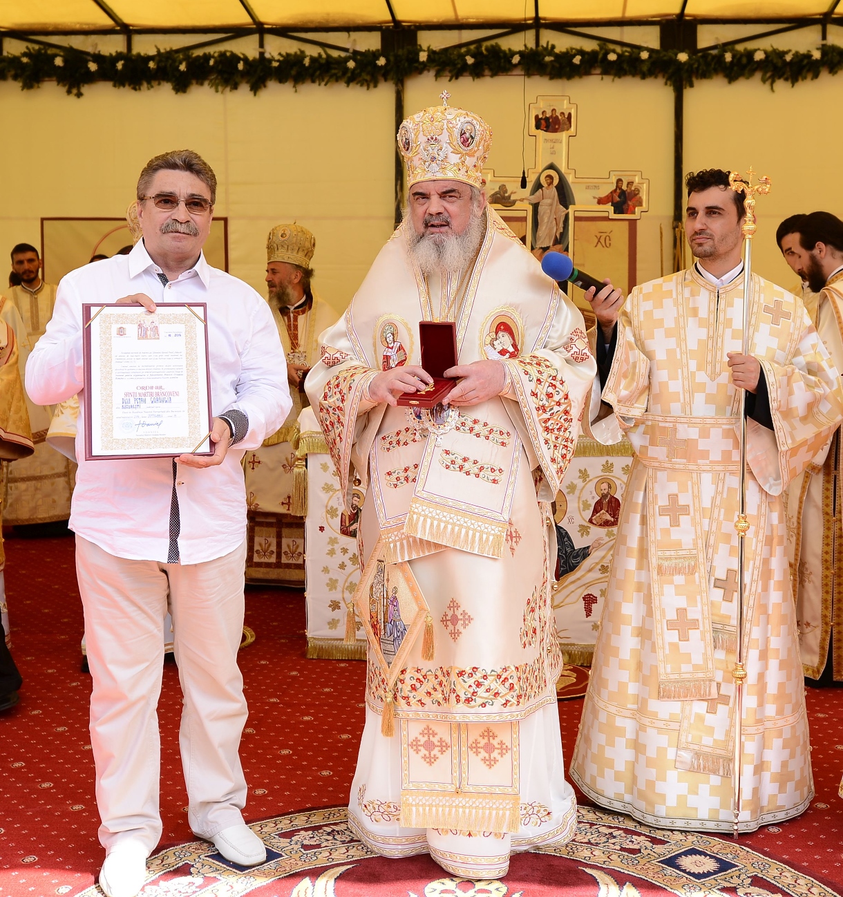 După slujba de sfințire, Patriarhul României a mulțumit primarului orașului Bușteni, Emanoil Savin, pentru sprijinul acordat ridicării unei biserici în Munții Bucegi, în apropierea crucii de pe vârful Caraiman.