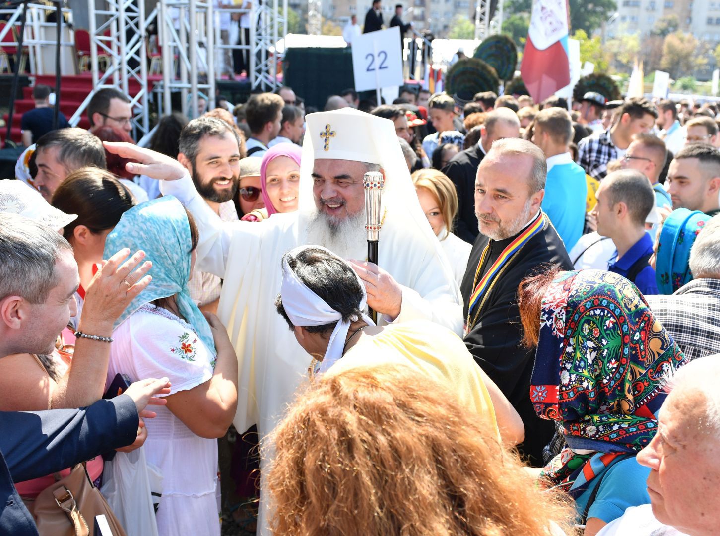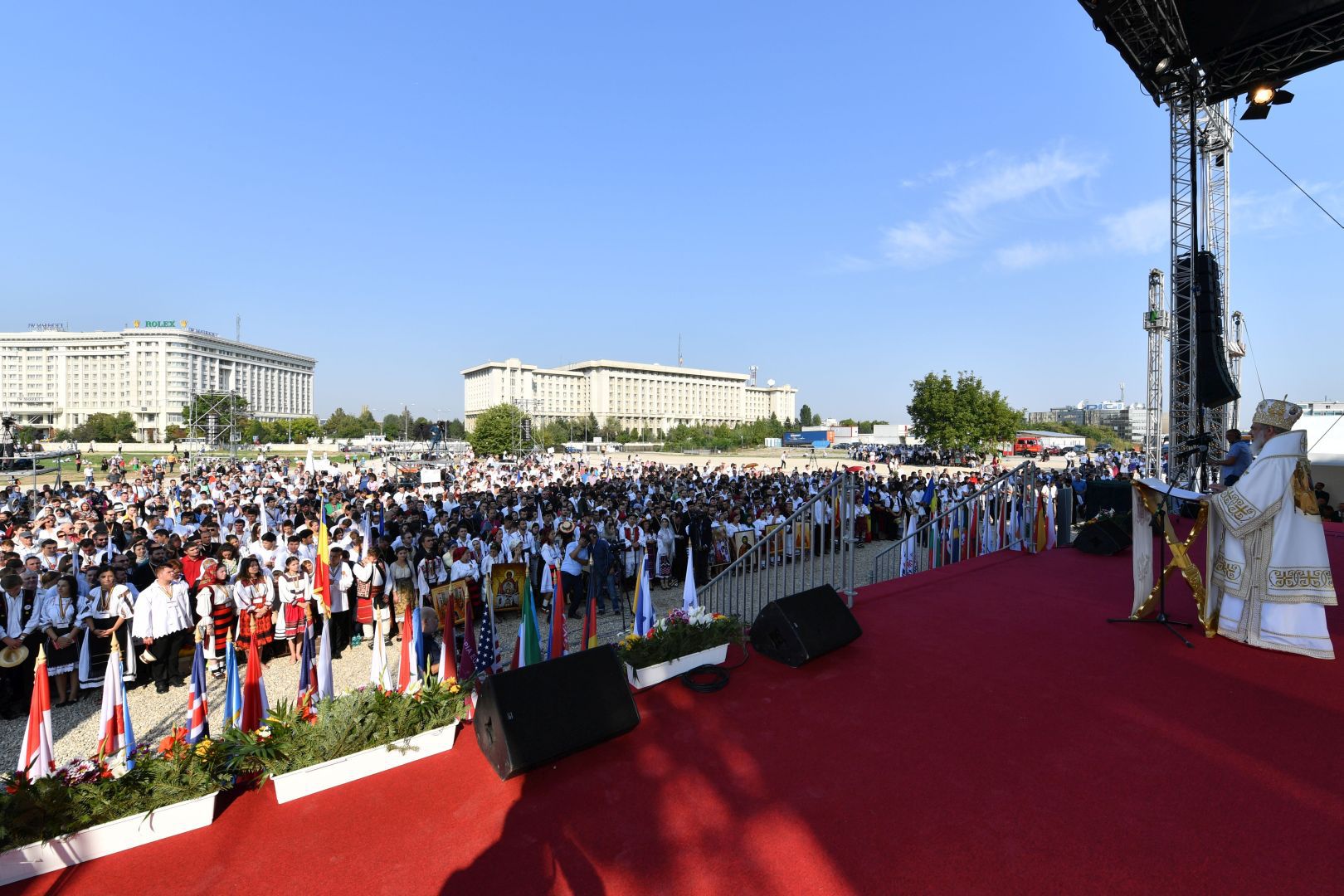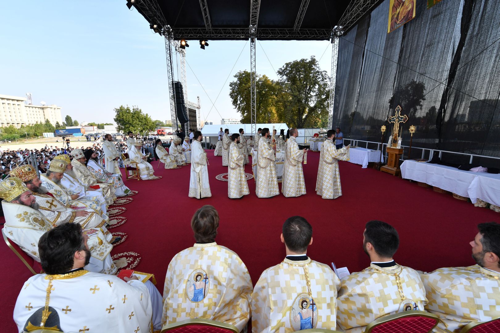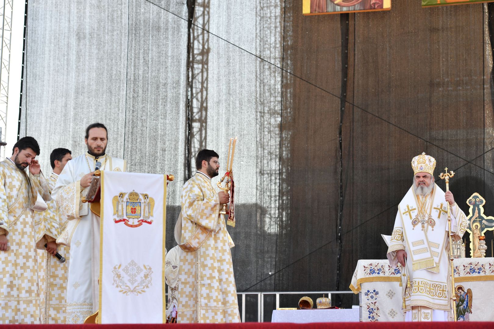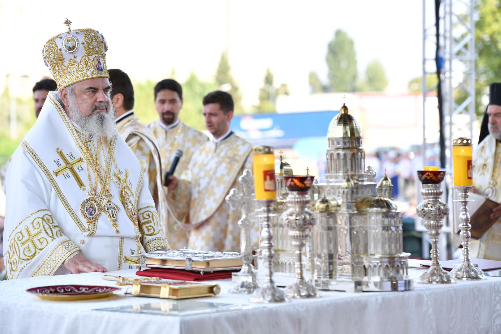 Astăzi, în Duminica a 11-a după Rusalii, Preafericitul Părinte Daniel, Patriarhul Bisericii Ortodoxe Române, a oficiat prima Sfântă Liturghie la Catedrala Mântuirii Neamului. Slujba a fost oficiată pe o scenă special amenajată în faţa Catedralei Naţionale.