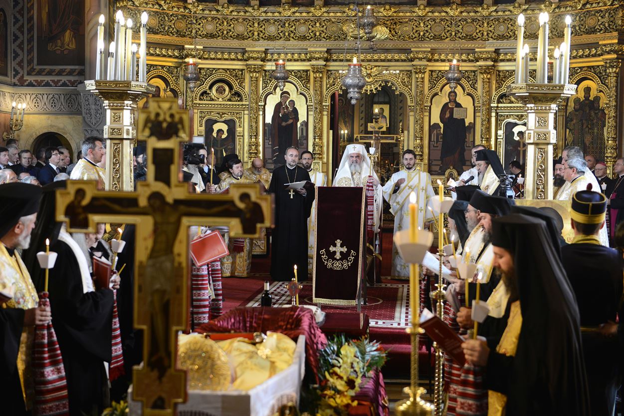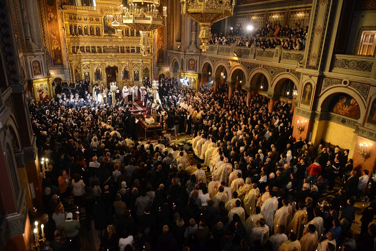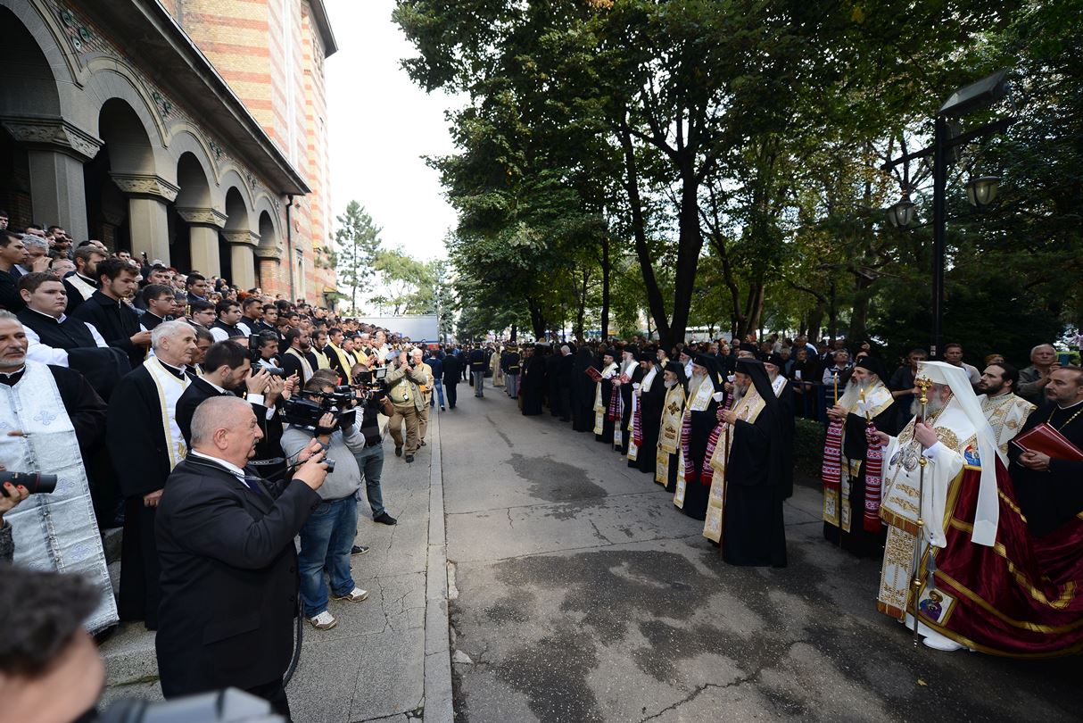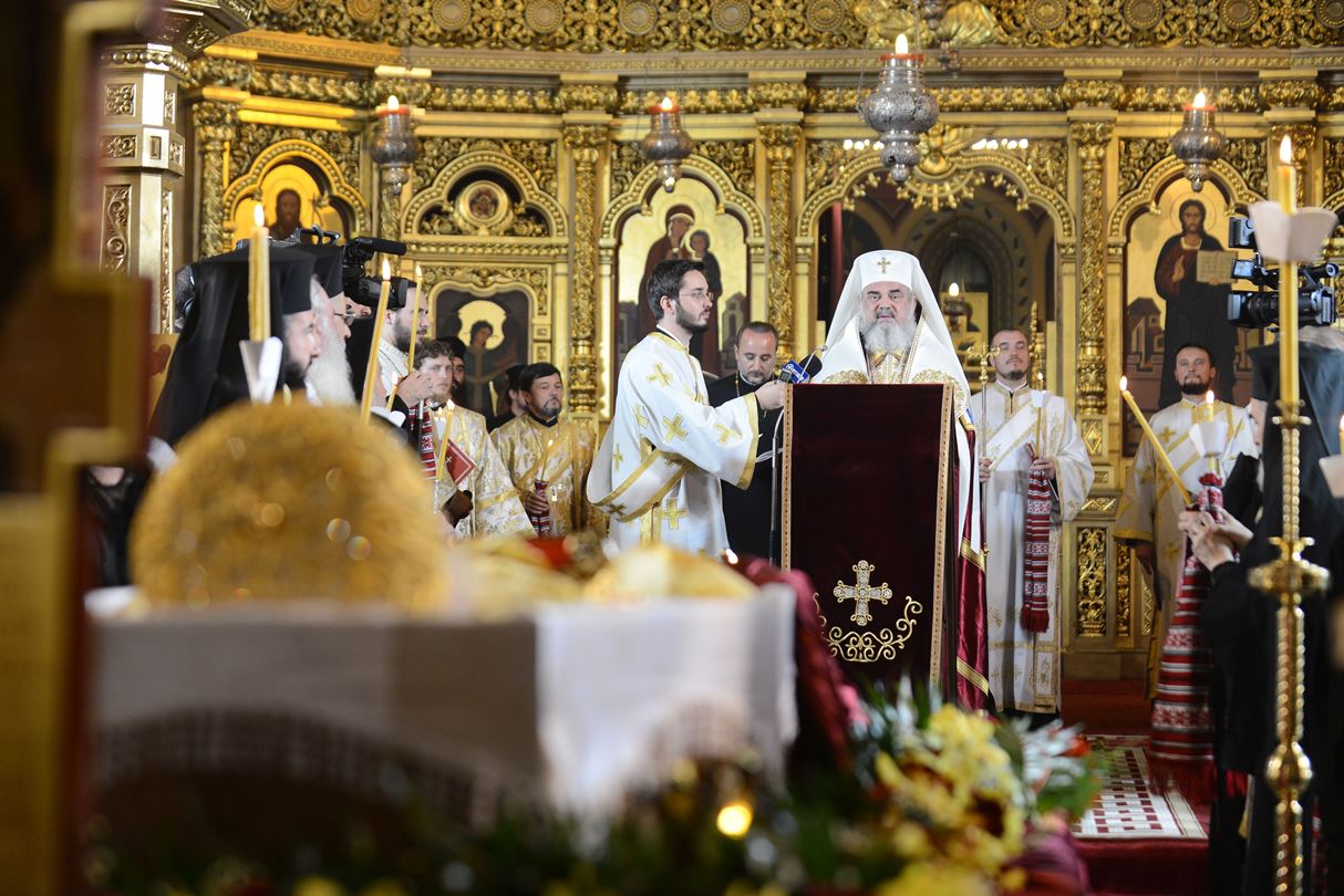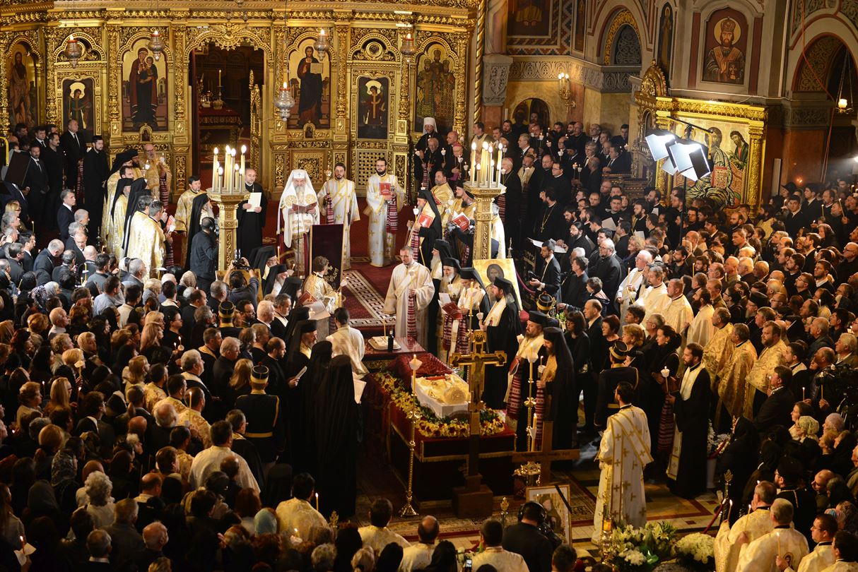După Sfânta Liturghie s-a săvârşit slujba înmormântării de Preafericitul Părinte Patriarh Daniel alături de care au slujit următorii ierarhi: ÎPS Teofan, Arhiepiscopul Iaşilor şi Mitropolitul Moldovei şi Bucovinei, ÎPS Laurenţiu, Arhiepiscopul Sibiului şi Mitropolitul Ardealului, ÎPS Andrei, Arhiepiscopul Vadului, Feleacului şi Clujului şi Mitropolitul Clujului, Maramureşului şi Sălajului, ÎPS Serafim, Arhiepiscopul Ortodox Român al Germaniei, Austriei şi Luxemburgului şi Mitropolitul Ortodox Român al Germaniei, Europei Centrale şi de Nord , ÎPS Calinic, Arhiepiscopul Argeşului şi Muscelului, ÎPS Timotei, Arhiepiscopul Aradului, ÎPS Ioan, Arhiepiscop onorific, Episcopul Covasnei şi Harghitei, PS Lukian, Episcopul ortodox sârb al Ungariei şi administrator al Vicariatului ortodox sârb din Timişoara, PS Lucian, Episcopul Caransebeşului, PS Sofronie, Episcopul Ortodox Român al Oradiei, PS Nicodim, Episcopul Severinului şi Strehaiei, PS Gurie, Episcopul Devei şi Hunedoarei, PS Daniil, Episcop-locţiitor al Episcopiei Daciei Felix, PS Siluan, Episcopul Ortodox Român al Ungariei, PS Macarie, Episcopul Ortodox Român al Europei de Nord, PS Paisie Lugojeanul, Episcop-vicar al Arhiepiscopiei Timişoarei.