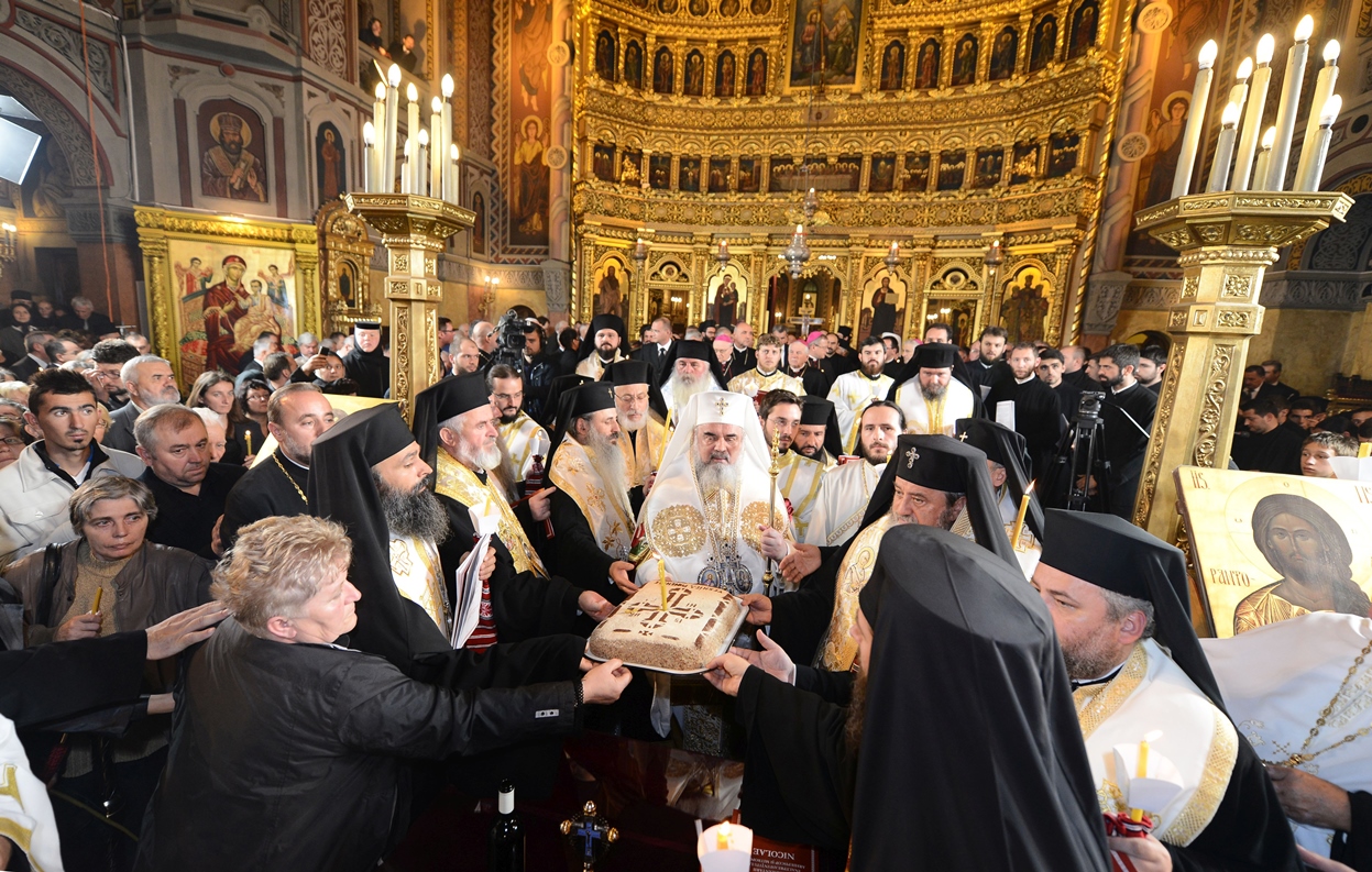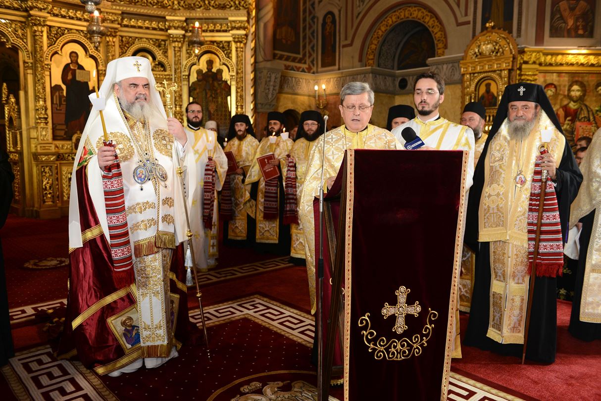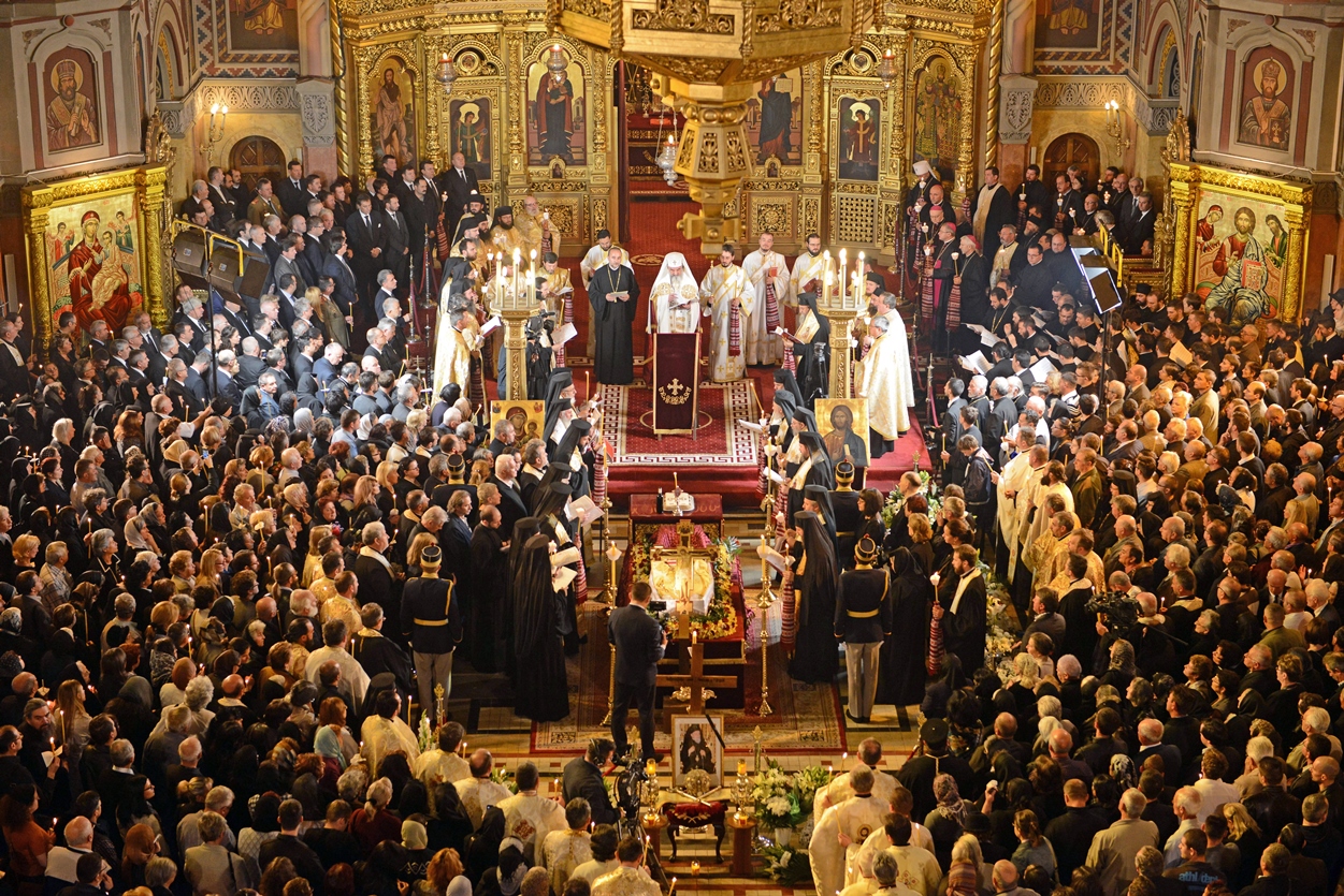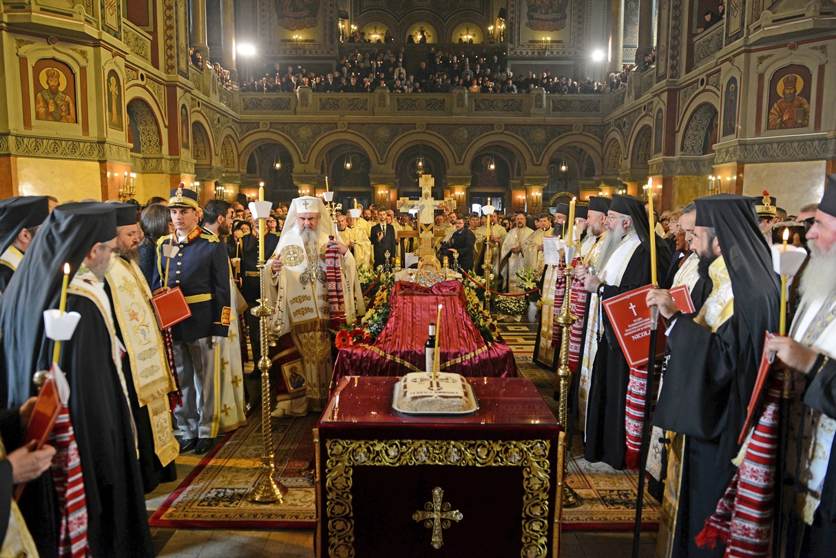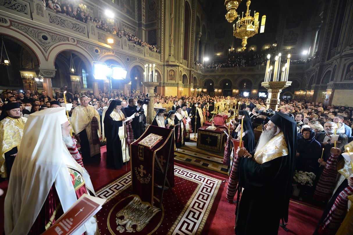 După Sfânta Liturghie s-a săvârşit slujba înmormântării de Preafericitul Părinte Patriarh Daniel alături de care au slujit următorii ierarhi: ÎPS Teofan, Arhiepiscopul Iaşilor şi Mitropolitul Moldovei şi Bucovinei, ÎPS Laurenţiu, Arhiepiscopul Sibiului şi Mitropolitul Ardealului, ÎPS Andrei, Arhiepiscopul Vadului, Feleacului şi Clujului şi Mitropolitul Clujului, Maramureşului şi Sălajului, ÎPS Serafim, Arhiepiscopul Ortodox Român al Germaniei, Austriei şi Luxemburgului şi Mitropolitul Ortodox Român al Germaniei, Europei Centrale şi de Nord , ÎPS Calinic, Arhiepiscopul Argeşului şi Muscelului, ÎPS Timotei, Arhiepiscopul Aradului, ÎPS Ioan, Arhiepiscop onorific, Episcopul Covasnei şi Harghitei, PS Lukian, Episcopul ortodox sârb al Ungariei şi administrator al Vicariatului ortodox sârb din Timişoara, PS Lucian, Episcopul Caransebeşului, PS Sofronie, Episcopul Ortodox Român al Oradiei, PS Nicodim, Episcopul Severinului şi Strehaiei, PS Gurie, Episcopul Devei şi Hunedoarei, PS Daniil, Episcop-locţiitor al Episcopiei Daciei Felix, PS Siluan, Episcopul Ortodox Român al Ungariei, PS Macarie, Episcopul Ortodox Român al Europei de Nord, PS Paisie Lugojeanul, Episcop-vicar al Arhiepiscopiei Timişoarei.