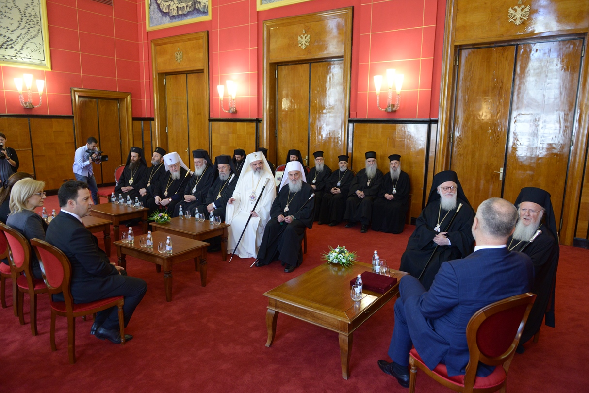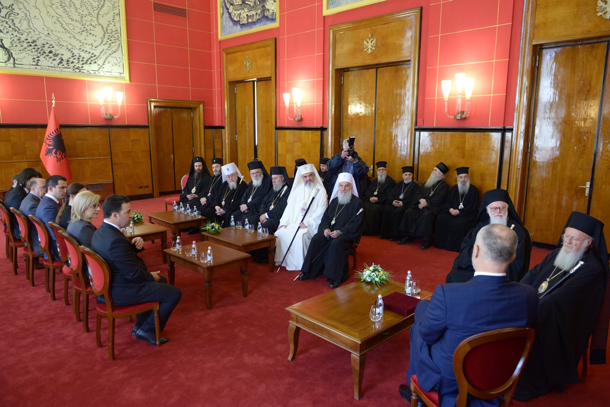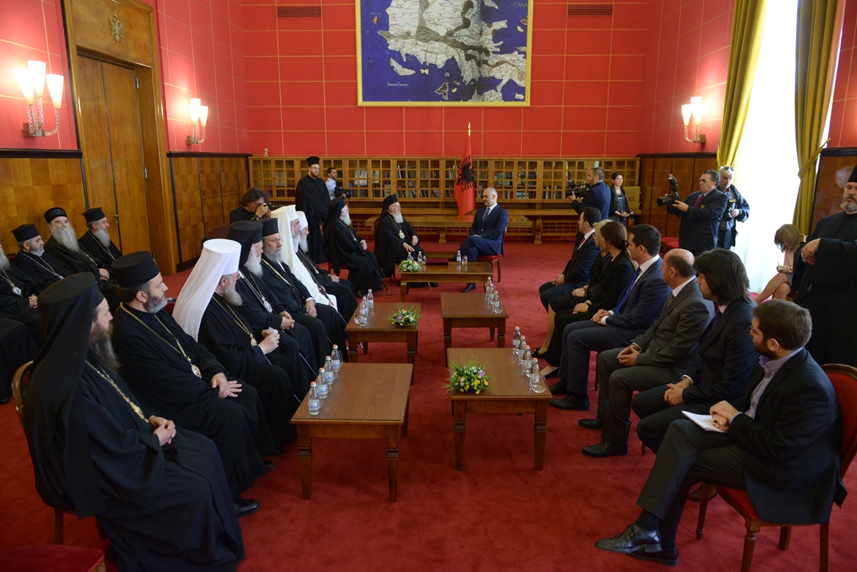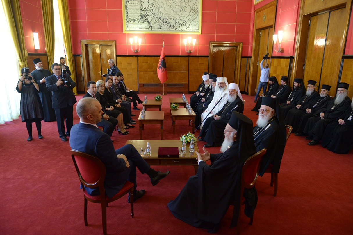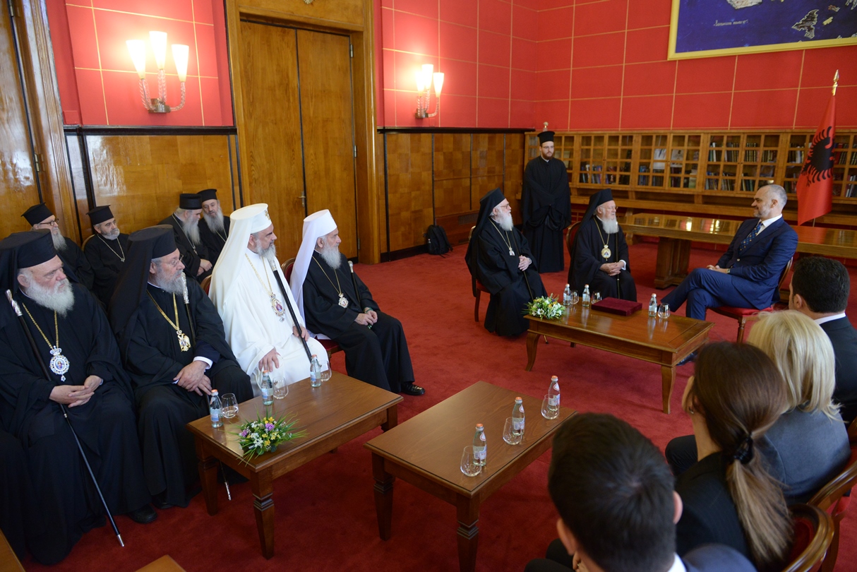 Excelența Sa, dl. Edi Rama, Prim-ministrul Albaniei s-a întâlnit astăzi, 2 iunie 2014, cu Întâistătătorii de Biserici Ortodoxe prezenți la Tirana. Aceștia se află în Capitala Albaniei cu prilejul sfințirii noii Catedrale arhiepiscopale Învierea Domnului, eveniment ce a avut loc duminică, 1 iunie 2014. La întâlnirea cu Prim Ministrul Republicii Albania, Excelența Sa, dl. Edi Rama, a fost prezent și Patriarhul Bisericii Ortodoxe Române, Preafericitul Părinte Daniel.