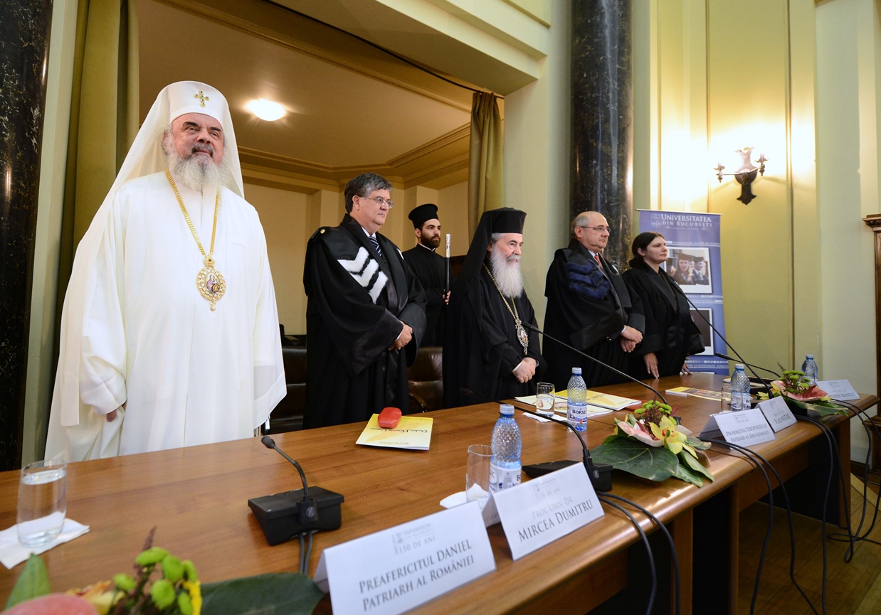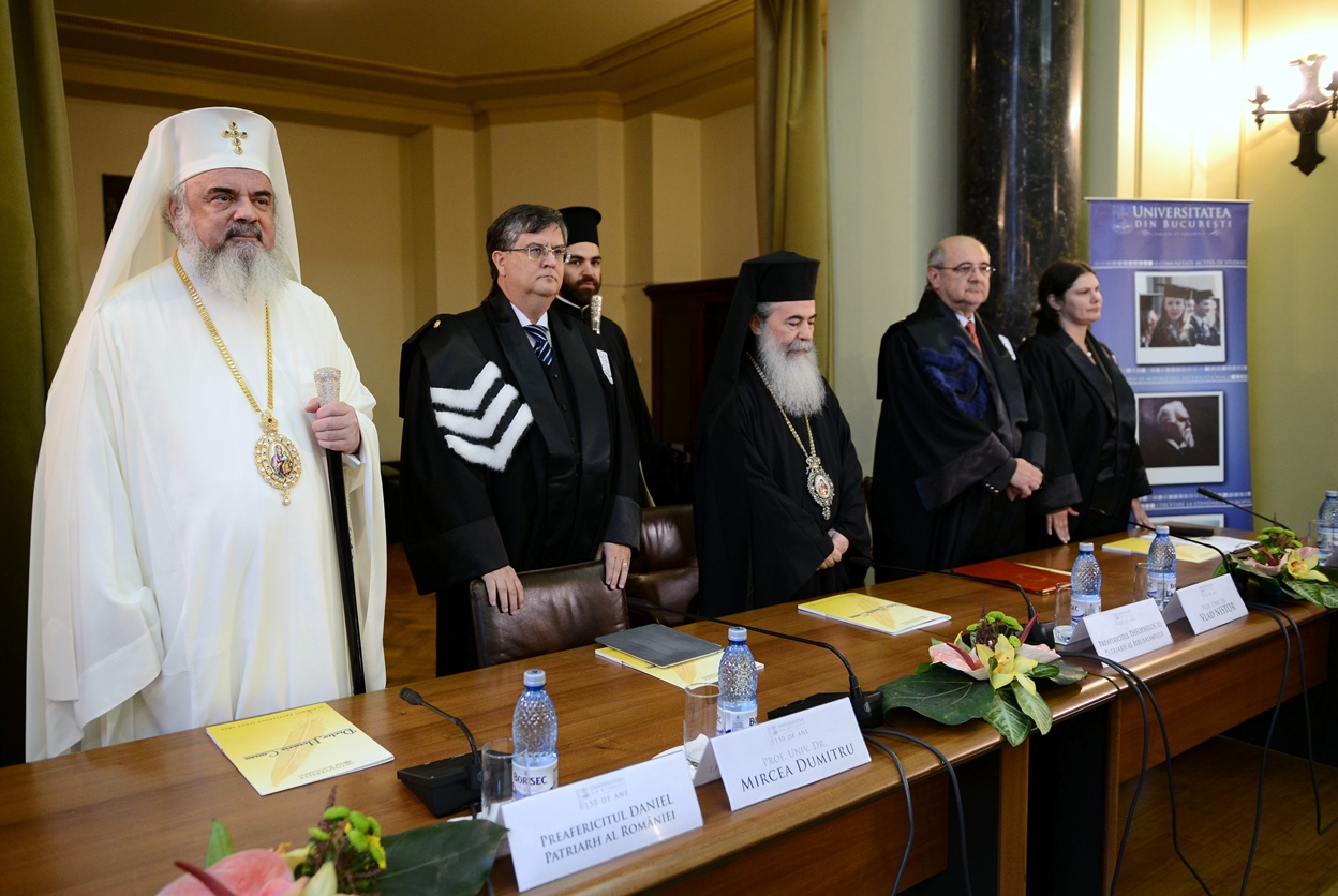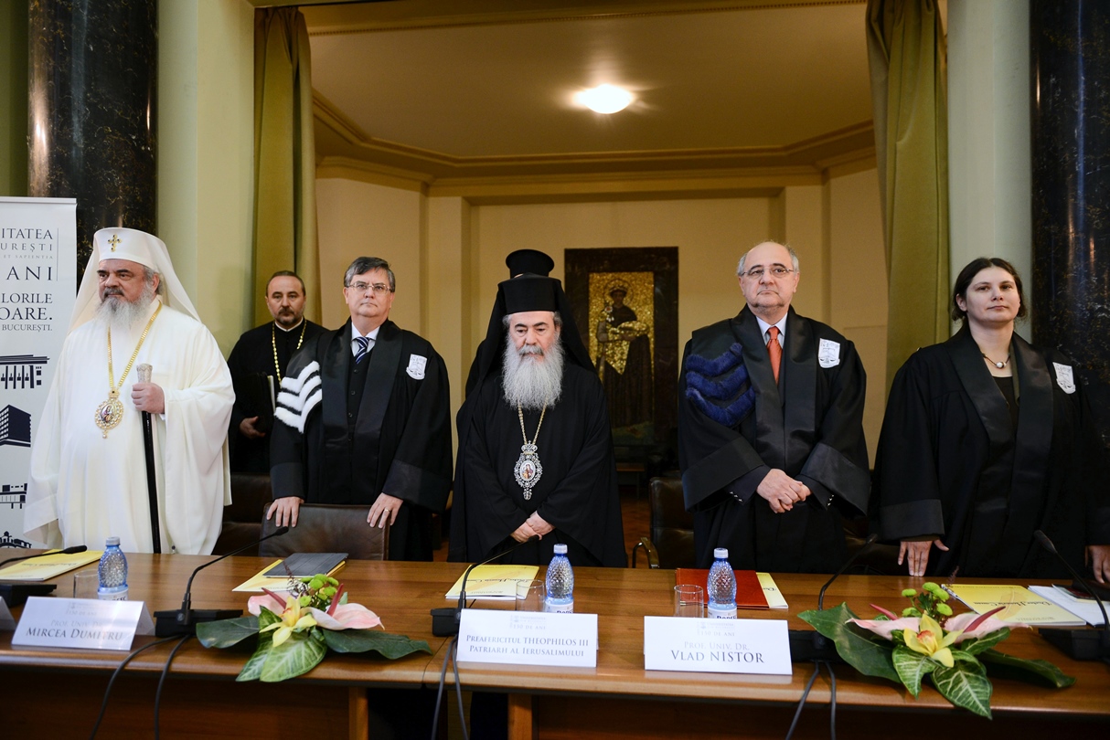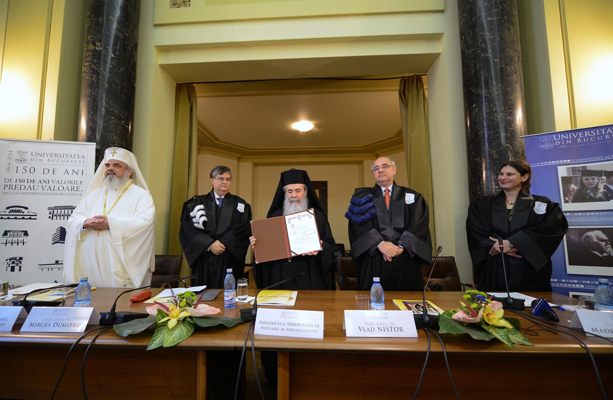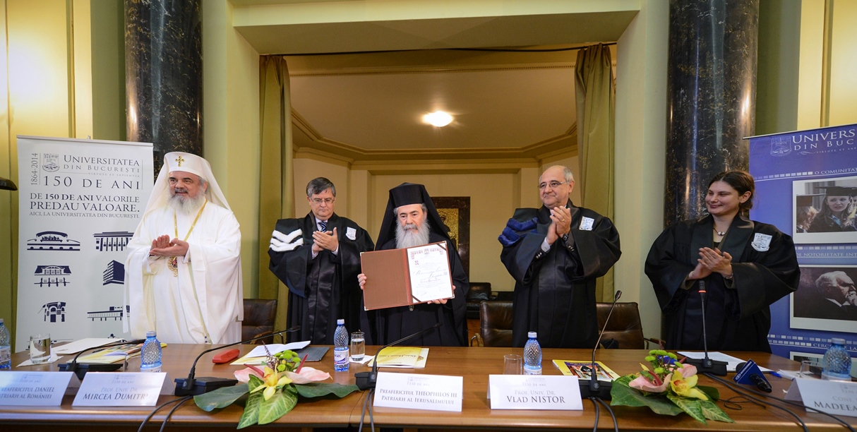 Preafericitul Părinte Teofil al III-lea, Patriarhul Ierusalimului, a primit astăzi titlul de Doctor Honoris Causa al Universităţii din Bucureşti. Evenimentul s-a desfăşurat în prezenţa Preafericitului Părinte Daniel, Patriarhul Bisericii Ortodoxe Române, în sala „Prof. Constantin Stoicescu” a Facultăţii de Drept. Laudatio a fost citit de Conf. Univ. Dr. Madeea Axinciuc, directorul Programului de Studii Religioase al Universităţii din Bucureşti.