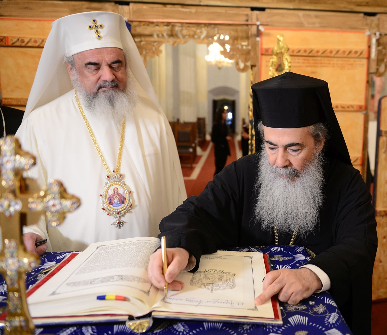 „Vizita Noastră are loc într-o perioadă a evoluţiilor politice şi culturale radicale, atât la nivel internaţional, cât şi naţional sau local. Suntem conştienţi de situaţia socio-economică complicată din ţara dumneavoastră şi din regiune. Totuşi, ştim din ultima dumneavoastră vizită şi din pelerinajul din Israel şi din Statul Palestinian că dumneavoastră cunoaşteţi situaţia frământată din regiunea noastră, respectiv, din Orientul Mijlociu şi, în special, din Ţara Sfântă. Suntem siguri că atunci aţi avut o experienţă personală care v-a convins că prezenţa creştină în Orientul Mijlociu este o componentă indispensabilă a contextului multietnic, multicultural şi multireligios. Dorim să vă supunem atenţiei suferinţa creştinilor din această regiune, care este rezultatul unei persecuţii declarate împotriva lor. În aceeaşi măsură în care valorile creştine şi normele morale au plămădit şi format identitatea culturală şi morală a ţării dumneavoastră, membră a Uniunii Europene, tot astfel creştinismul a modelat structura socio-politică şi religioasă actuală a Ţării Sfinte, care include Israelul, Regatul Haşemit al Iordaniei şi Statul Palestina. Întrucât Biserica şi Statul servesc aceluiaşi scop, adică binele cetăţenilor, este imperativ ca Biserica şi Statul să-şi unească valorile spirituale comune pentru a se opune forţelor distructive care ameninţă fiinţa umană, considerată a fi însăşi chipul Creatorului ei, Atotputernicul Dumnezeu”, a spus Preafericitul Părinte Teofil, Patriarhul Ierusalimului.
