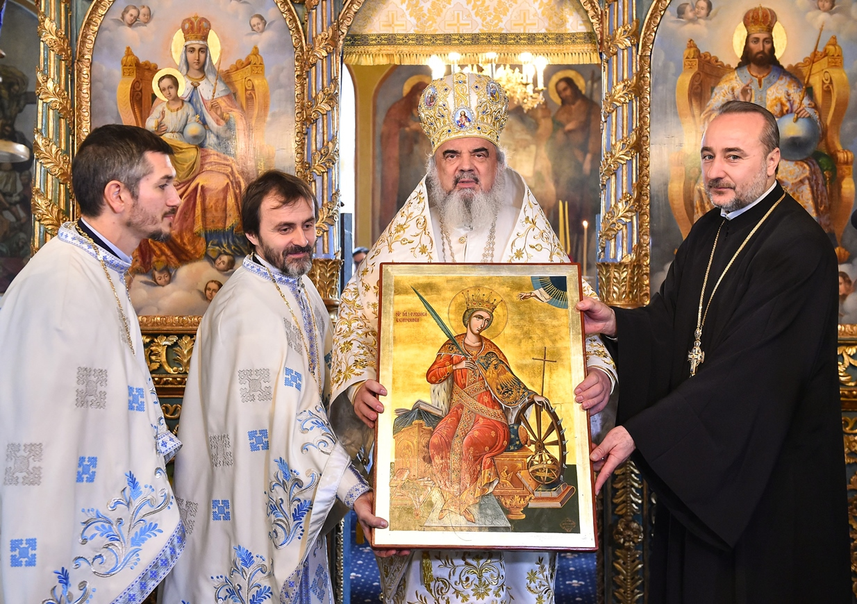 De asemenea, Întâistătătorul Bisericii Ortodoxe Române a dăruit mai multe obiecte de cult pentru lăcaşul de cult resfinţit astăzi, iar părintele paroh Georgian Păunoiu a dăruit Preafericirii Sale o icoană reprezentând pe Sfânta Ecaterina.