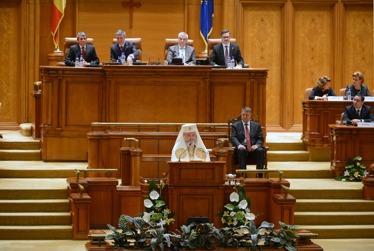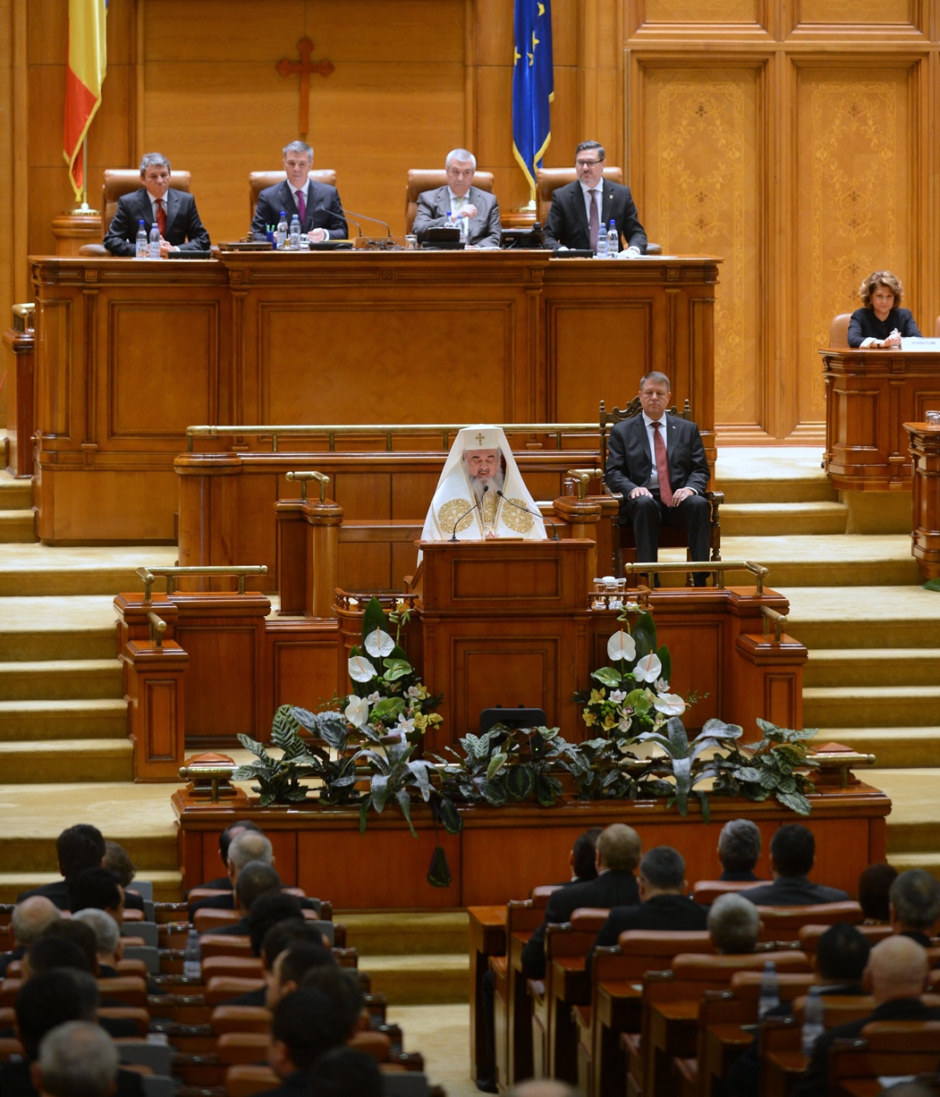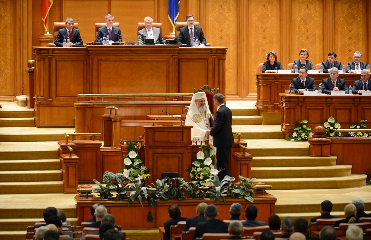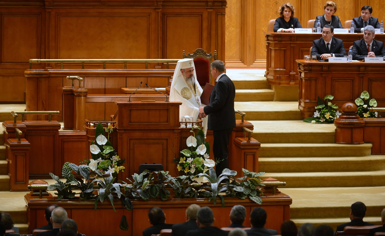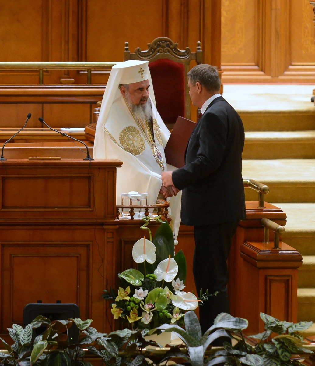 Preafericitul Părinte Daniel, Patriarhul României, s-a aflat astăzi, 21 decembrie 2014, la Palatul Parlamentului unde în faţa Camerelor reunite a avut loc ceremonia de învestire şi depunere a jurământului a Domnului Klaus Iohannis, noul Preşedinte al României.