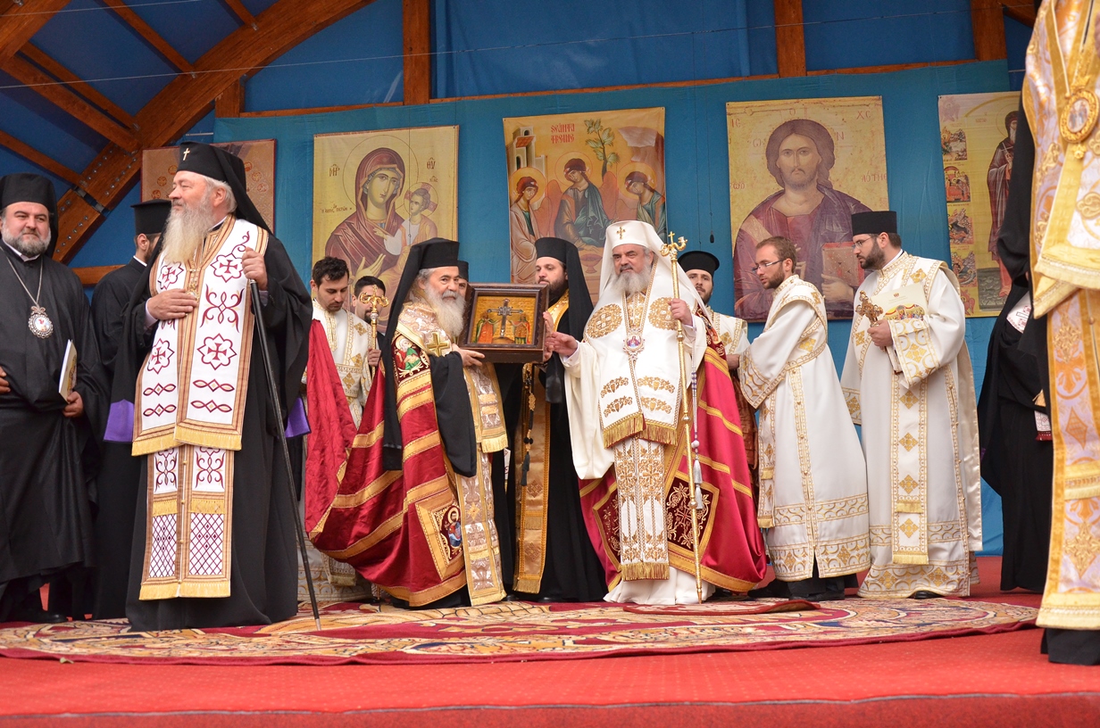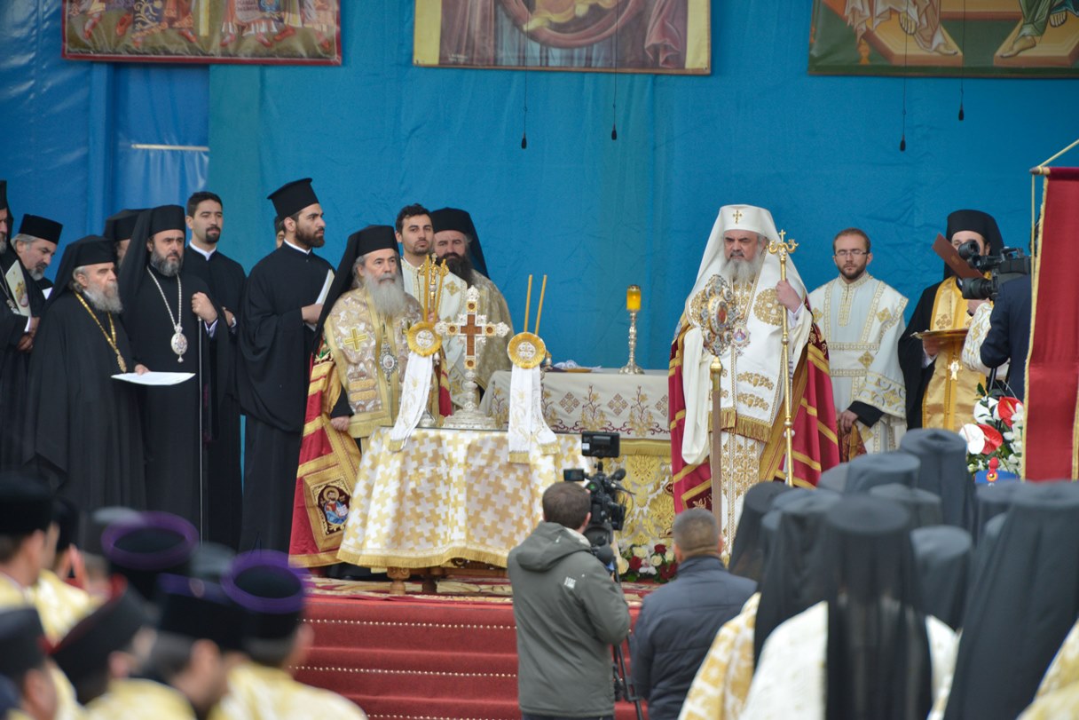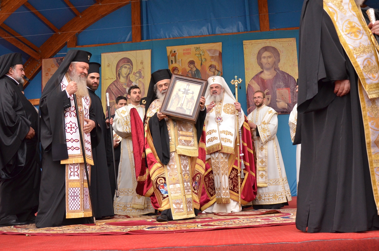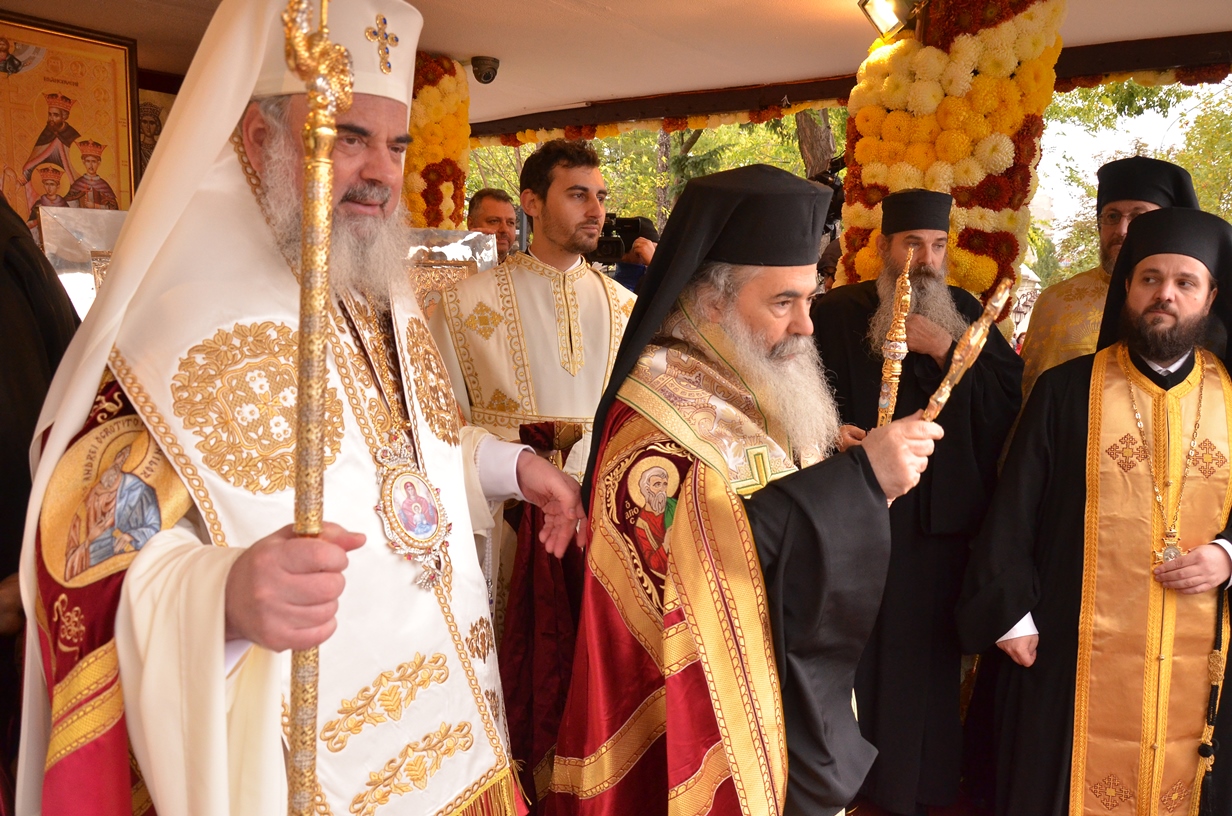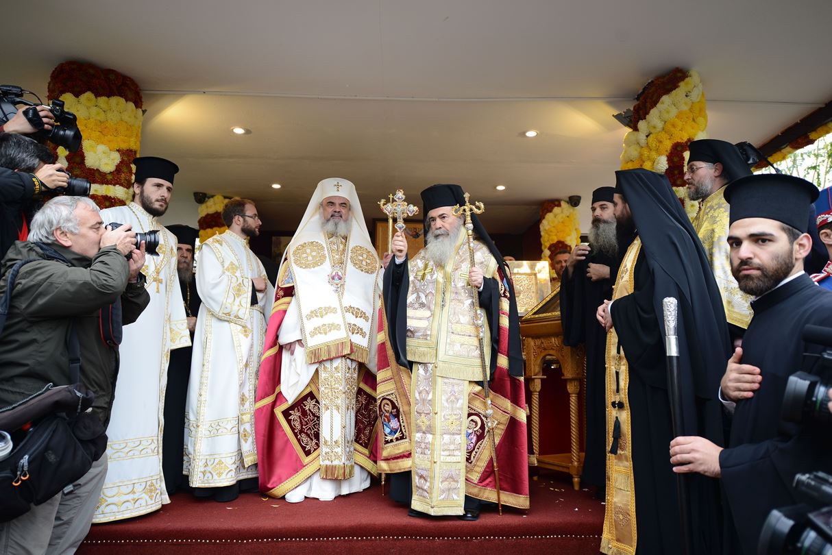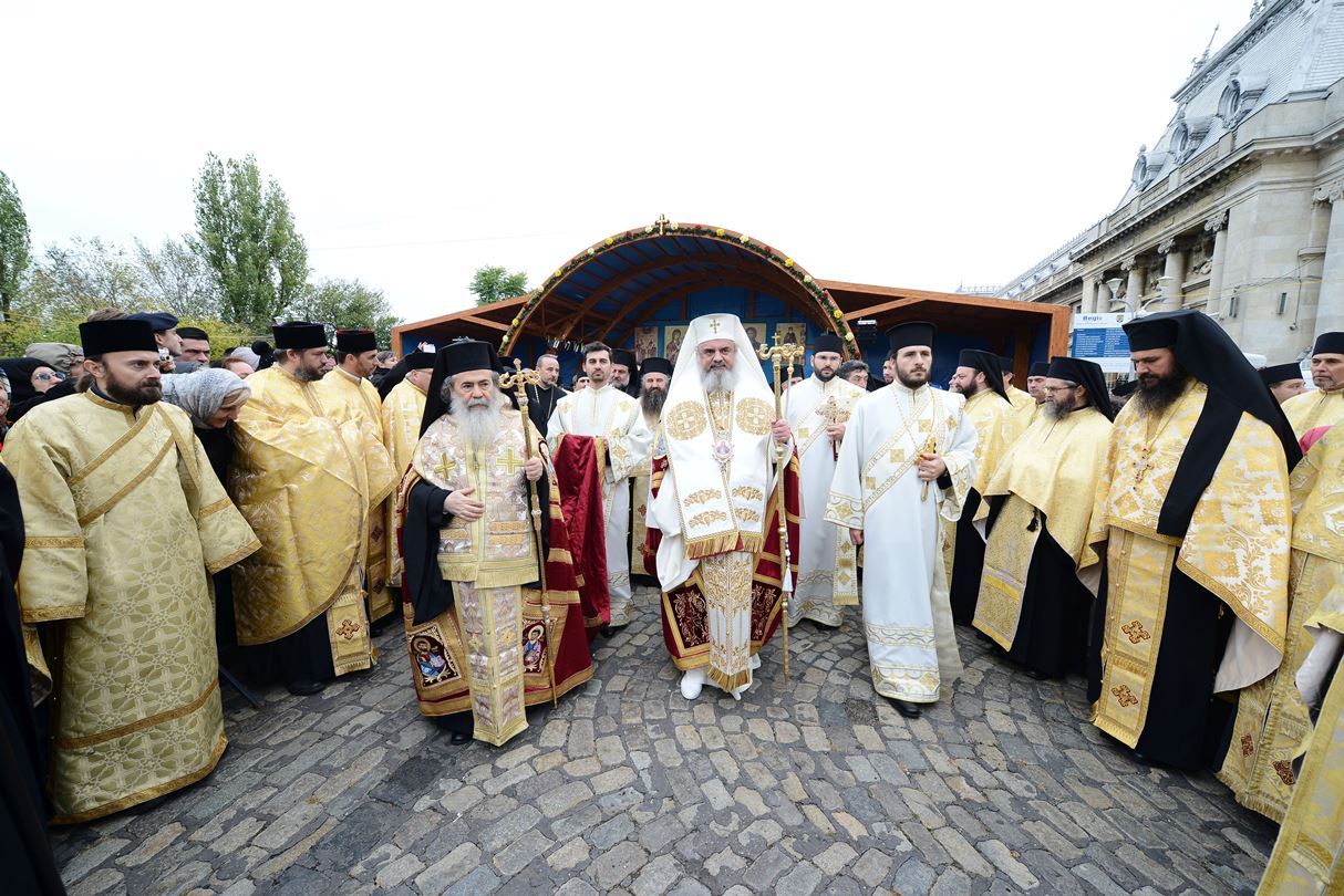 În continuare, Icoana în care se păstrează un fragment din Cinstitul Lemn al Sfintei Cruci, moaştele Sf. Voievod Martir Constantin Brâncoveanu şi ale Sfântului Dimitrie cel Nou şi ale Sfinţilor Împăraţi Constantin şi Elena, clerul şi pelerinii au fost întâmpinaţi de către Preafericitul Părinte Patriarh Daniel.