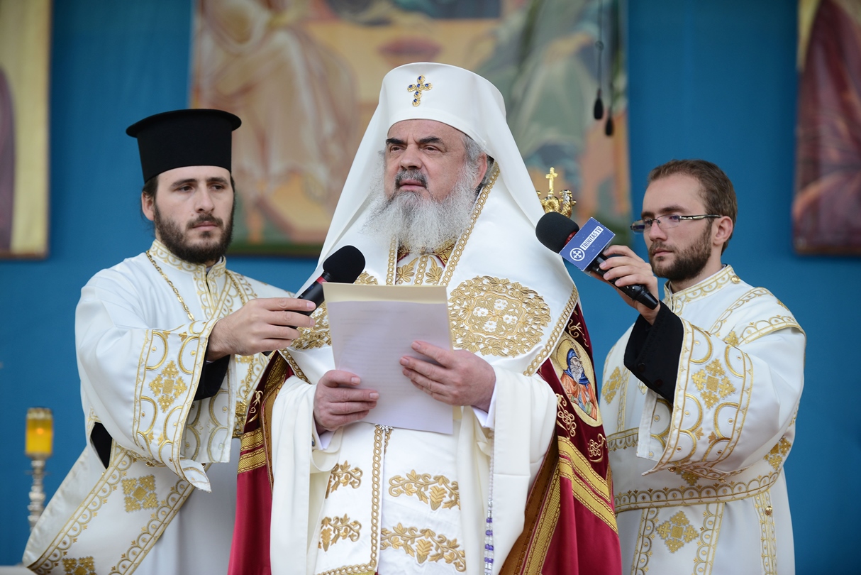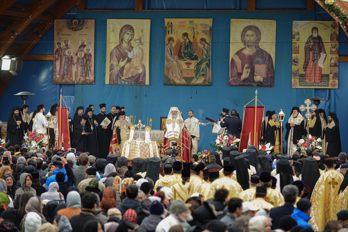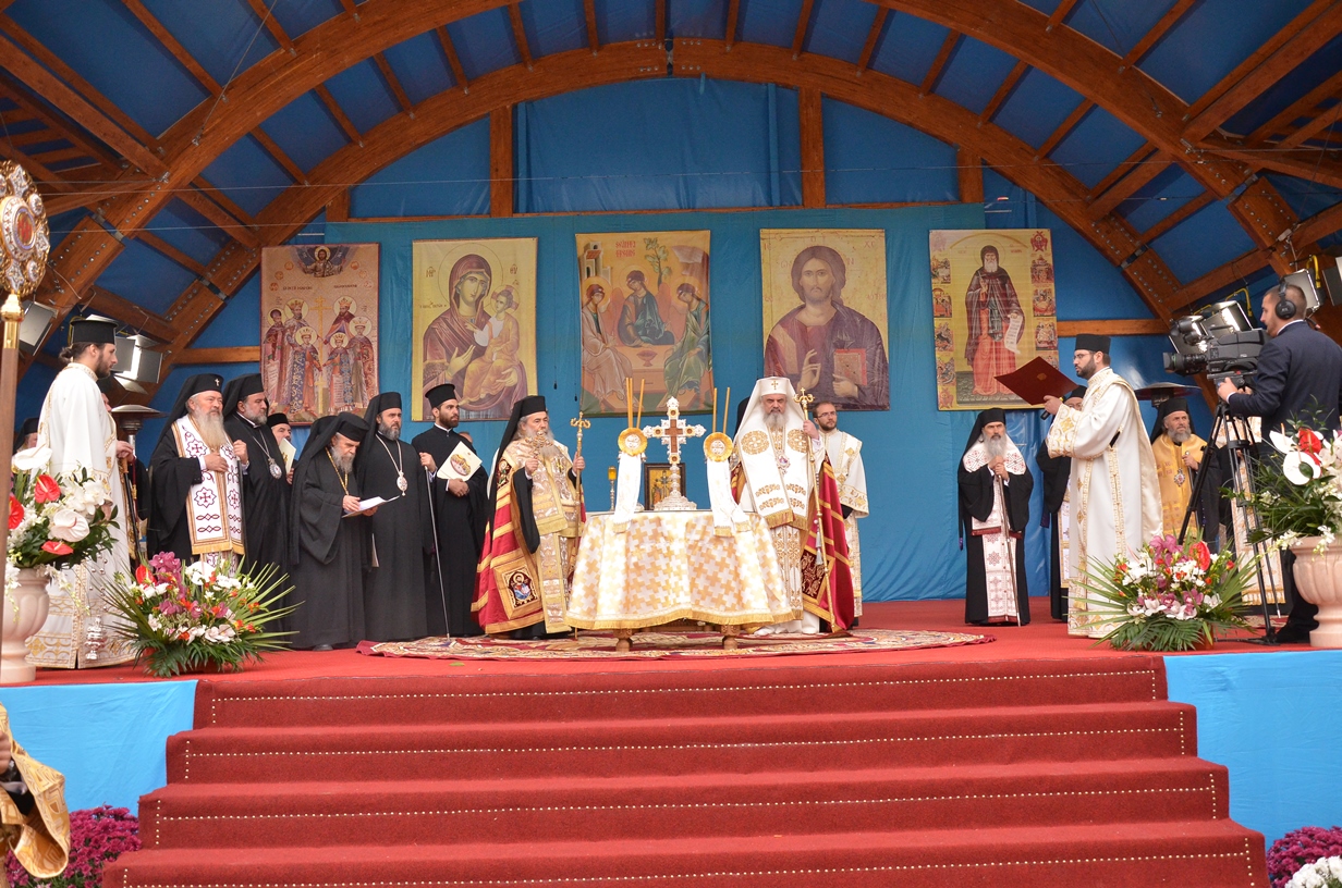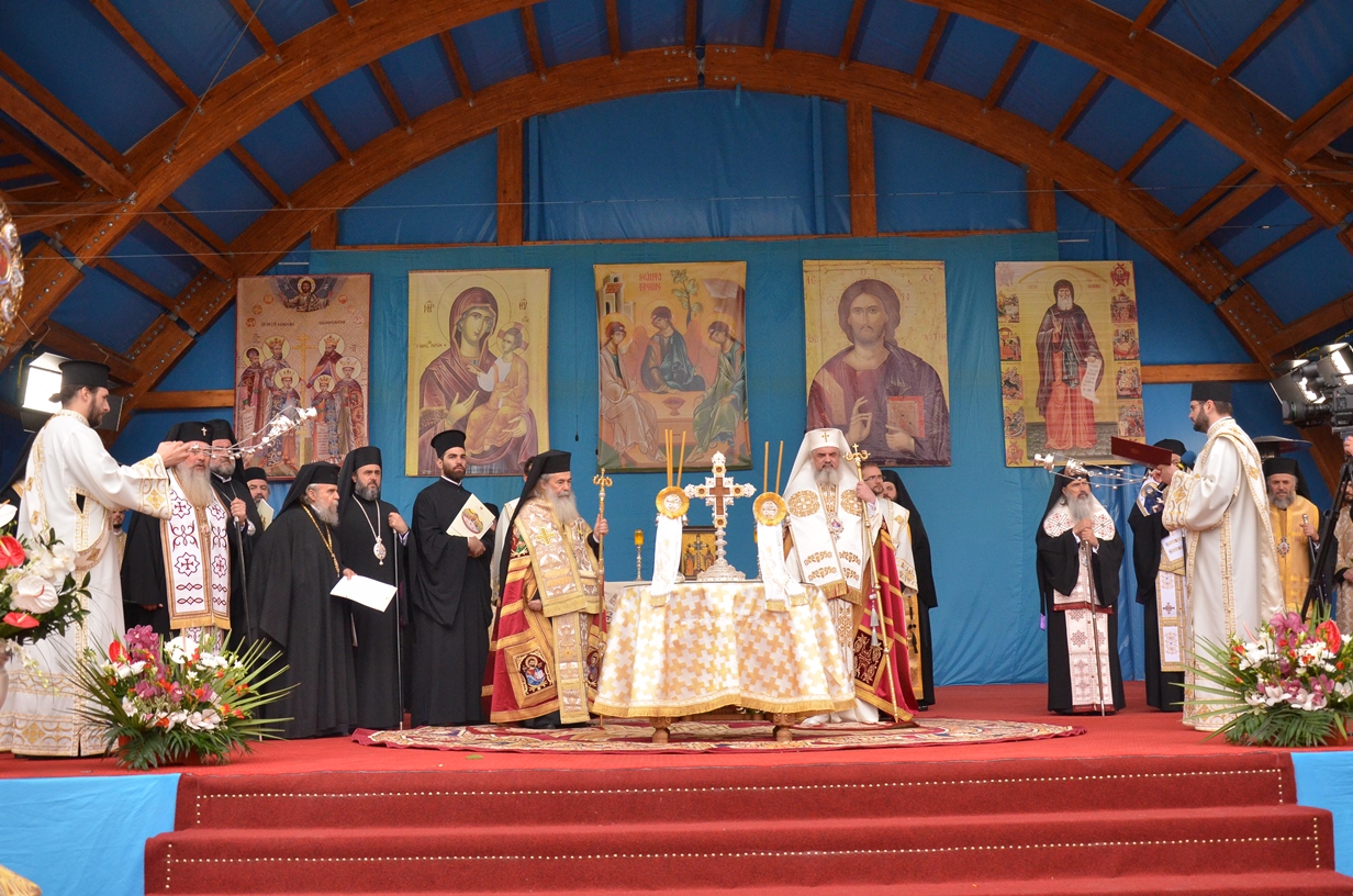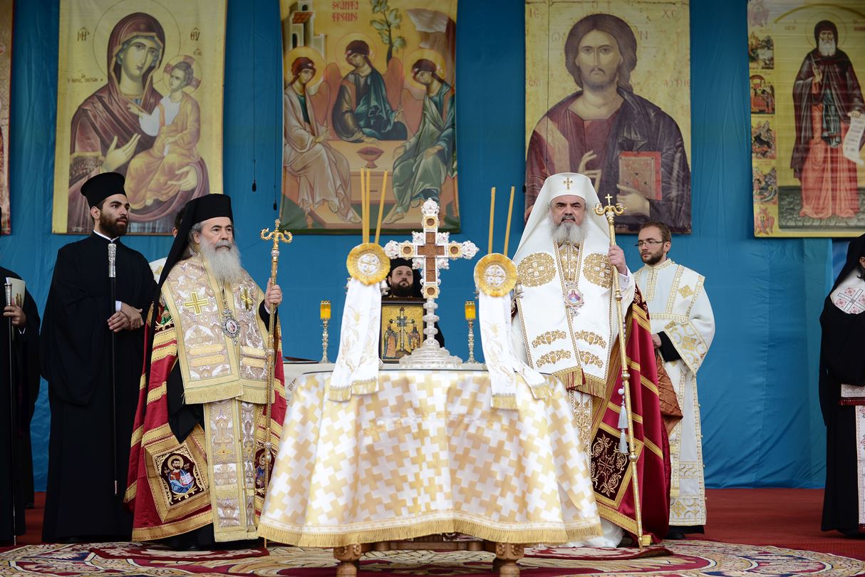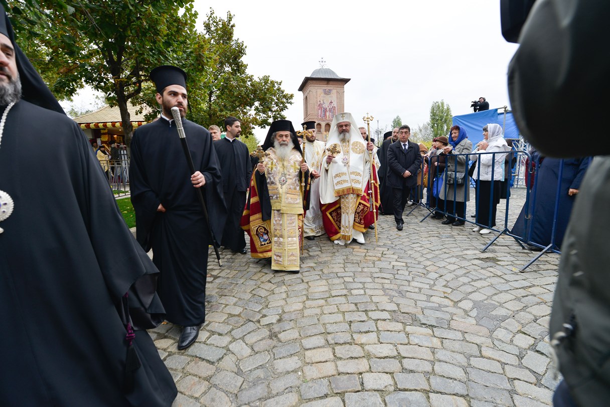 În continuare, Icoana în care se păstrează un fragment din Cinstitul Lemn al Sfintei Cruci, moaştele Sf. Voievod Martir Constantin Brâncoveanu şi ale Sfântului Dimitrie cel Nou şi ale Sfinţilor Împăraţi Constantin şi Elena, clerul şi pelerinii au fost întâmpinaţi de către Preafericitul Părinte Patriarh Daniel.