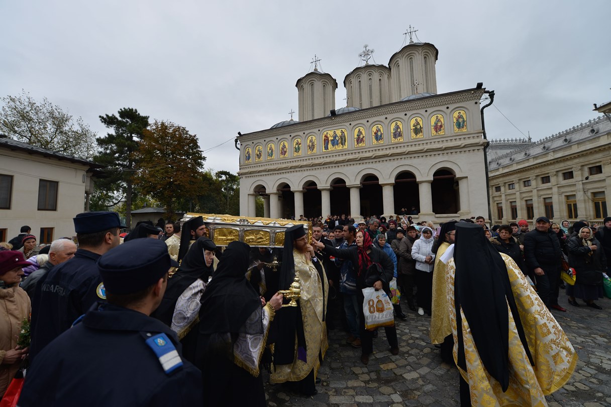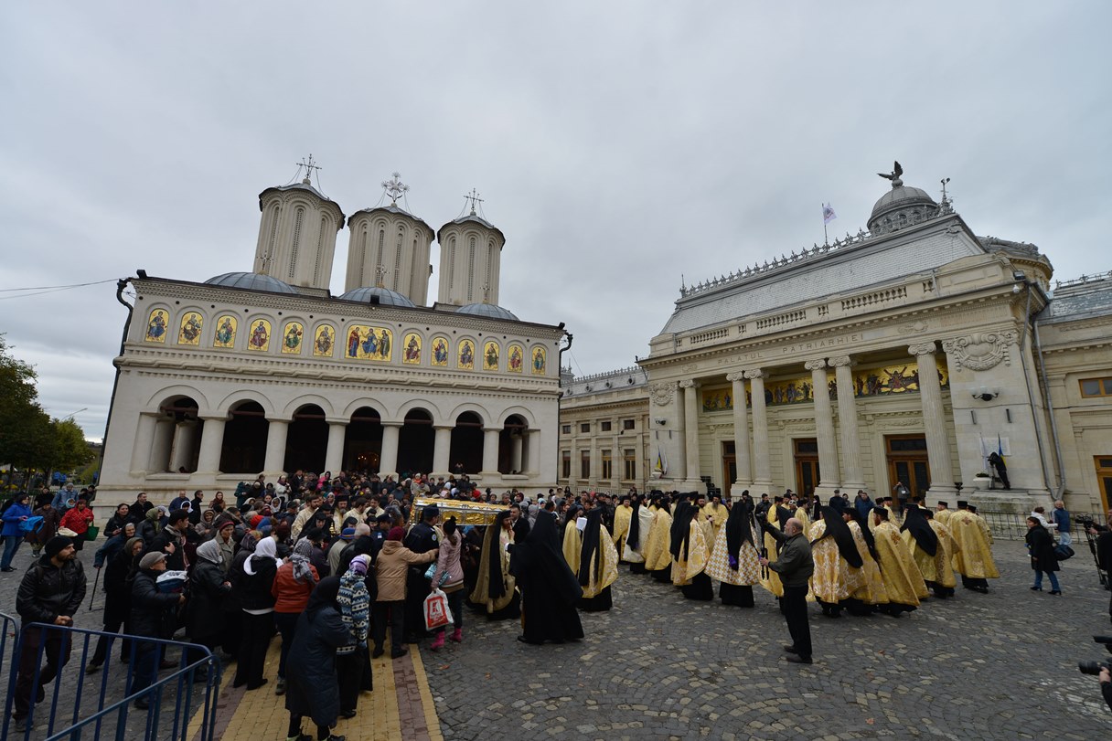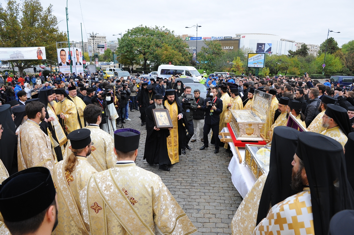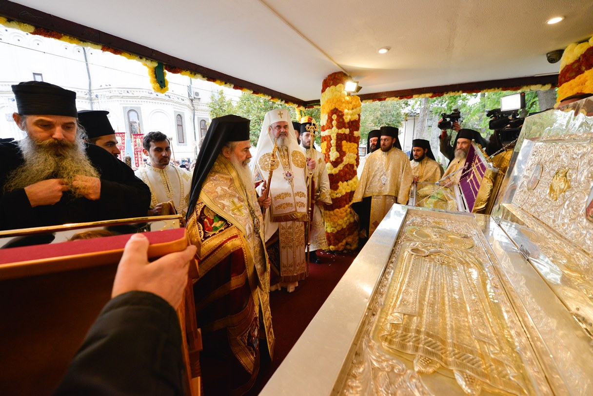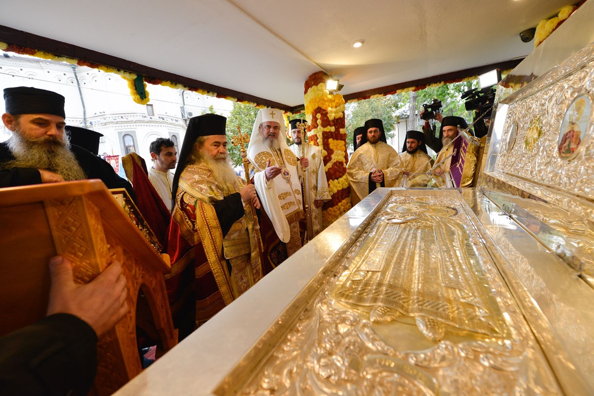 Apoi, icoana şi sfintele moaşte au fost aşezate spre închinare în baldachinul amenajat pe esplanada Catedralei Patriarhale pentru a fi venerate de către cler şi credincioşi până în ziua de luni, 27 octombrie 2014.
