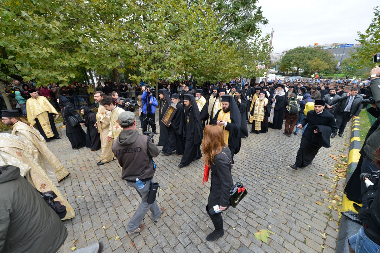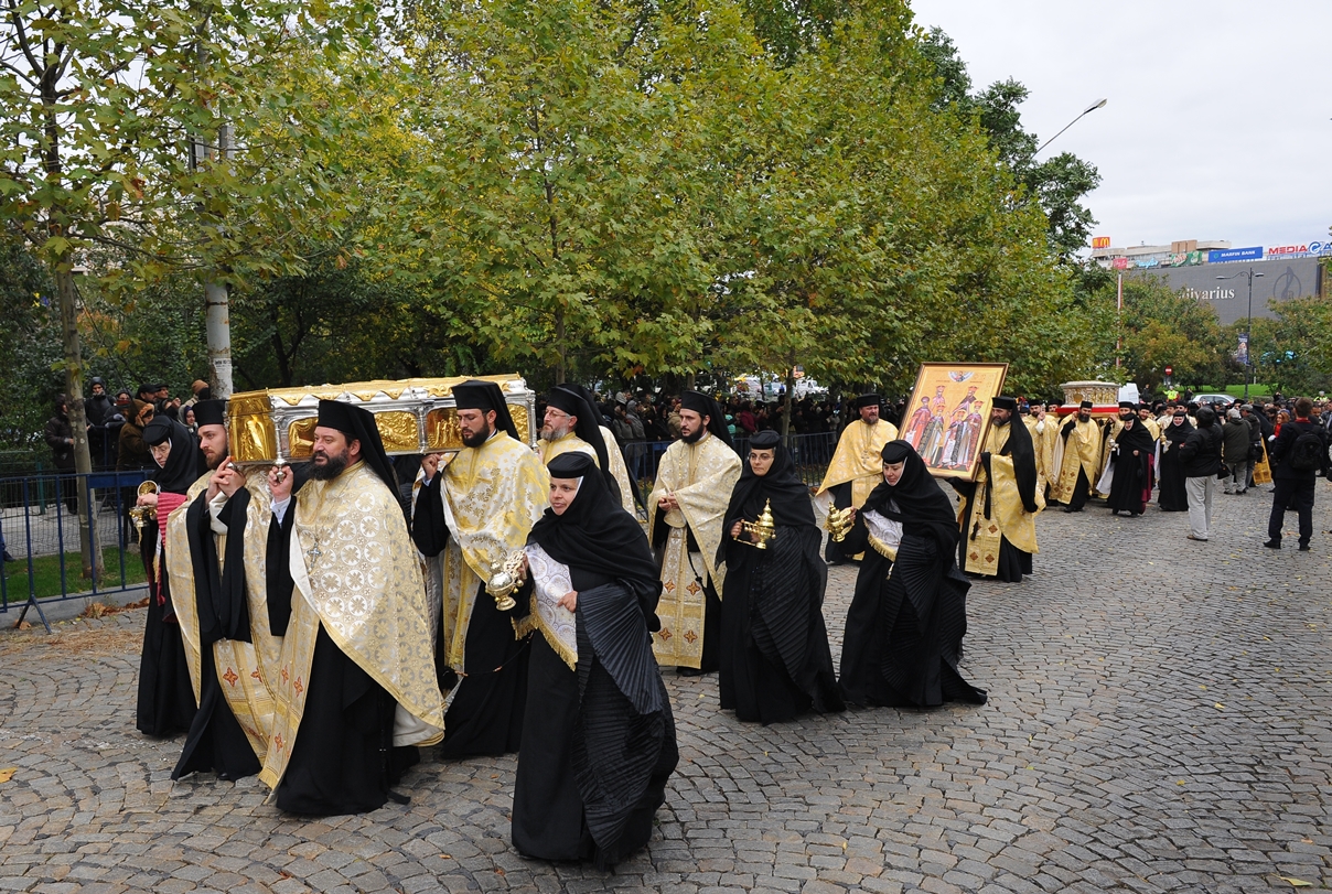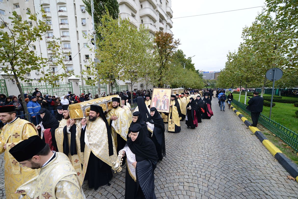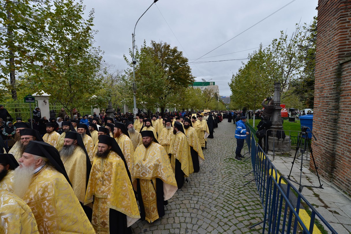 Începând cu ora 12:50 au pornit două procesiuni simultan. Procesiunea cu racla purtând moaştele Sfântului Cuvios Dimitrie cel Nou a pornit de la Catedrala Patriarhală spre biserica Sfântul Nicolae – Vlădica pe Bulevardul Regina Maria mergând până la baza Colinei Bucuriei.