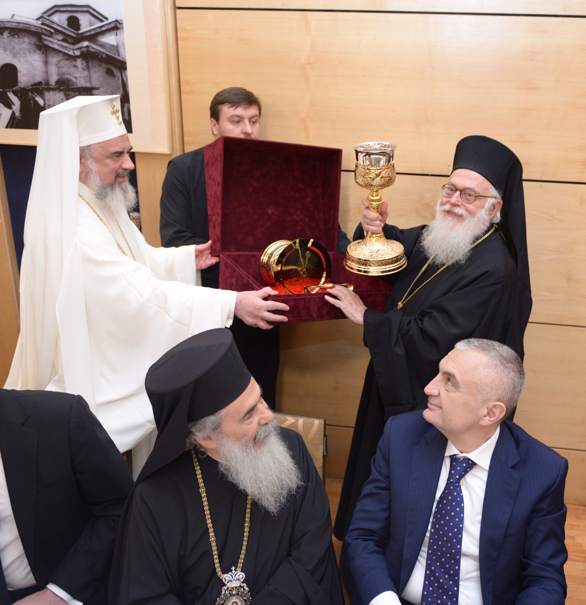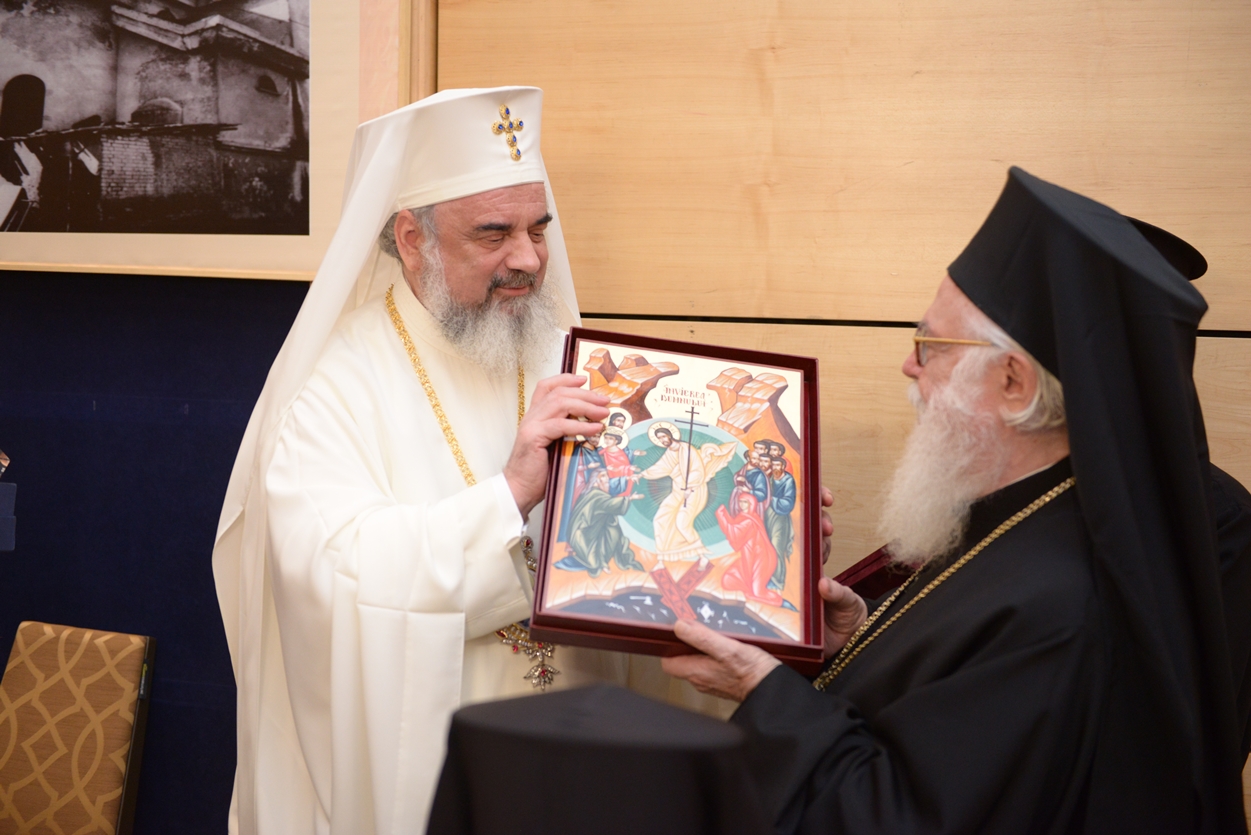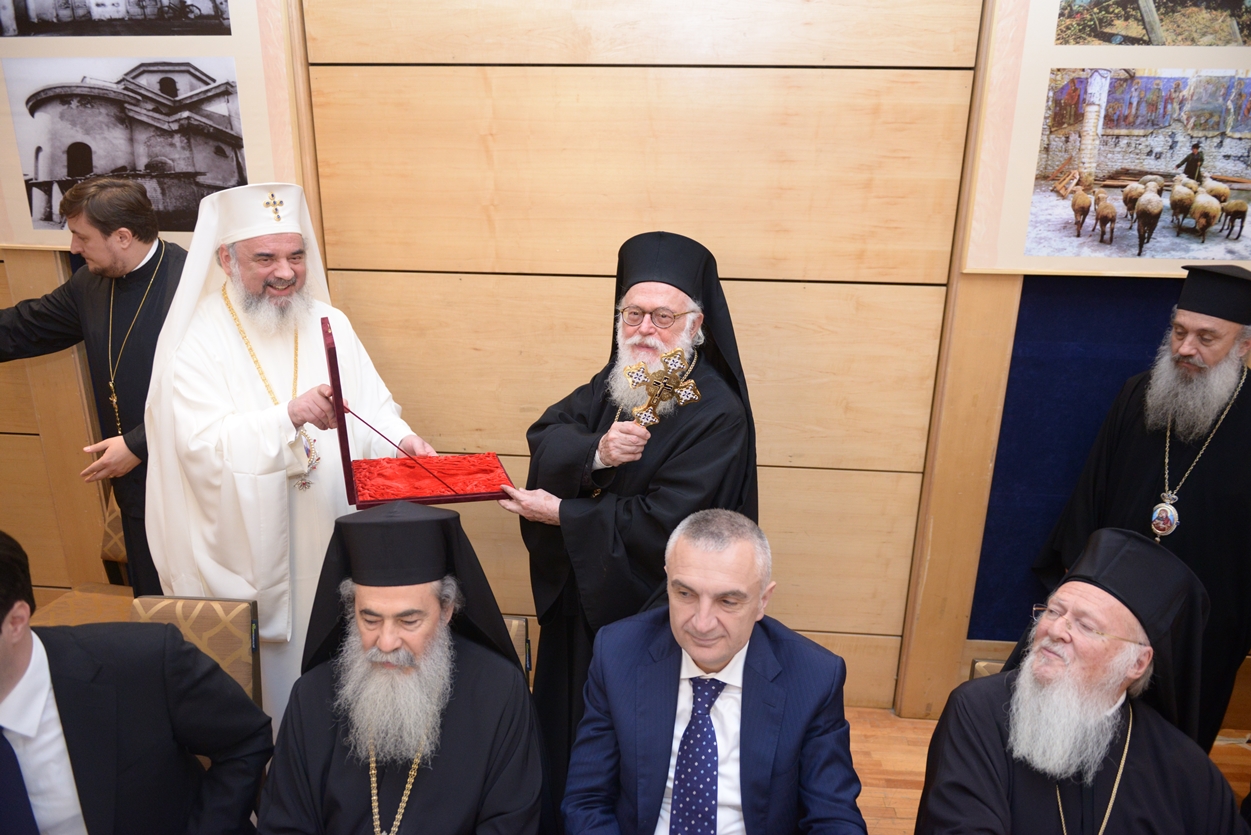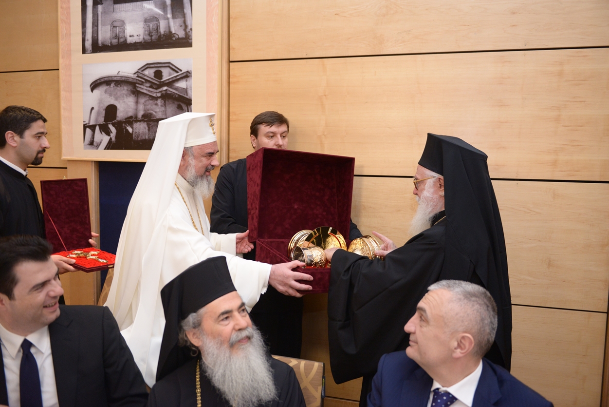 La final, Patriarhul României i-a oferit Întâistătătorului Bisericii Ortodoxe a Albaniei un set de sfinte vase pentru Catedrală, o cruce de binecuvântare și o icoană cu Învierea Domnului.