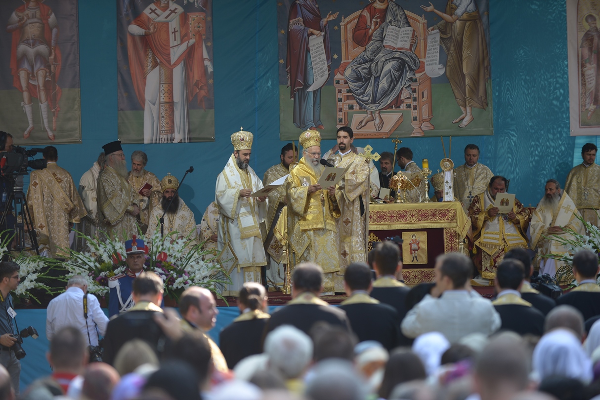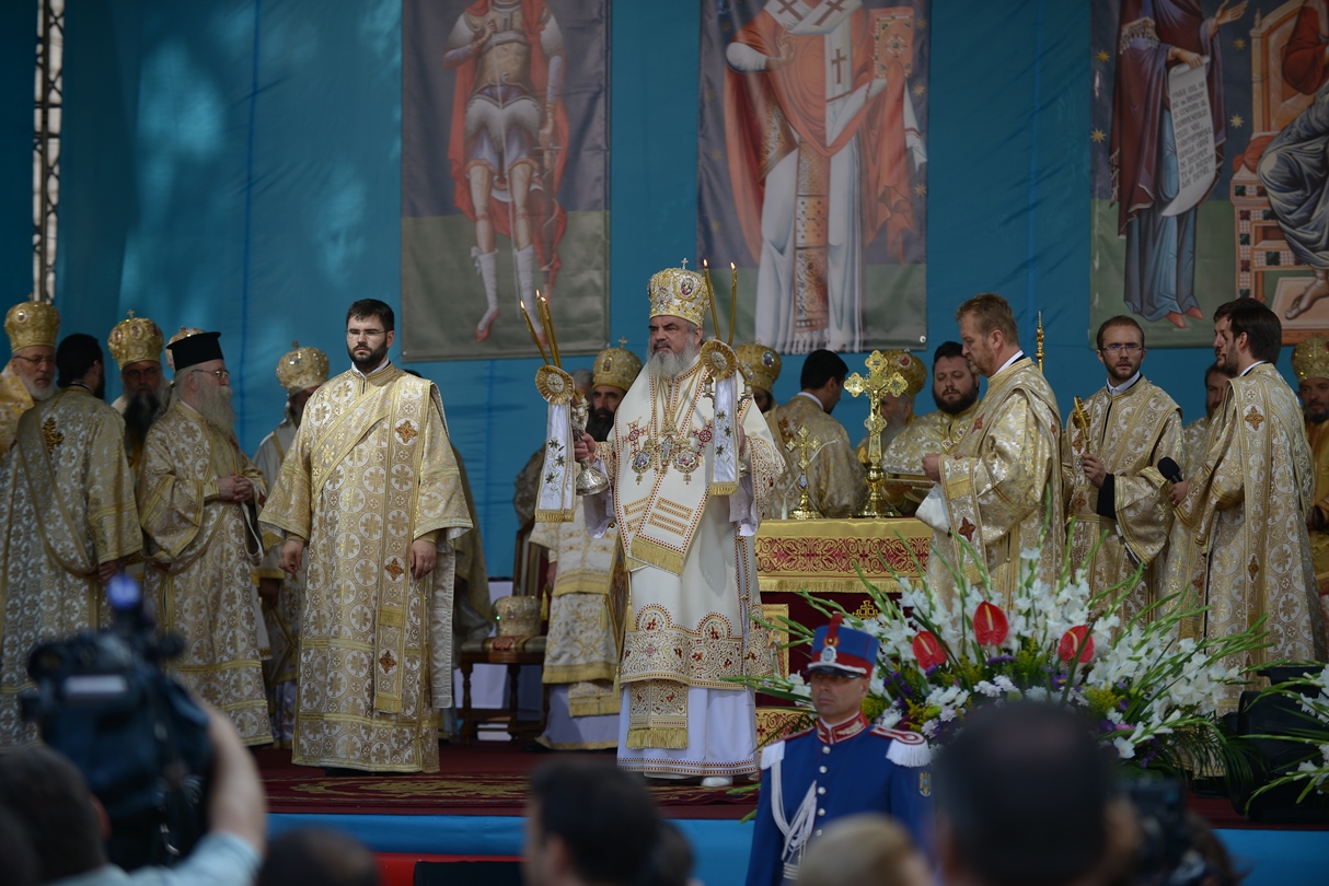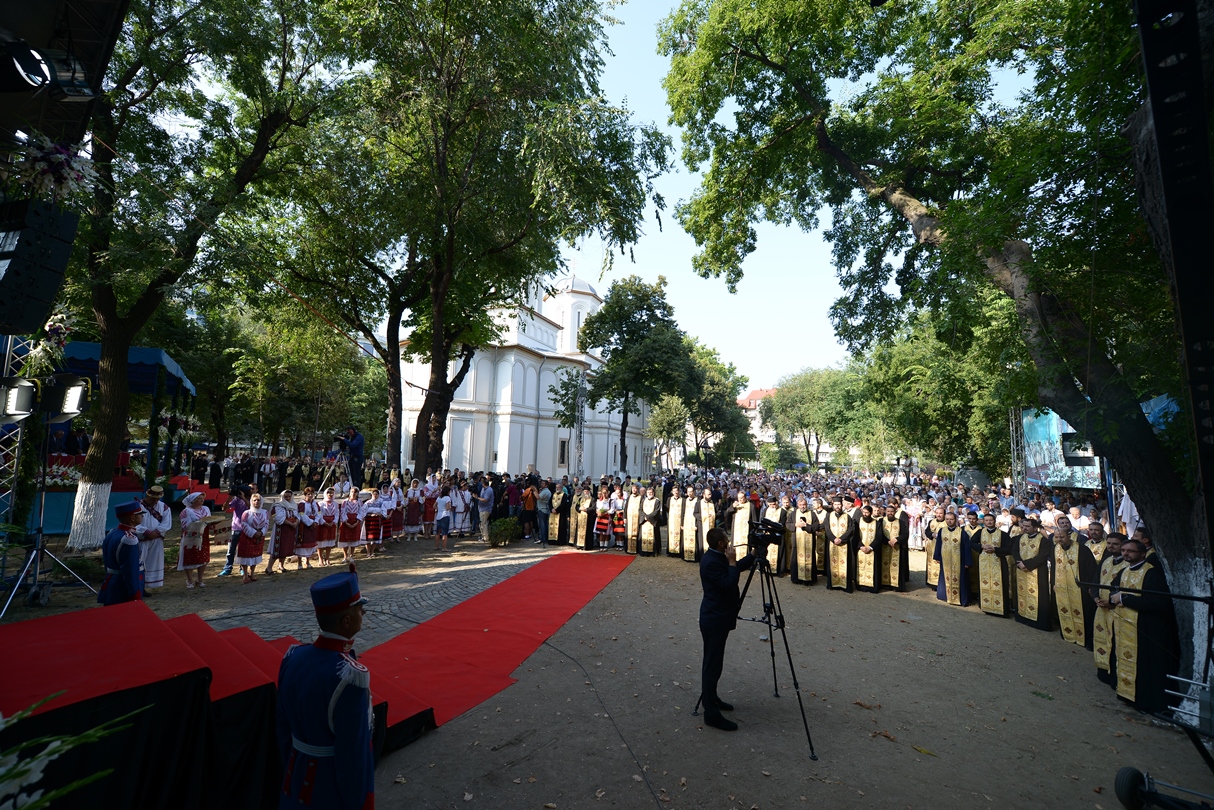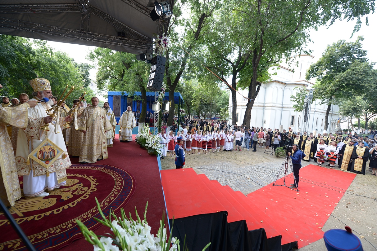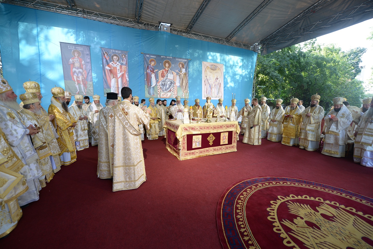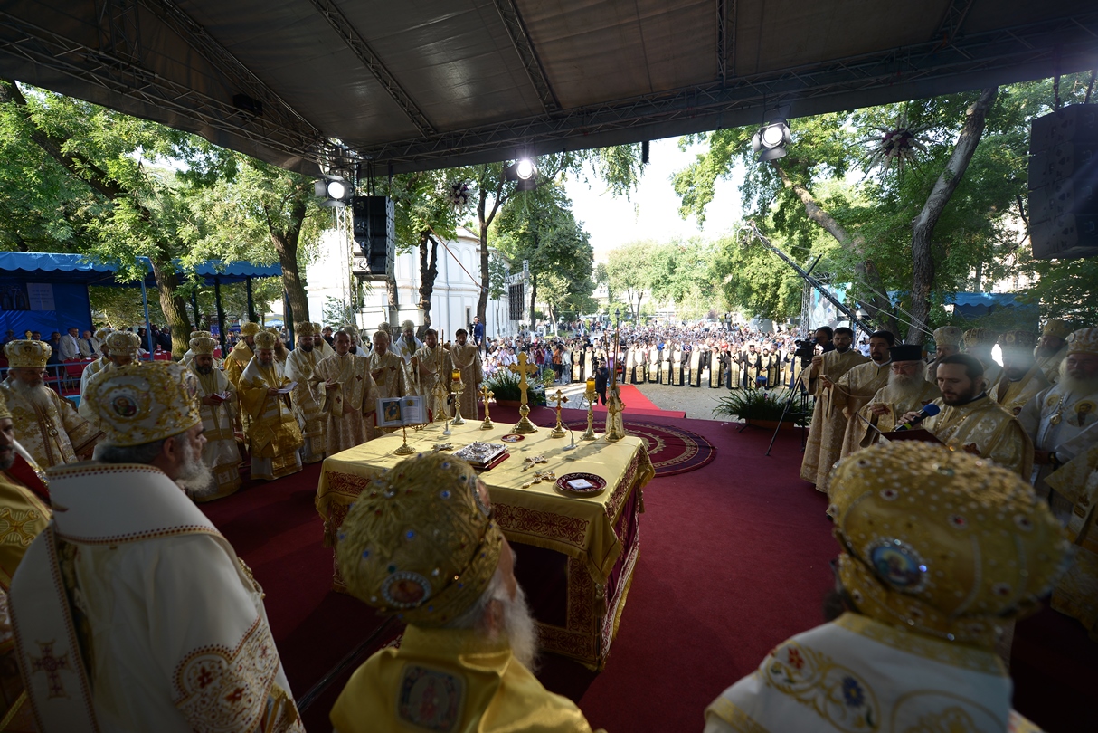 În continuare, de la orele 9.30, Întâistătătorul Bisericii Ortodoxe Române a oficiat Sfânta Liturghiepe un podium special amenajat lângă biserica Sfântul Gheorghe Nou.