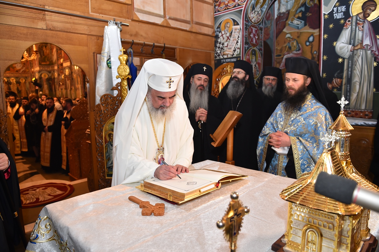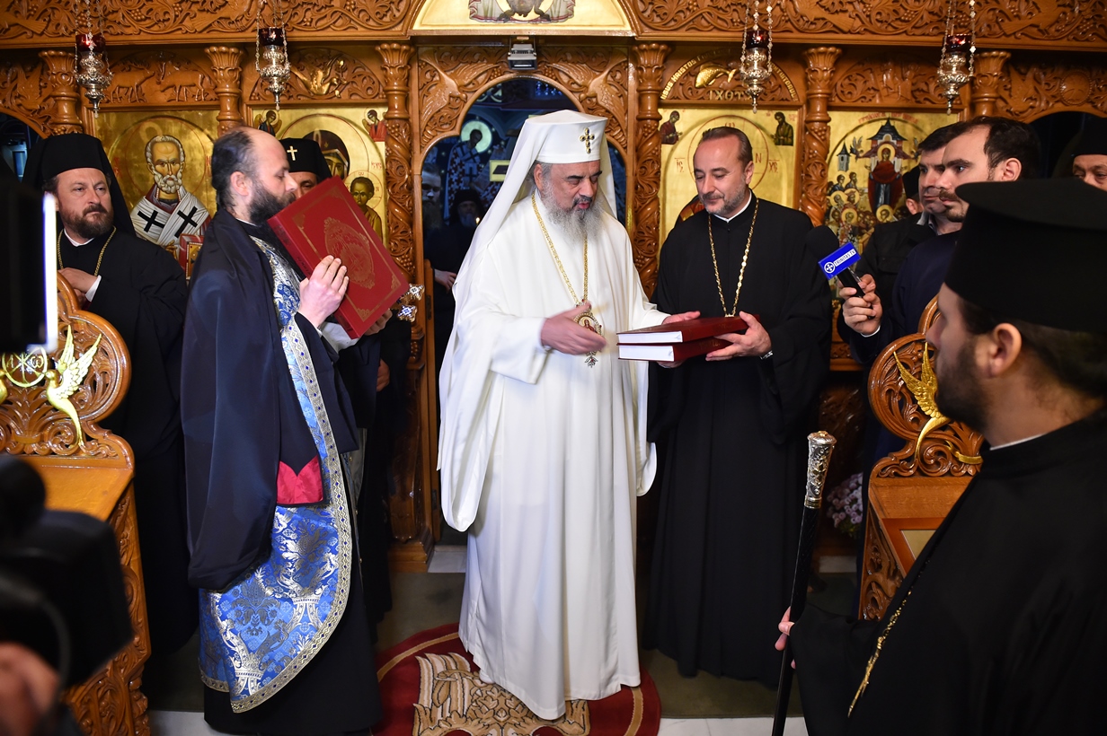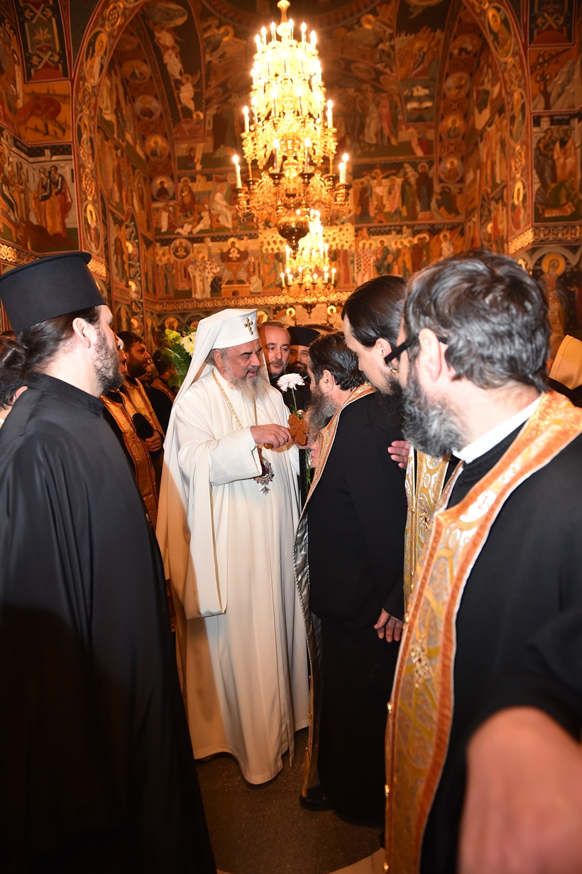 În cuvântul său, Patriarhul României l-a felicitat pe părintele stareţ, arhimandritul Ioan Harpa, dimpreună cu obştea mănăstirii pentru lucrările efectuate în cadrul aşezământului monahal. Apoi, Întâistătătorul Bisericii Ortodoxe Române a dăruit părintelui stareţ, pentru biserica mănăstirii, o cruce de binecuvântare, precum şi mai multe cărţi liturgice şi de folos duhovnicesc. Totodată, Patriarhul României a dăruit credincioşilor prezenţi iconiţe reprezentând pe Maica Domnului.